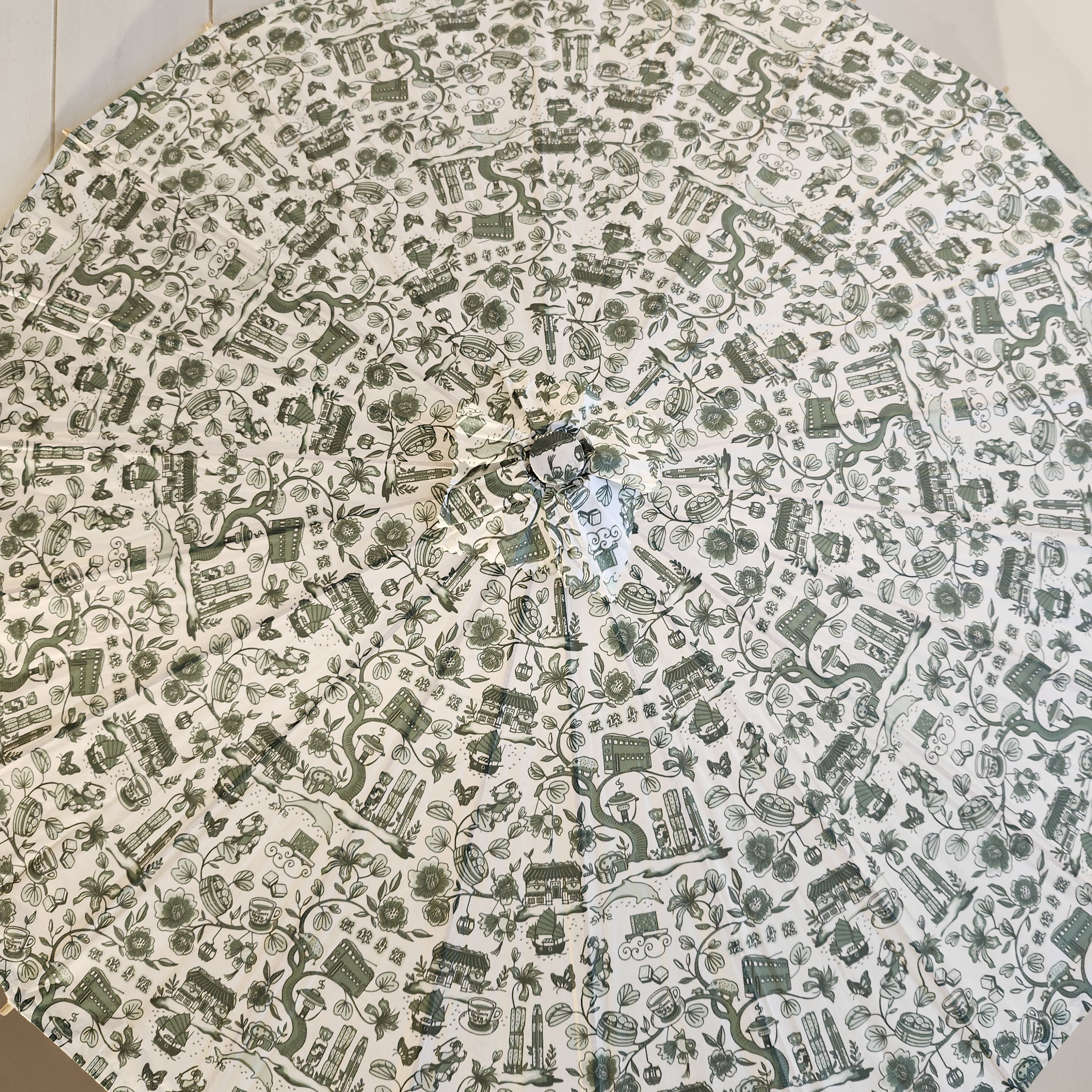 A paper parasol in Mariko Jesse's iconic Hong Kong Toile pattern in green and white. Could be used as a parasol, only if the weather is guaranteed to be dry, or as a lovely decorative accent.
