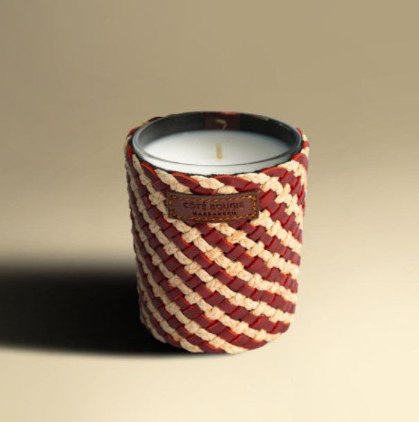 A scented candle with a rose oudh fragrance, dressed in handwoven raffia and leather.