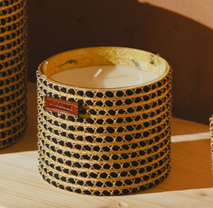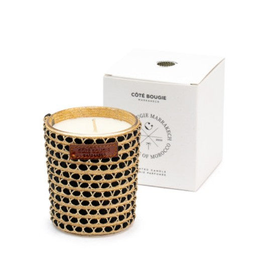 This candle is finished in Sabra, or Cactus Silk, in black and gold, which has been beautifully crafted by hand in Morocco. The candle is scented with an incense fragrance.