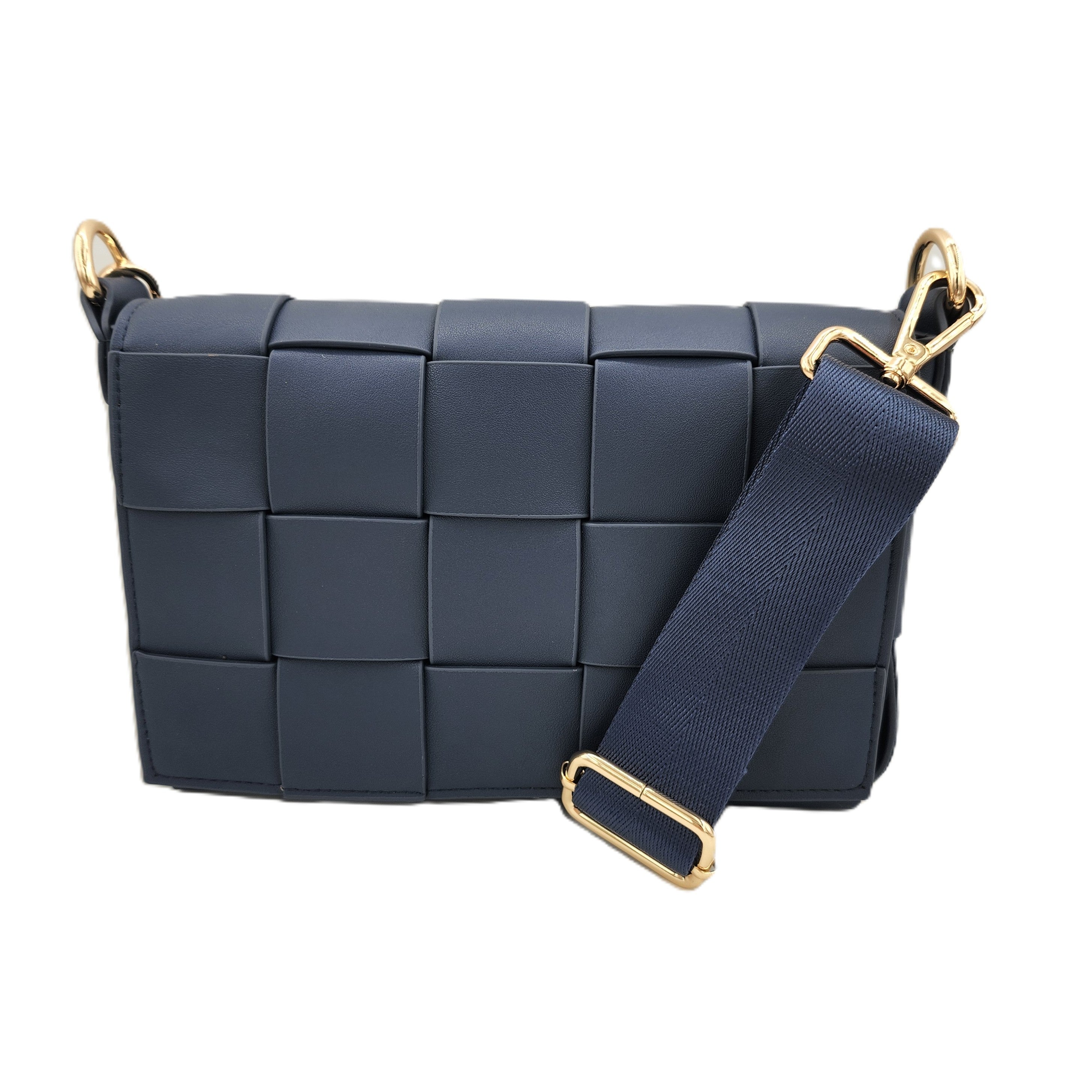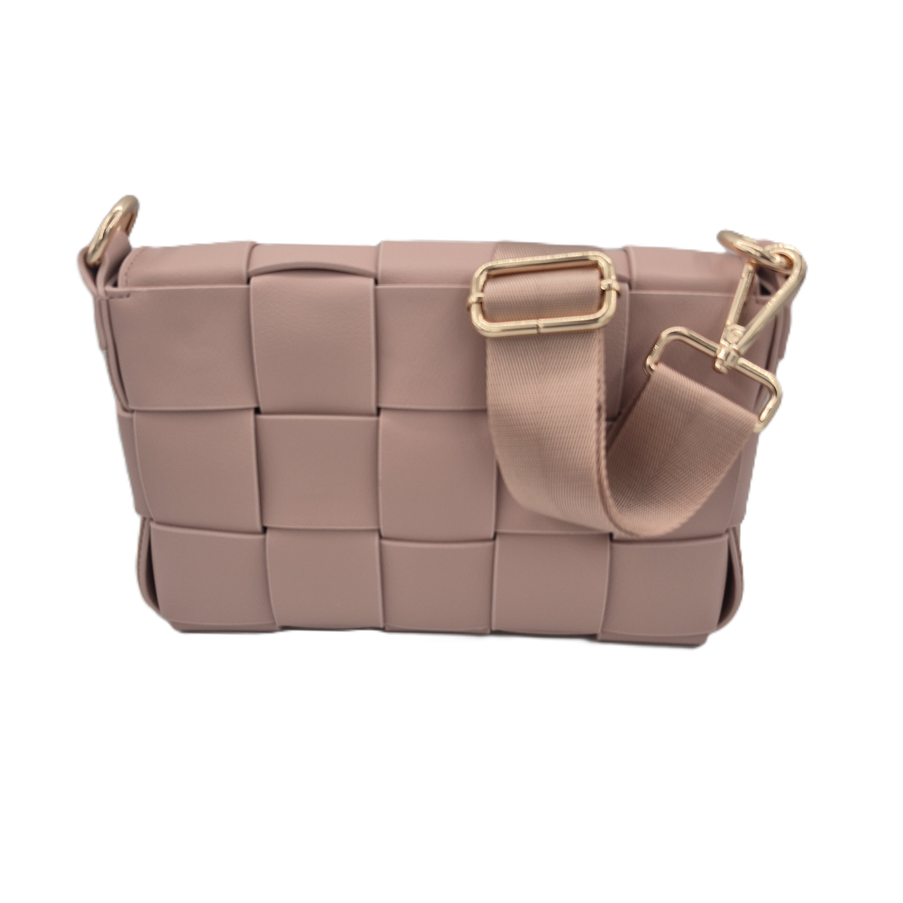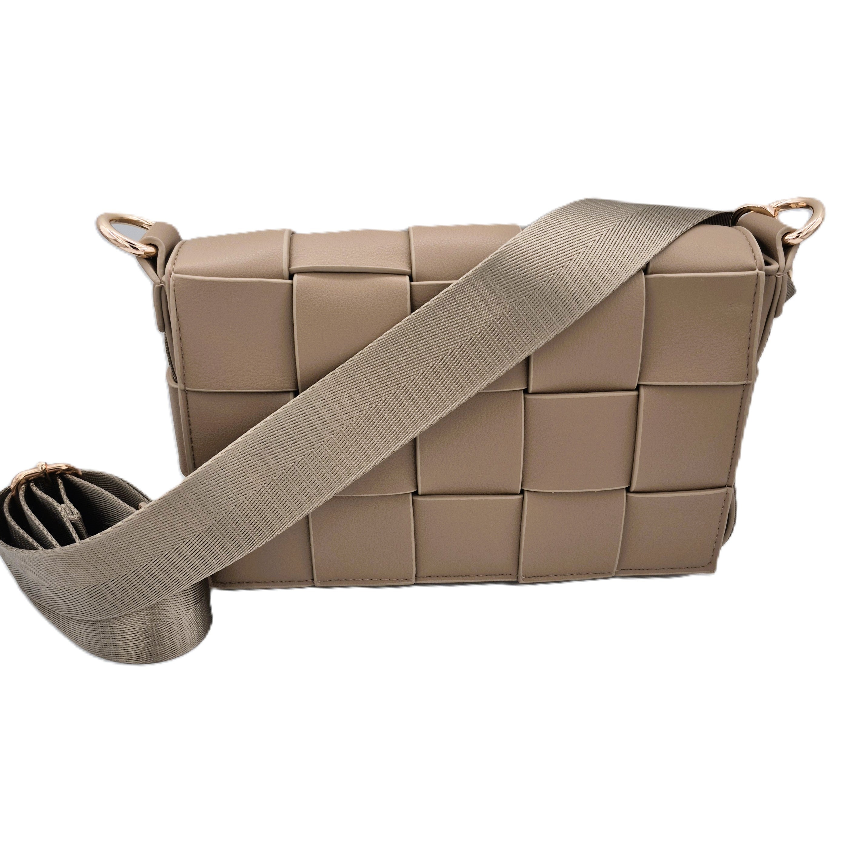An elegant, smaller braided shoulder bag that closes with hidden magnets. Two detachable shoulder straps are included, an adjustable wider strap in nylon, and a slimmer one in the same material as the bag.  Inside, there is a detachable pouch for storing money or credit cards.