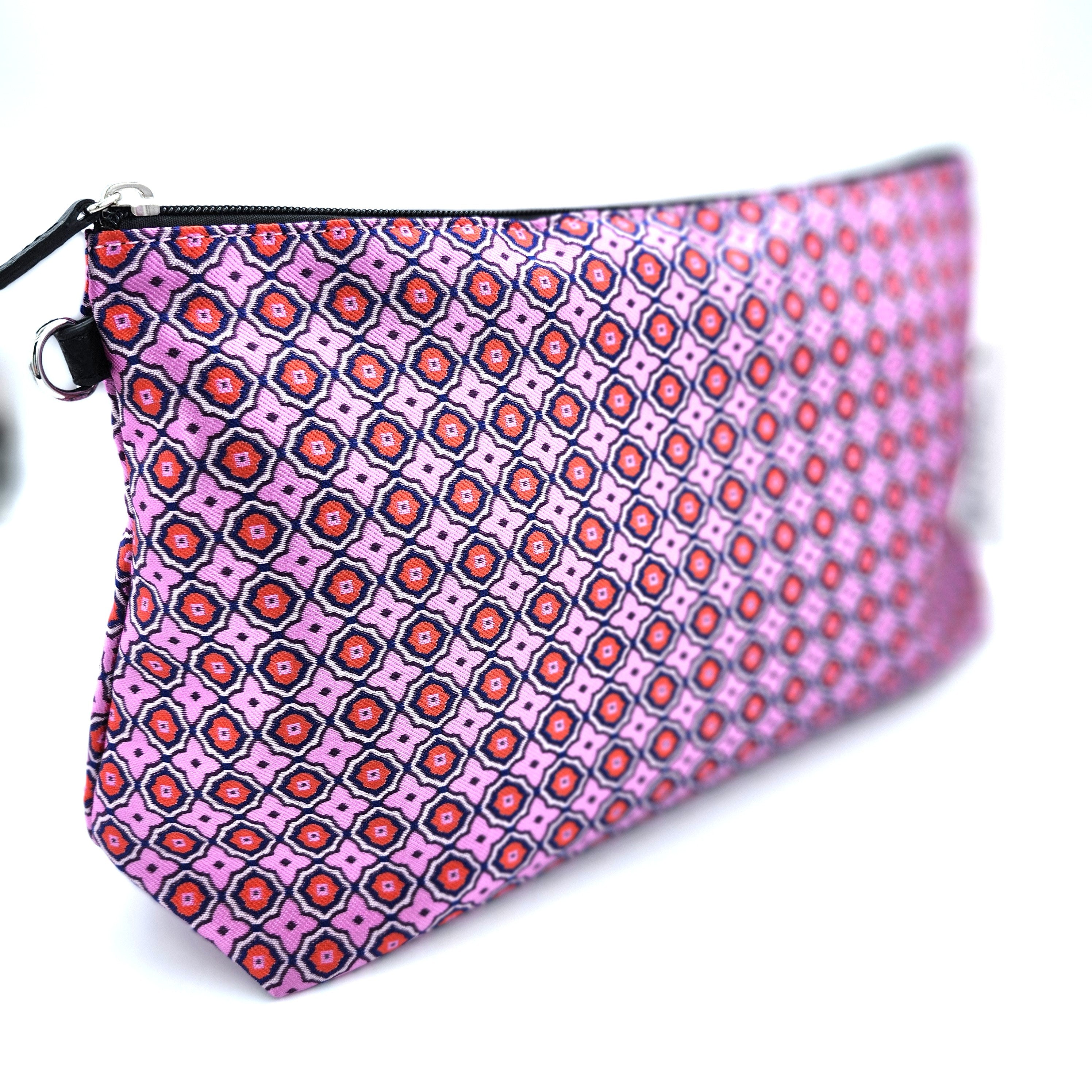 The dazzling Artist Mosaic cosmetic bag in pink is suitable for make-up or traveling. The bag is lined in black easy-to-clean polyester, and has a zip closed inner compartment.