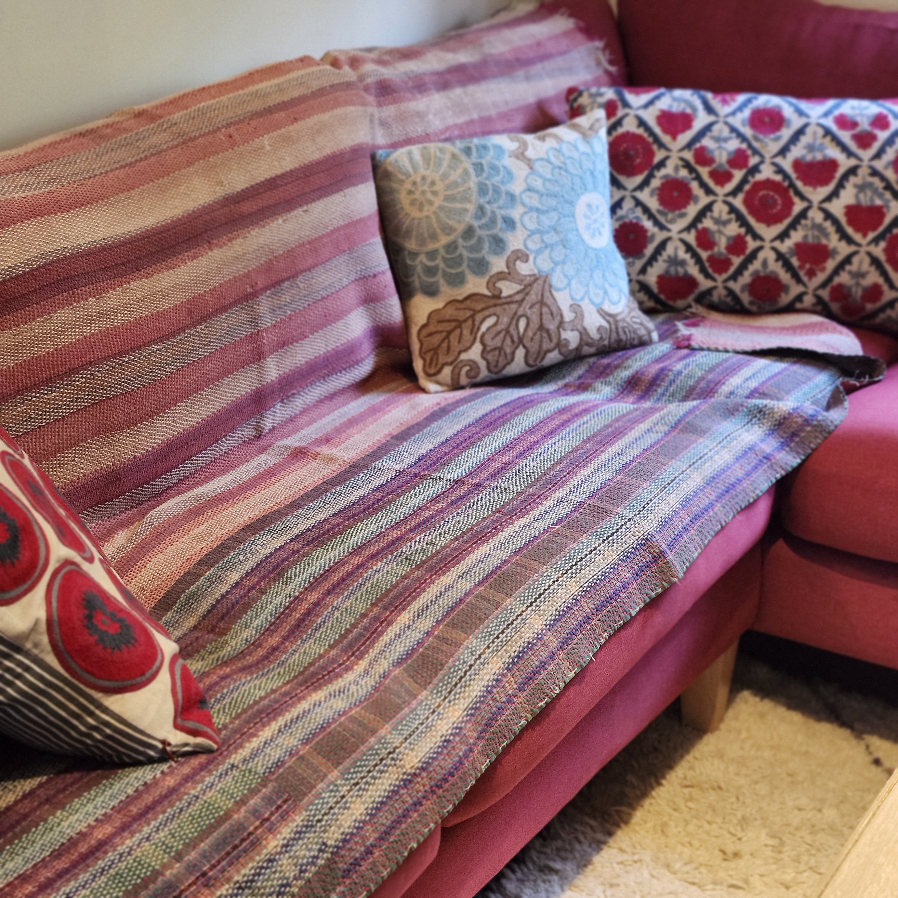 By design, these are hardwearing pieces of textile, although they generally feel quite soft. They could be used as a quilt, throw, or a table covering, or even as a rug in a low traffic area, such as a bedroom.