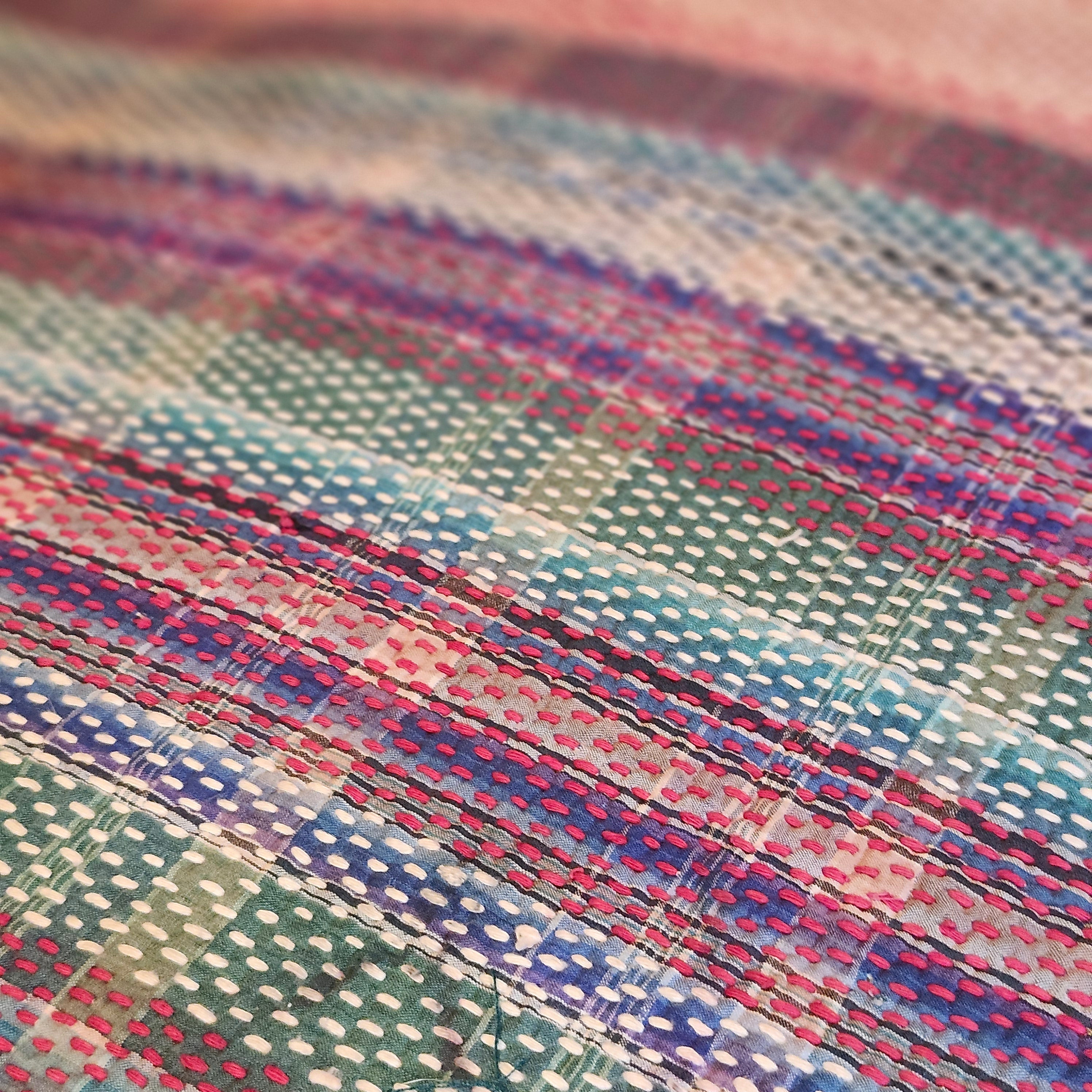 Kantha is a type of quilt, made without padding, but by sewing together layers of cloth, usually with a running stitch. It is a centuries-old tradition, originating in Bengal, and was a way to recycle old cloth, typically saris, but also as a form of artistic expression, with each piece reflecting the skill and taste (or not!) of its maker.