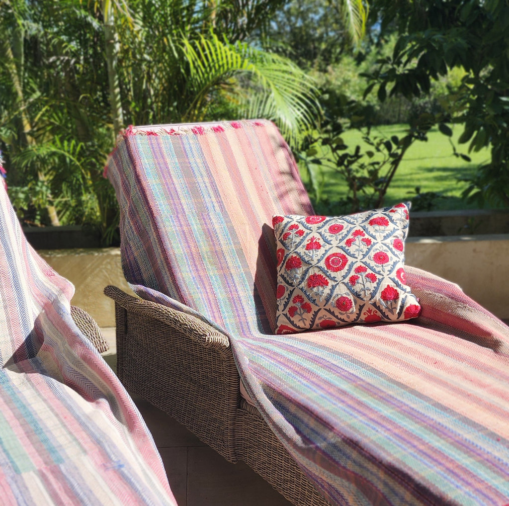 They can be washed, and one would imagine that over the course of their lifetime, each piece of fabric has been washed dozens of times before becoming part of the kantha. Nonetheless, we would avoid the use of bleach, harsh detergents and hot water.