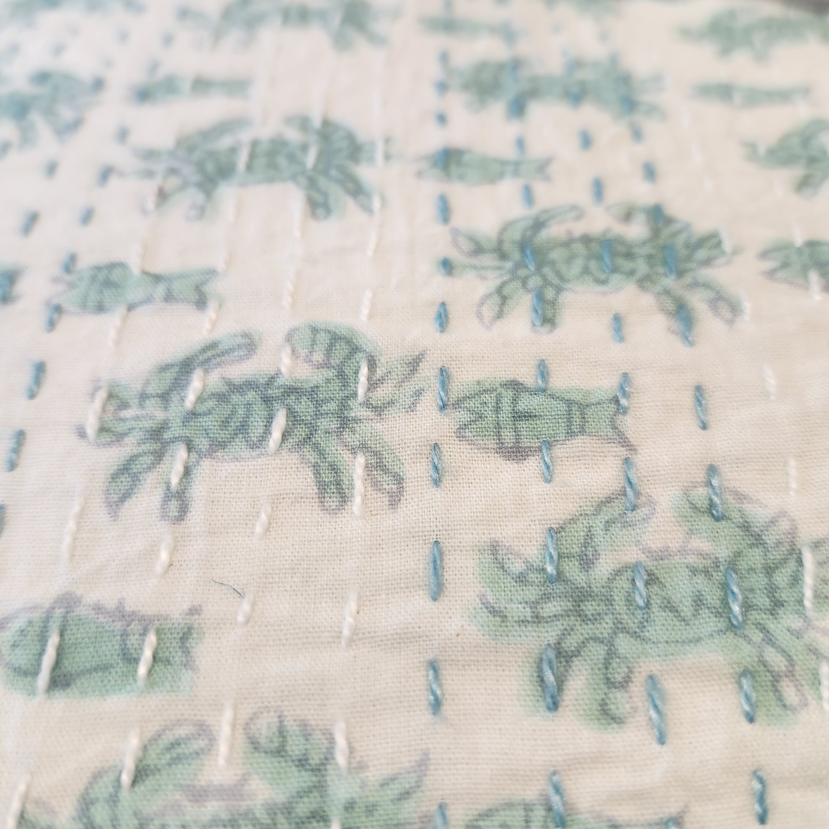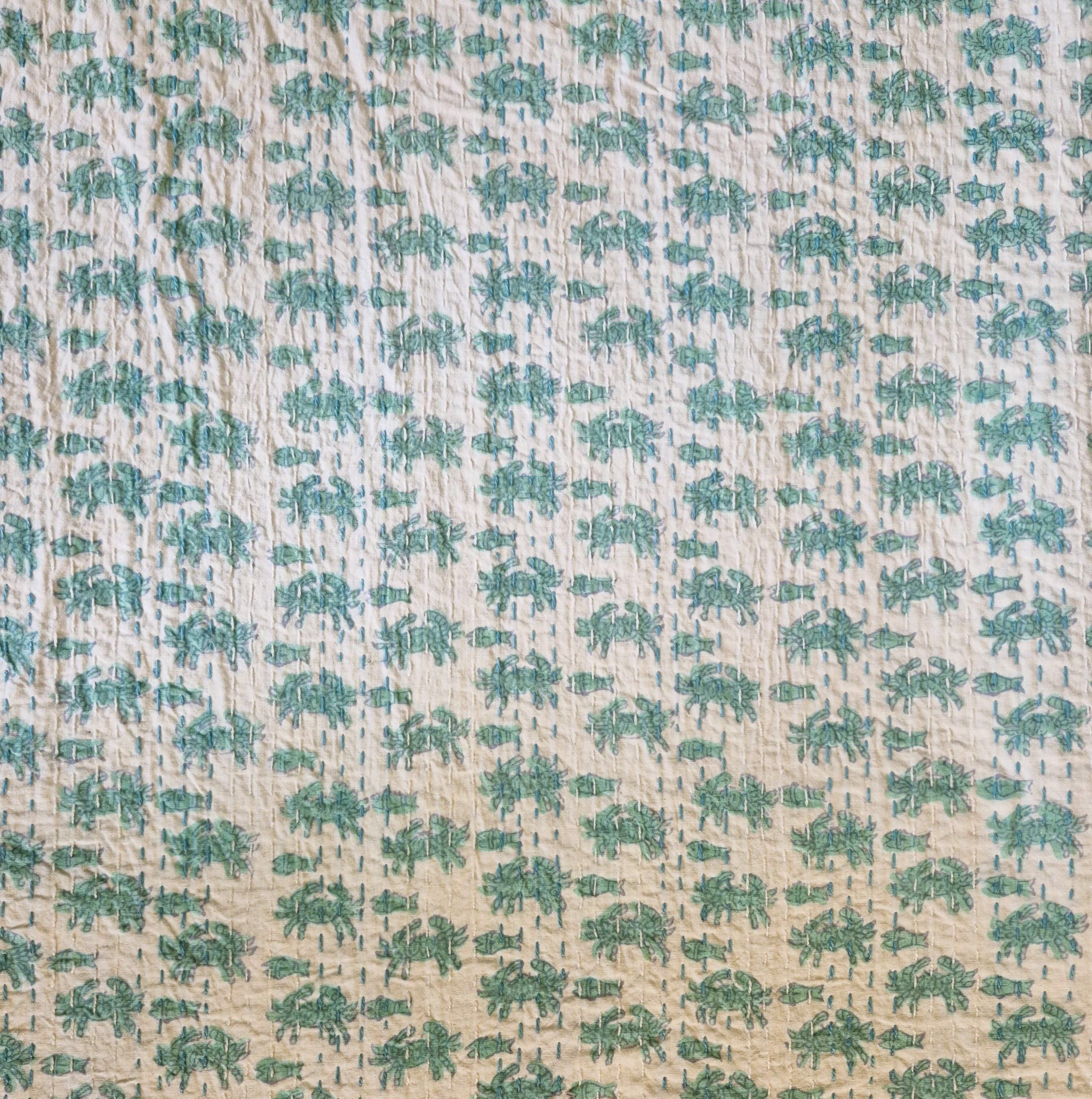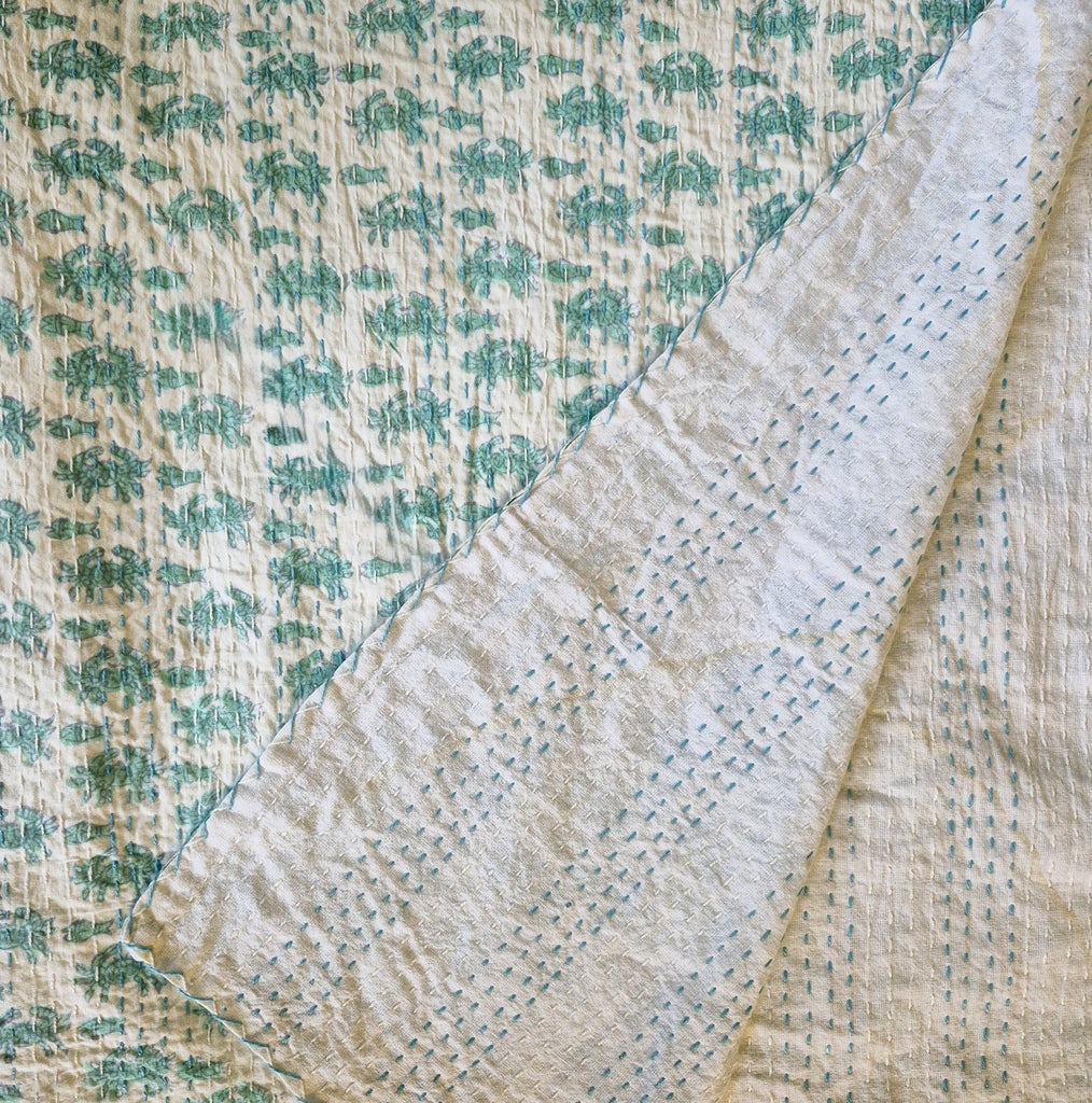 This contemporary take on vintage kanthas uses new block print fabric with hand stitching to create a light weight quilt, bedspread or throw.  We have also used them as dramatic tablecloths or curtains.   It has a cute crab and fish pattern on one side, and the other side is plain fabric with stitching in two colours.