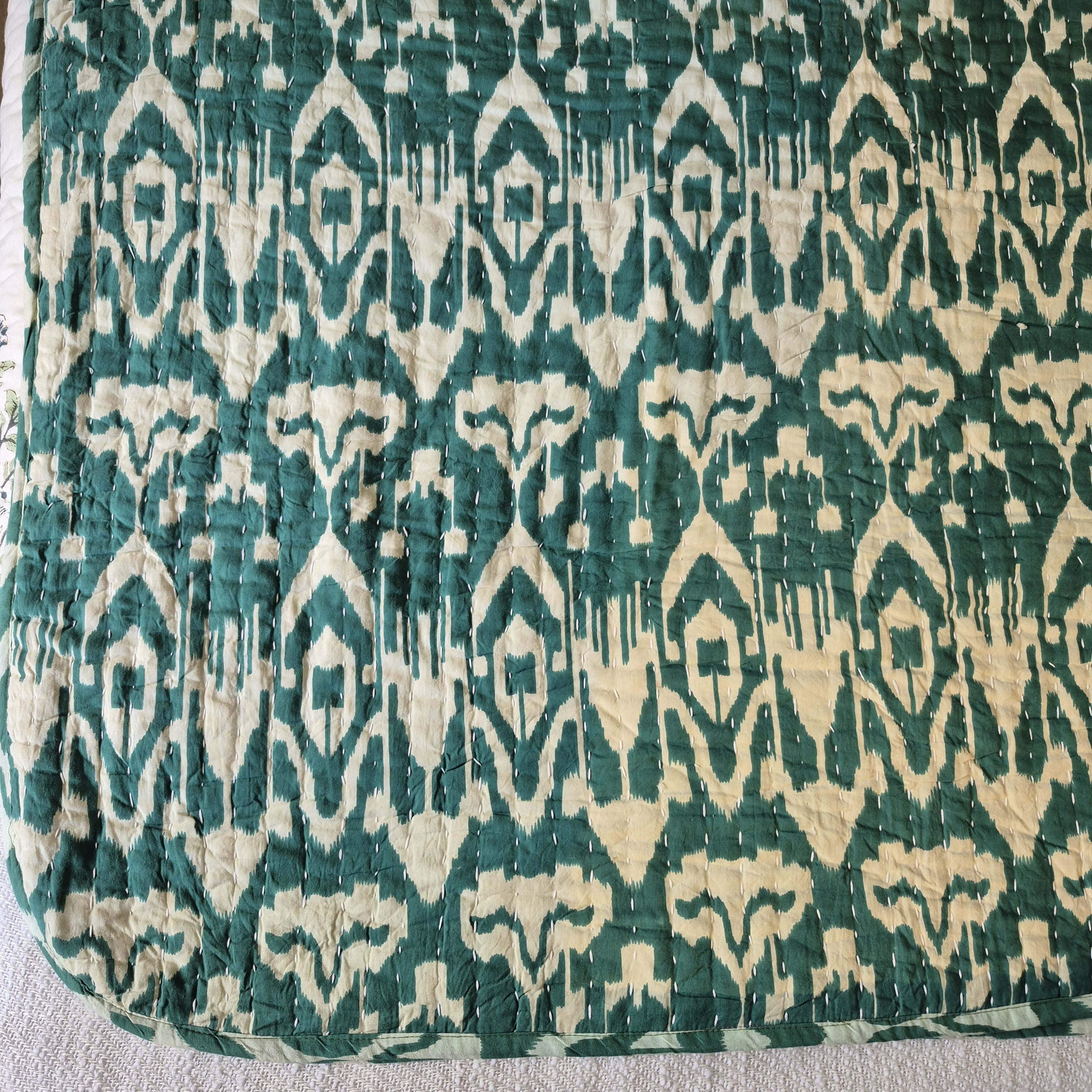 This contemporary take on vintage kanthas uses new block print fabric with hand stitching to create a light weight quilt, bedspread or throw. It is finished with rounded corners. The Ikat pattern is on both sides