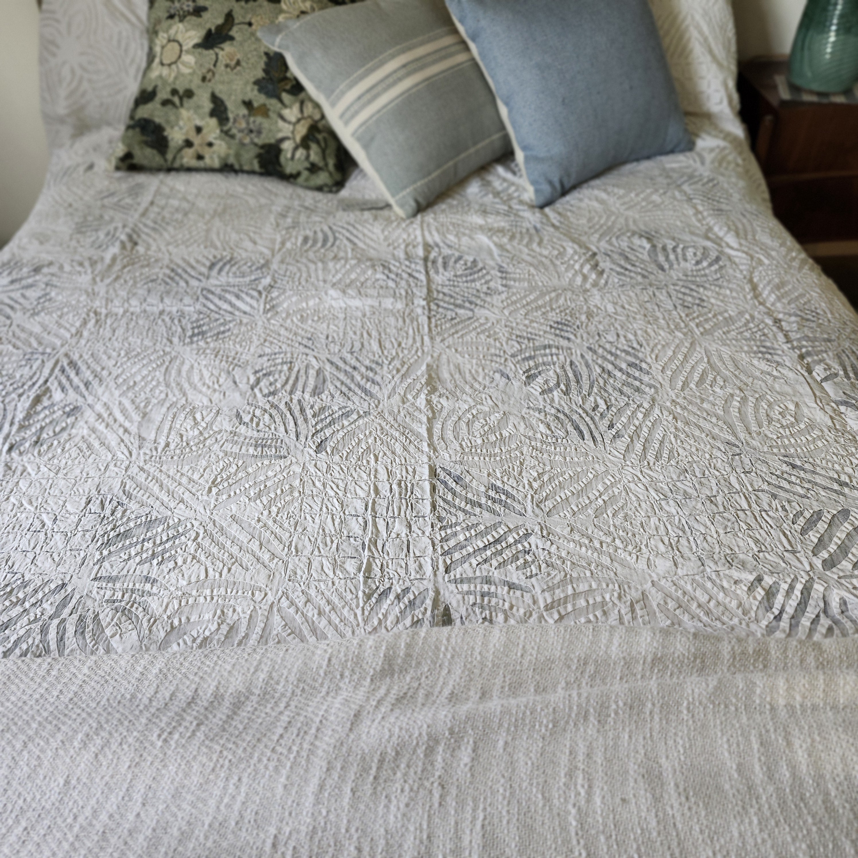 Elevate your home decor with our elegant white cotton bedspreads (or tablecloths), featuring delicate organza applique cutwork. Handmade in Jaipur, these pieces are becoming harder to find. Each piece showcases exquisite craftsmanship, adding style and timeless beauty to your bedroom or dining space.