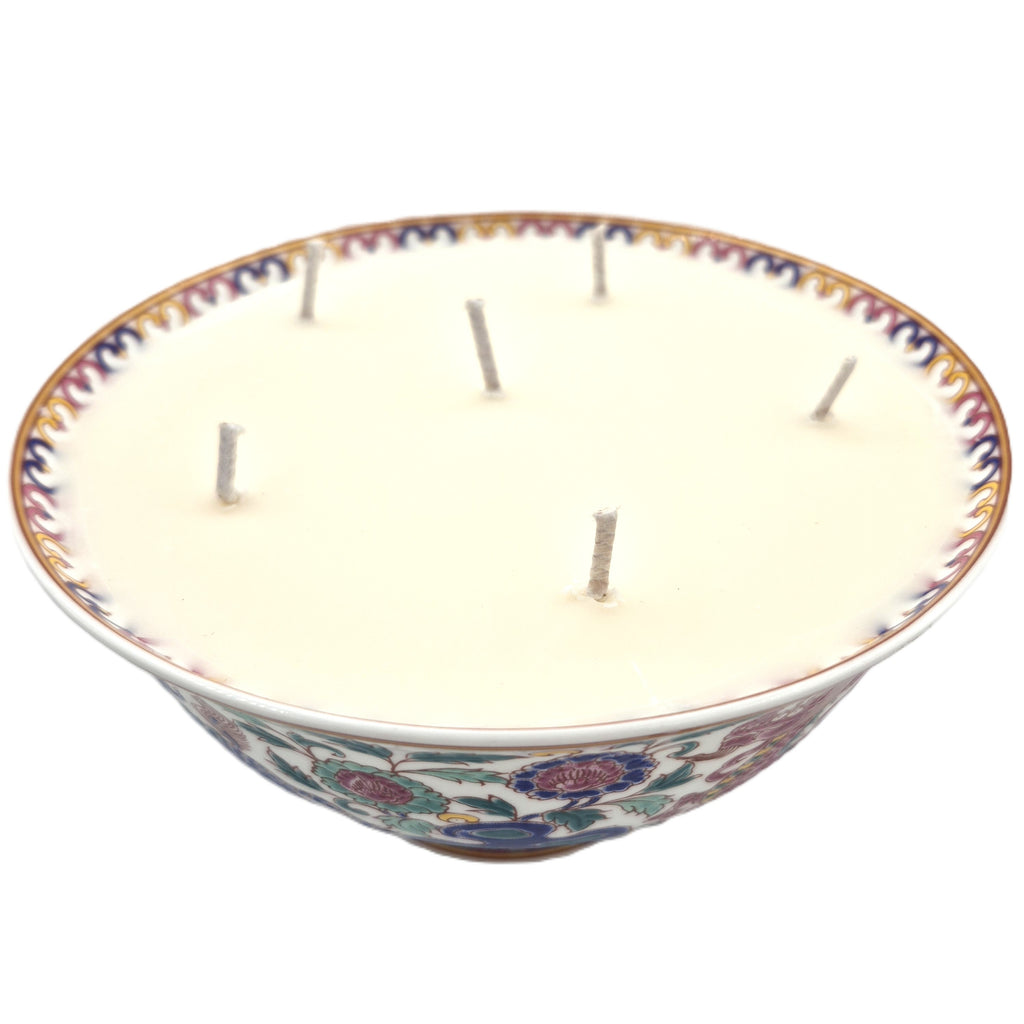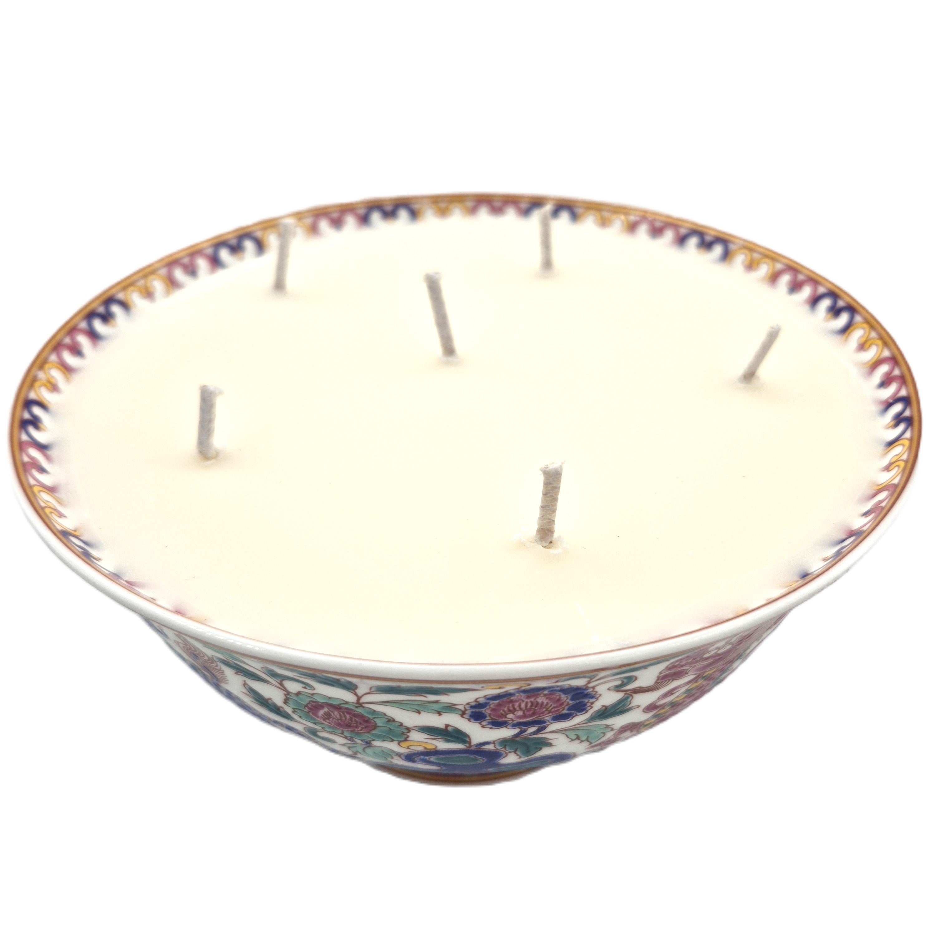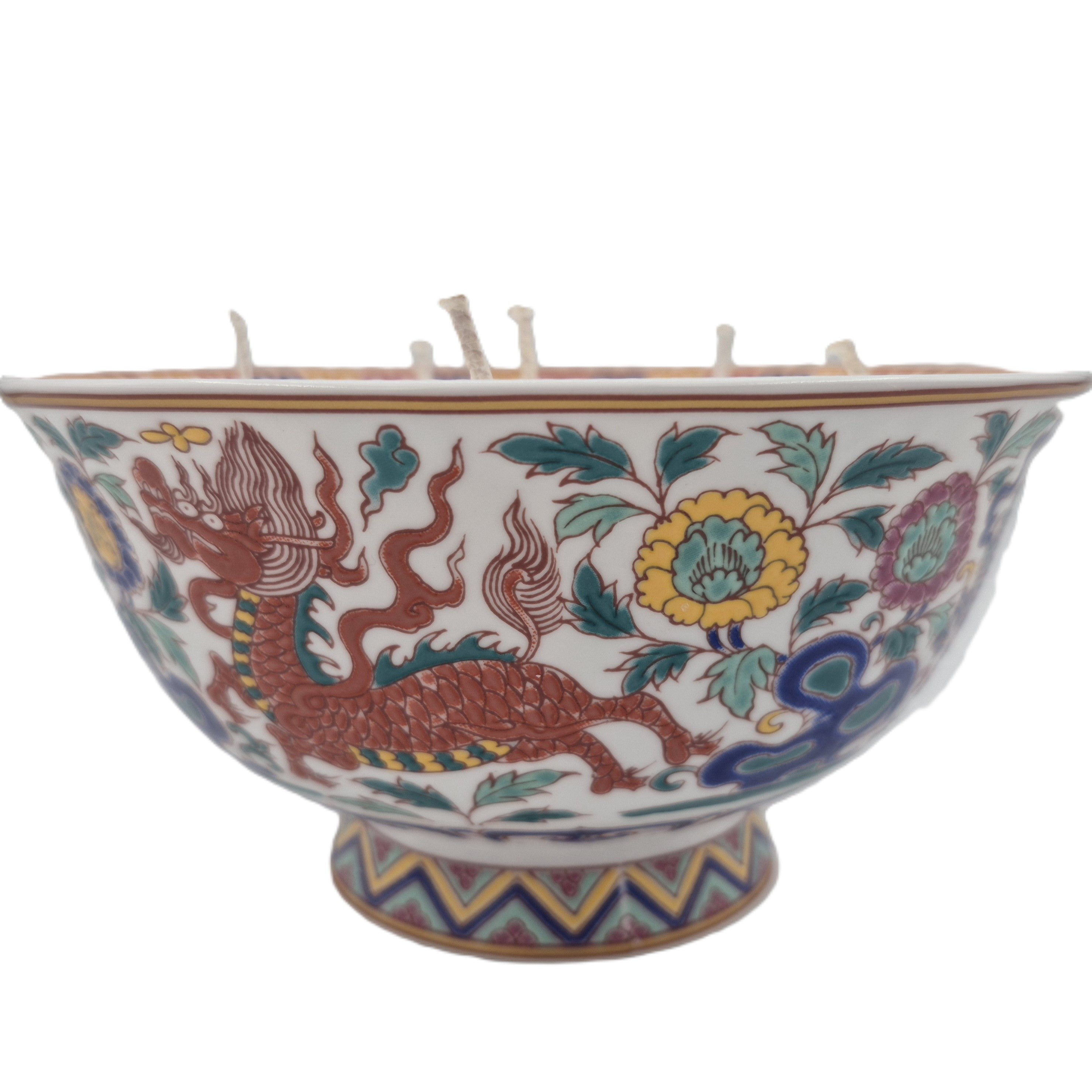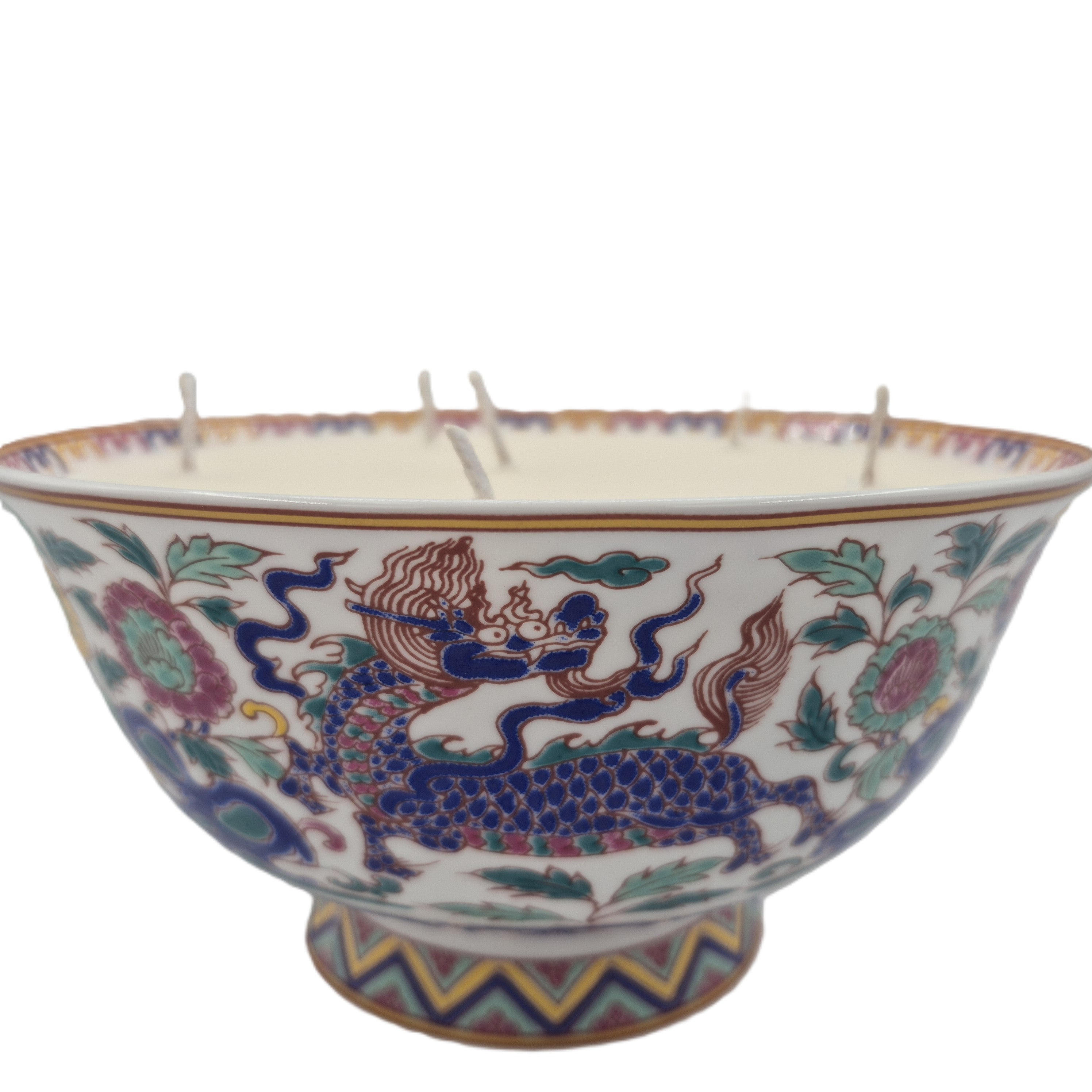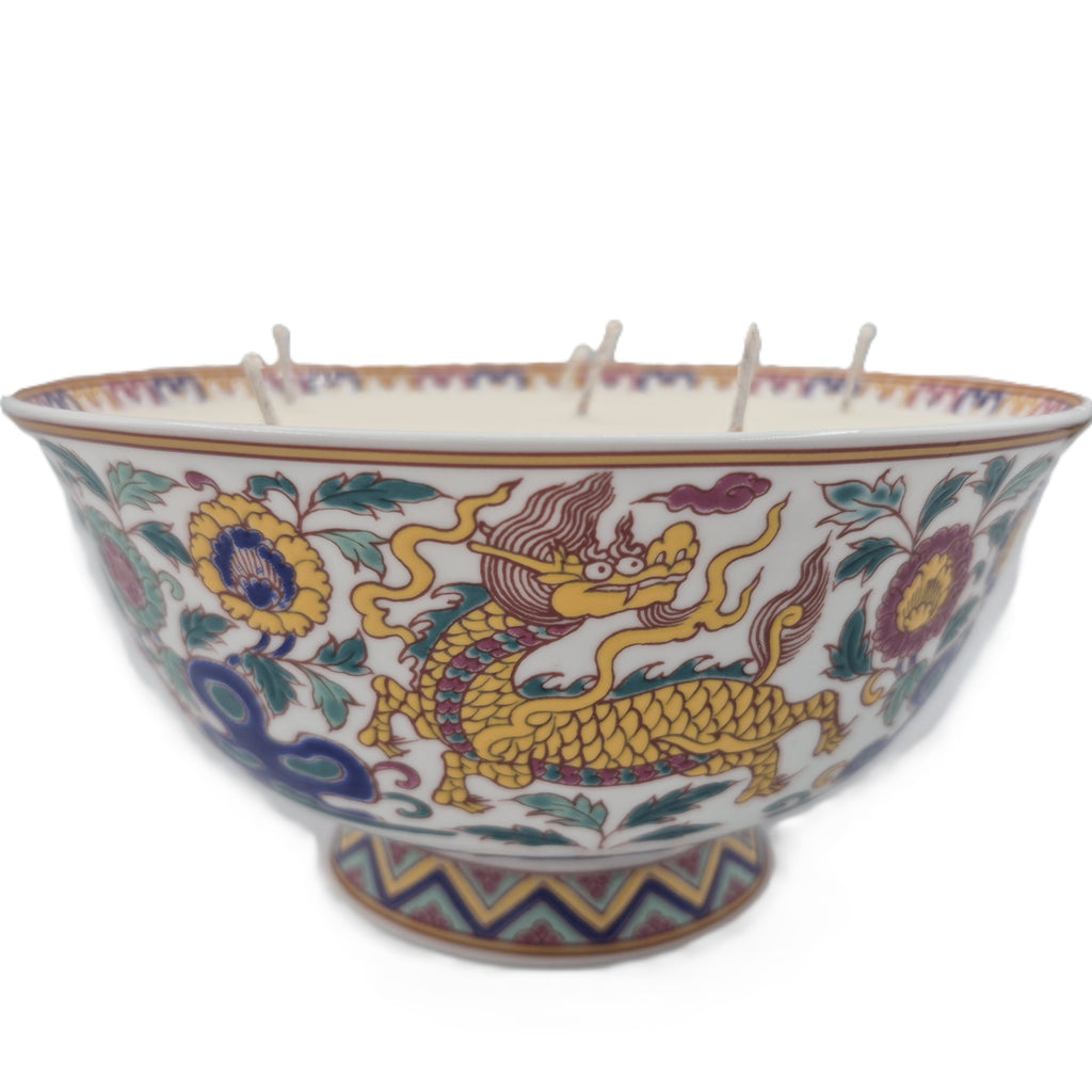 A colourful round porcelain dish, playfully decorated with dragons and flowers and filled with the 'Big Wave Bay' Scent. The wide dish allows for six wicks.