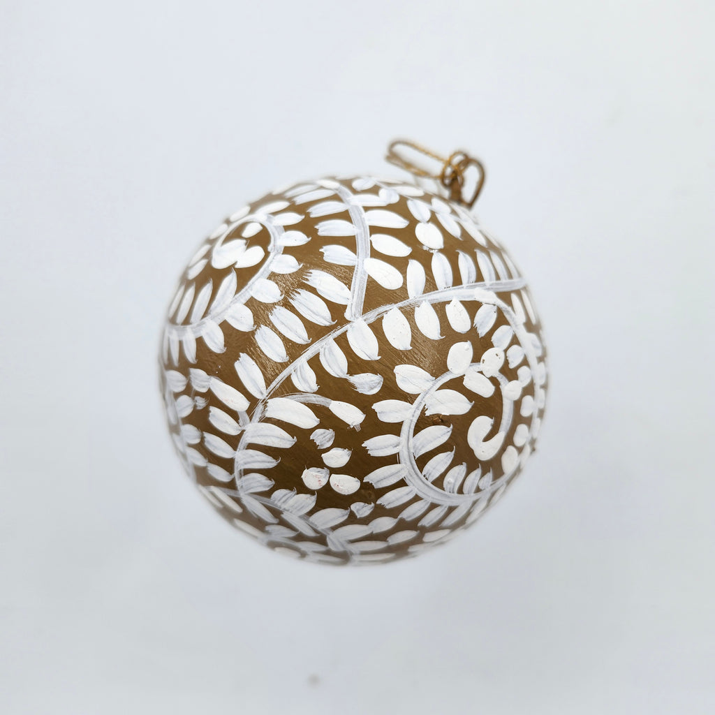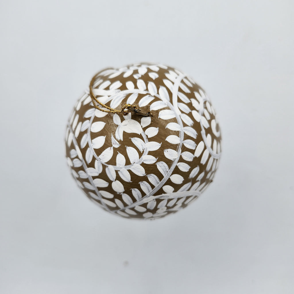 Handmade from papier mache in Kashmir, these delightful Christmas decorations have been individually hand-painted and finished with a matte varnish. The "Filigree" is a lacey white pattern on a natural background - simple, but effective and beautiful on a tree. It has a plain gold thread with a small tassel for hanging.
