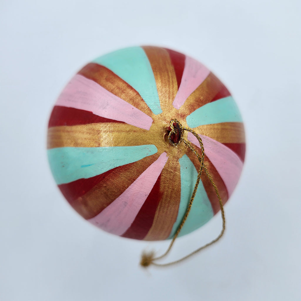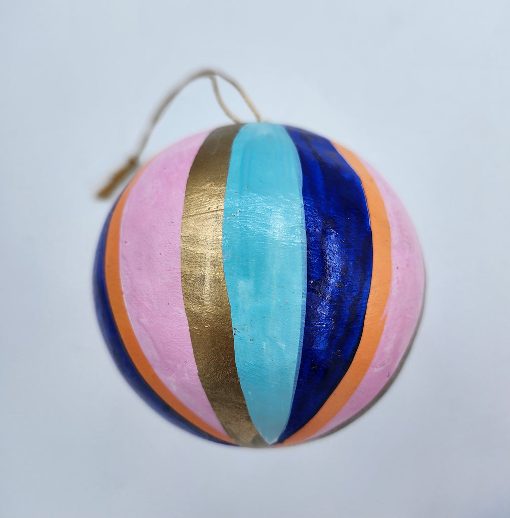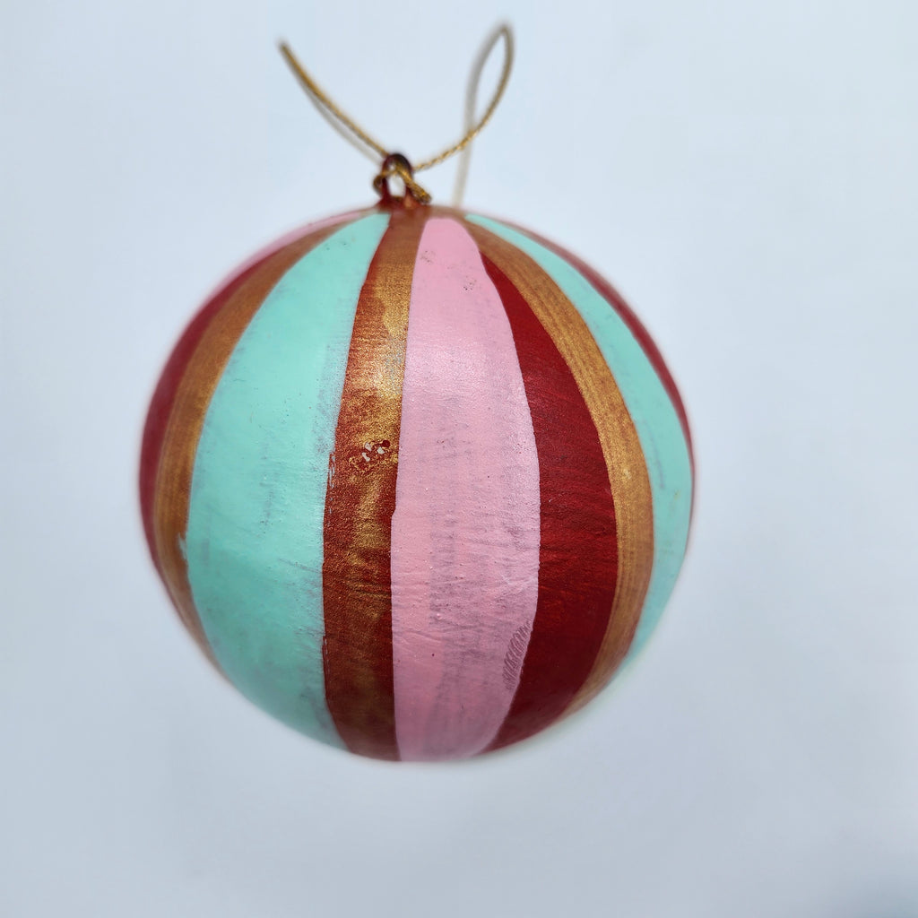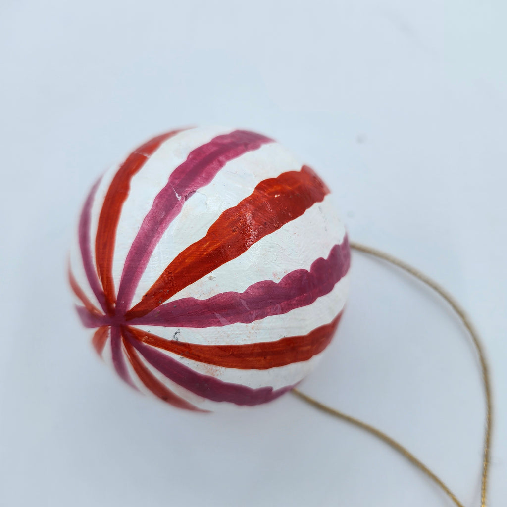 Handmade from papier mache in Kashmir, these delightful Christmas decorations have been individually hand-painted and finished with a semi-matte varnish.   Bring some bold colour to your tree with these vibrant stripes in exuberant colours, which work on their own, or even as a group.   They have a plain gold thread with a small tassel for hanging.