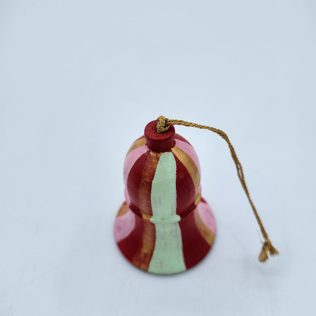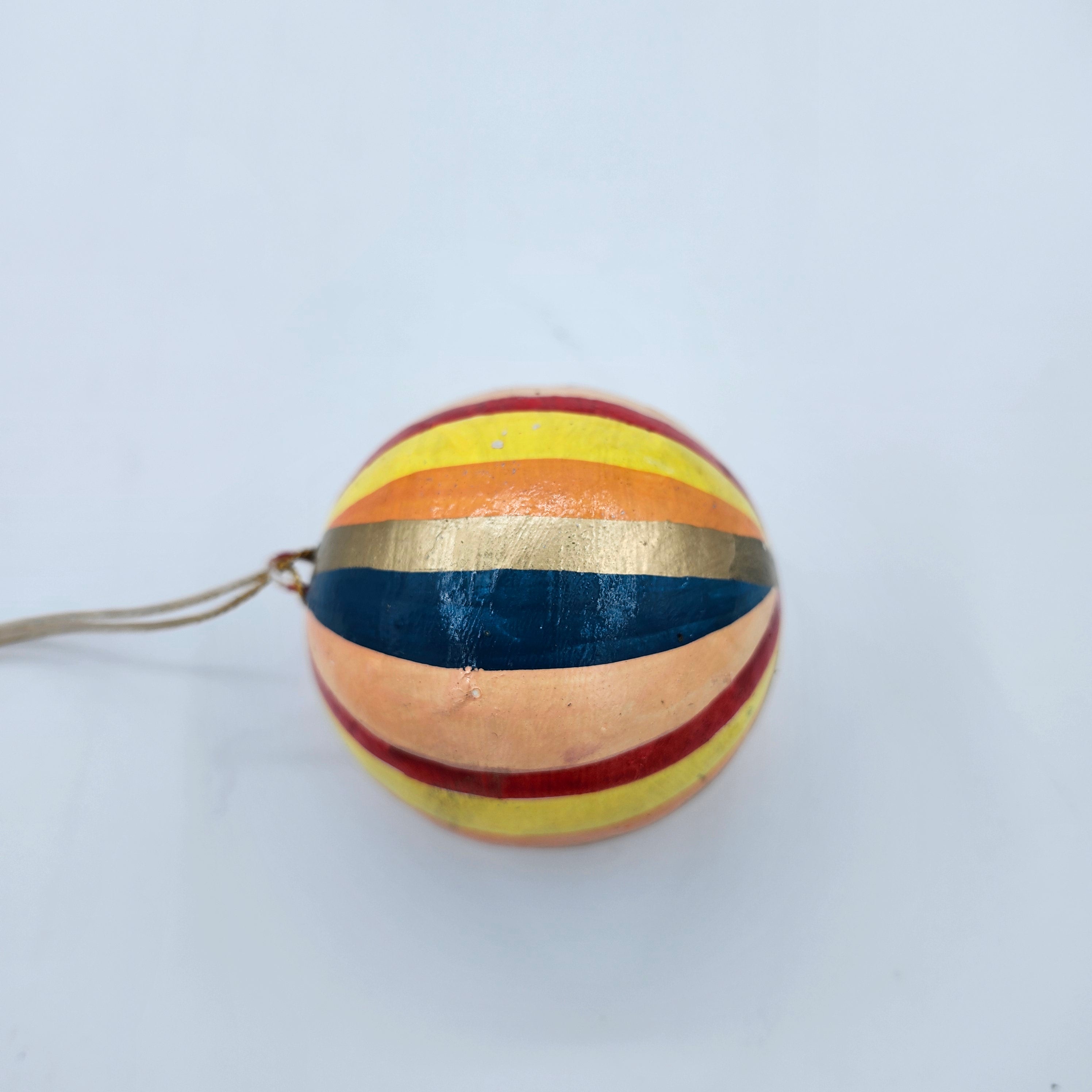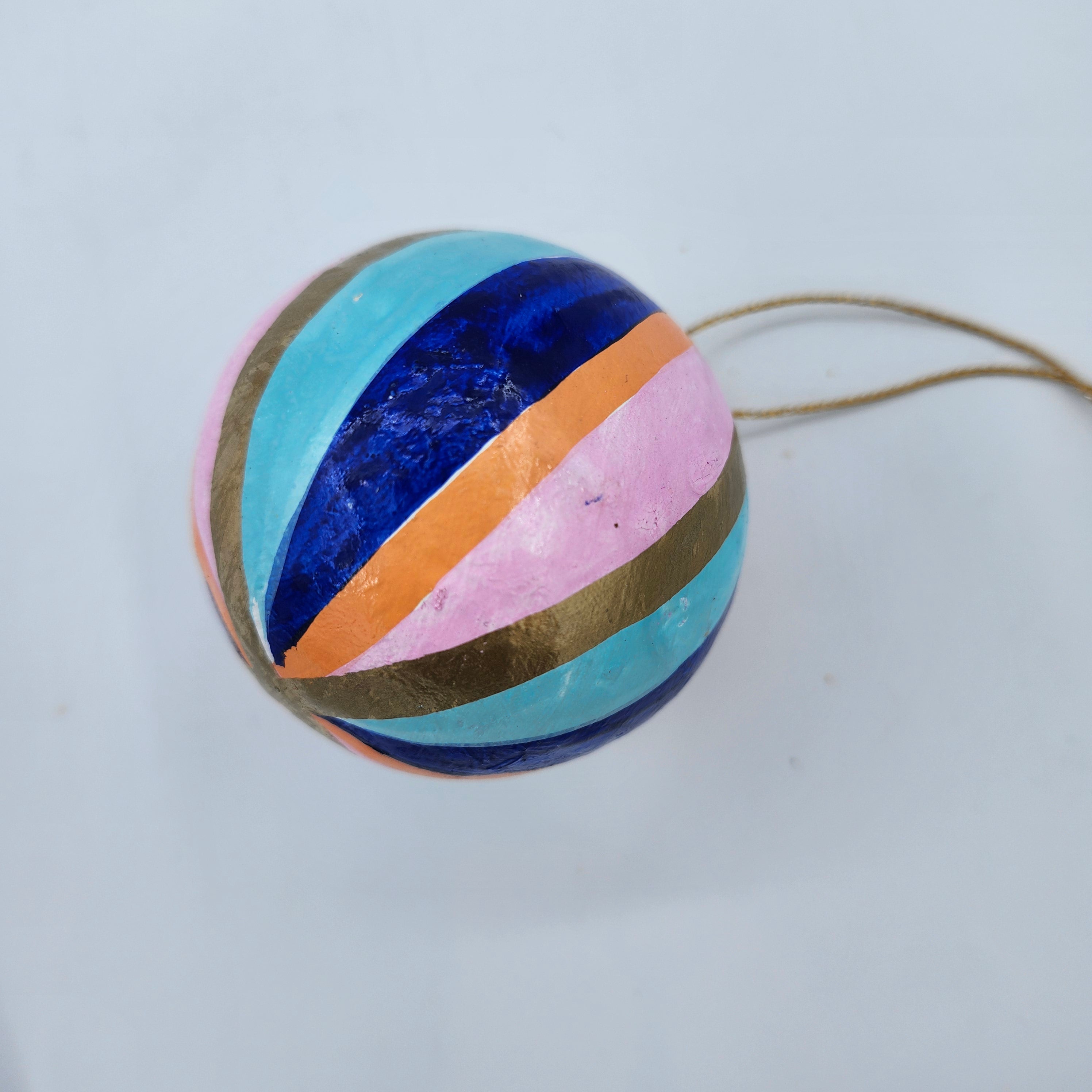 Handmade from papier mache in Kashmir, these delightful Christmas decorations have been individually hand-painted and finished with a semi-matte varnish.   Bring some bold colour to your tree with these vibrant stripes in exuberant colours, which work on their own, or even as a group.   They have a plain gold thread with a small tassel for hanging.