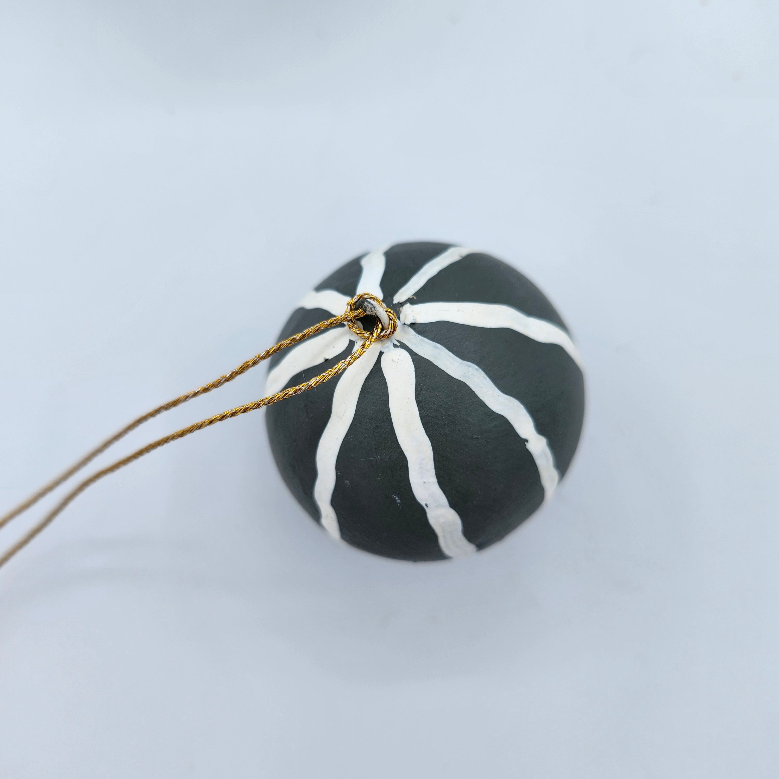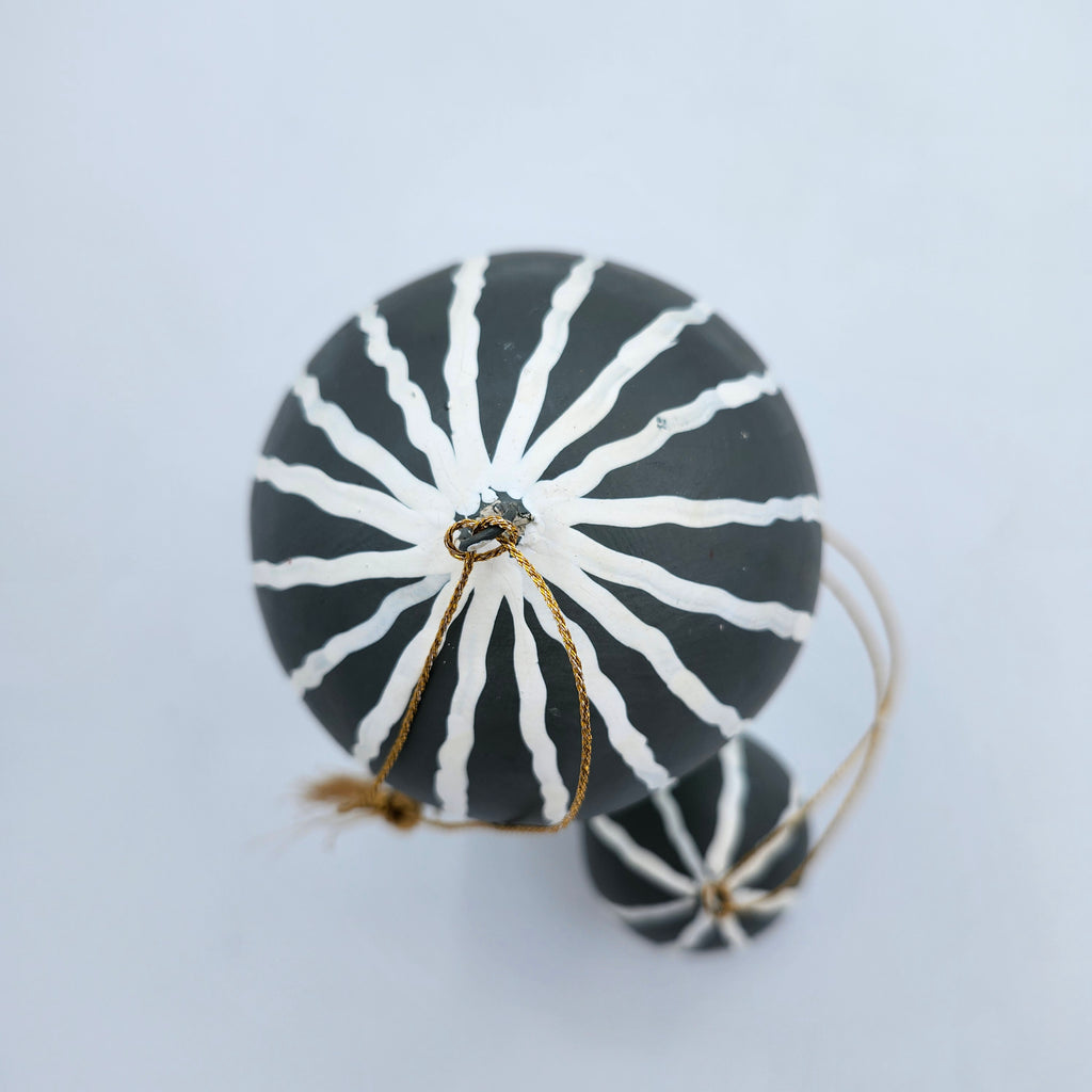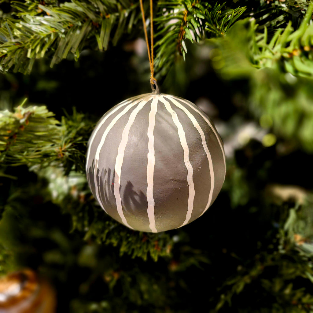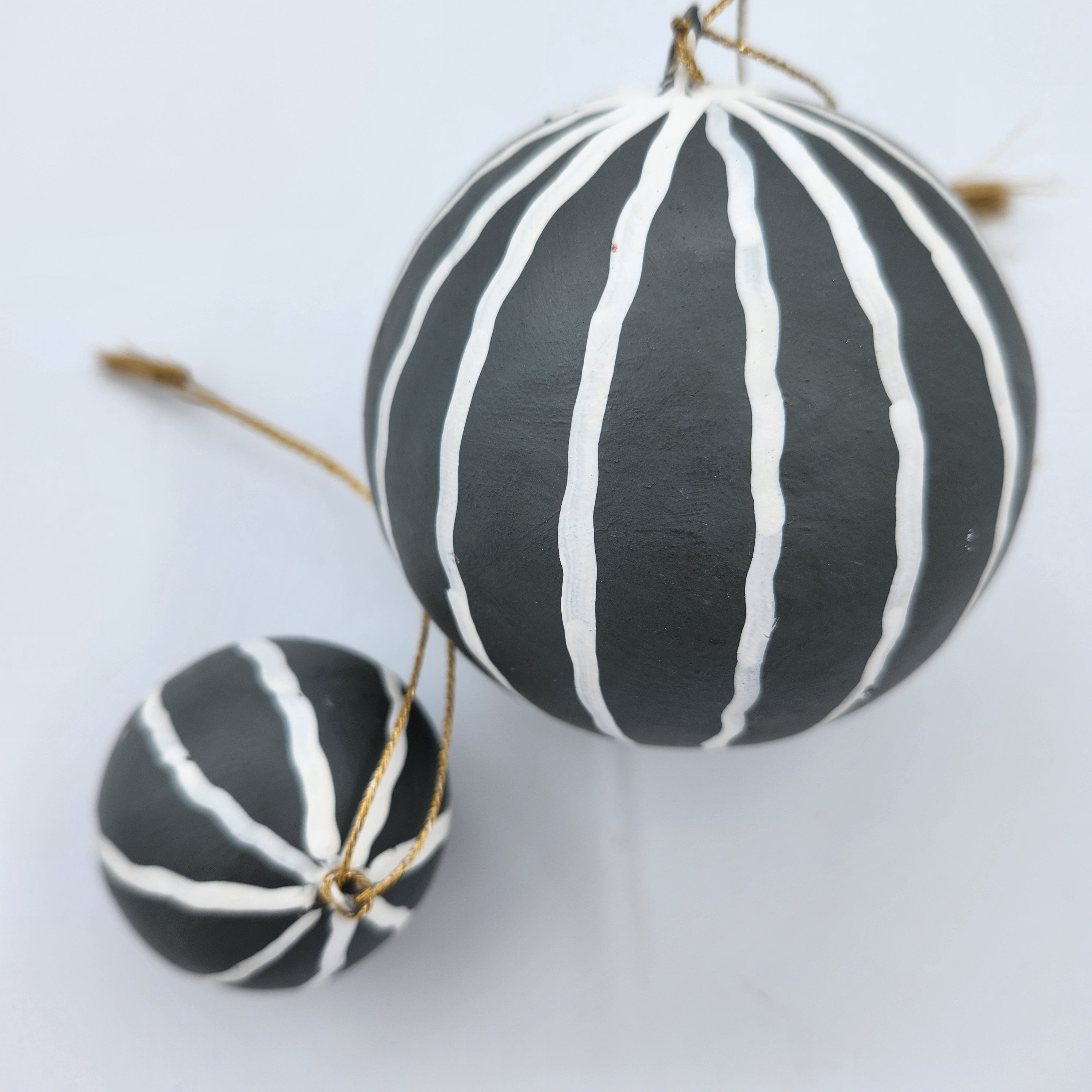 Handmade from papier mache in Kashmir, these delightful Christmas decorations have been individually hand-painted in grey with white stripes and finished with a matte varnish.    They have a plain gold thread with a small tassel for hanging.