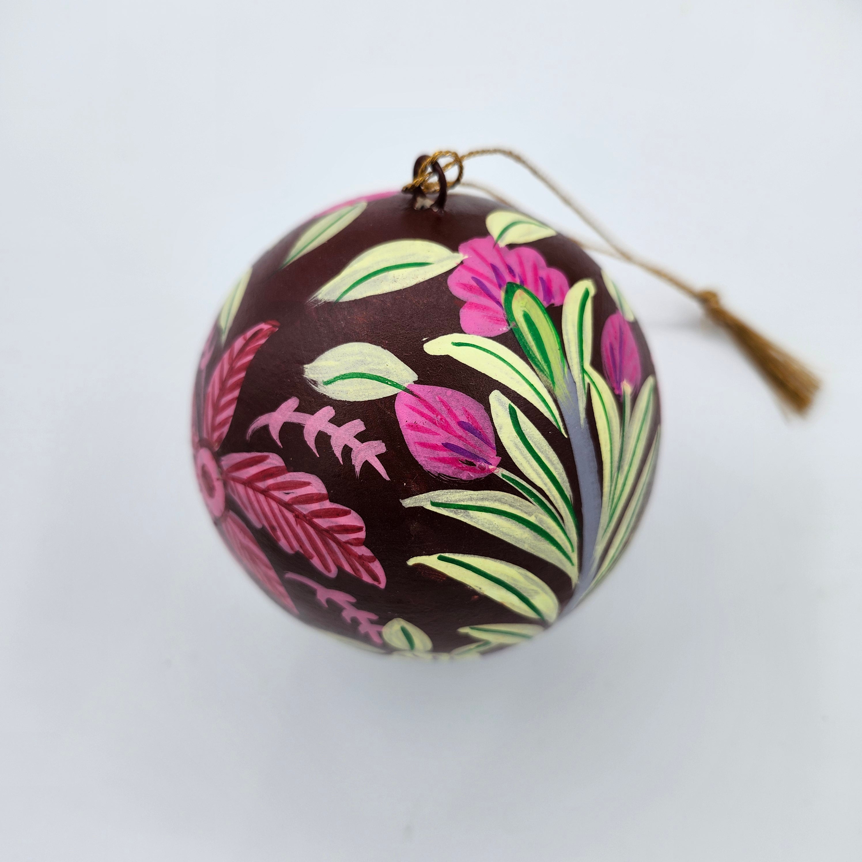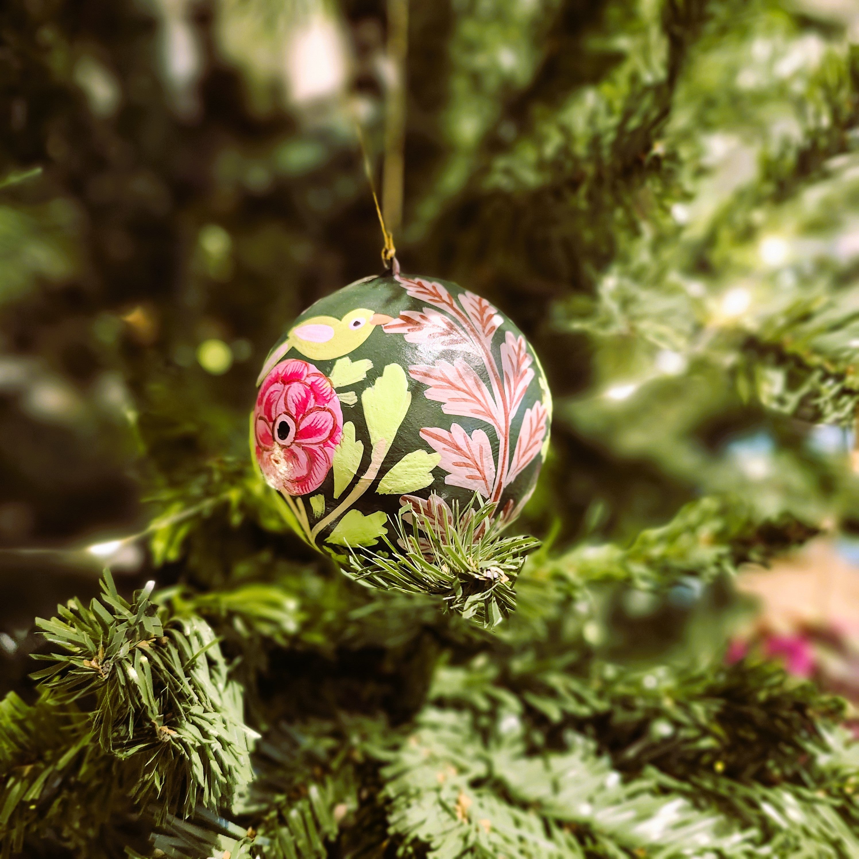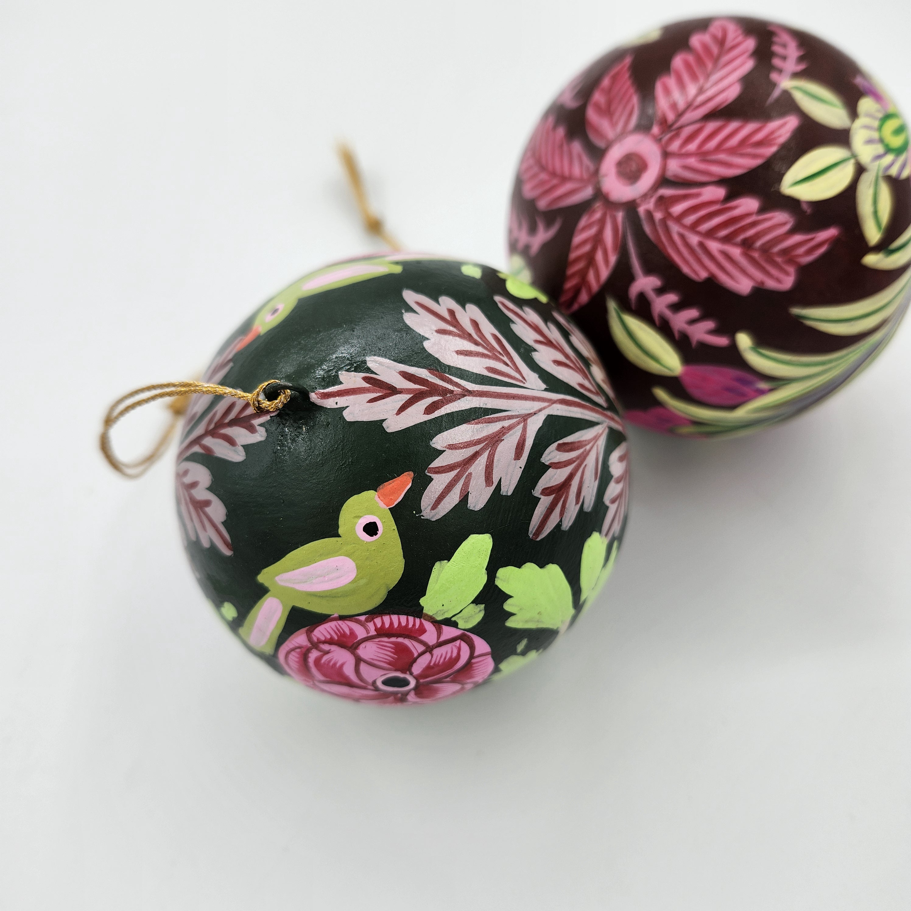 Handmade from papier mache in Kashmir, these delightful Christmas decorations have been individually hand-painted and finished with a matte varnish.   Available in two designs, they feature glorious tropical foliage in shades of red, pink and green, which looks very at home against a Christmas tree.  The green bauble has a little green bird.   They both have a plain gold thread with a small tassel for hanging.