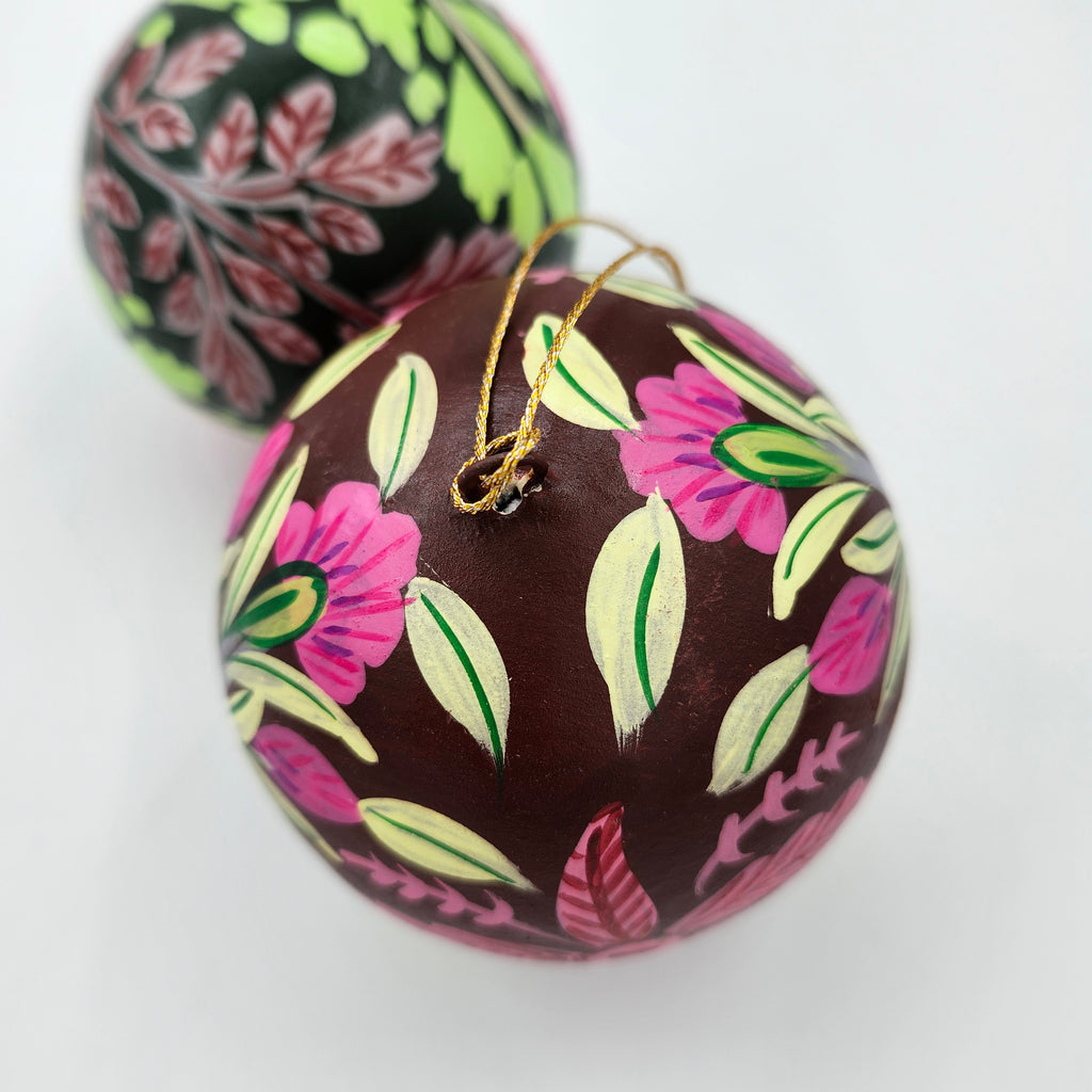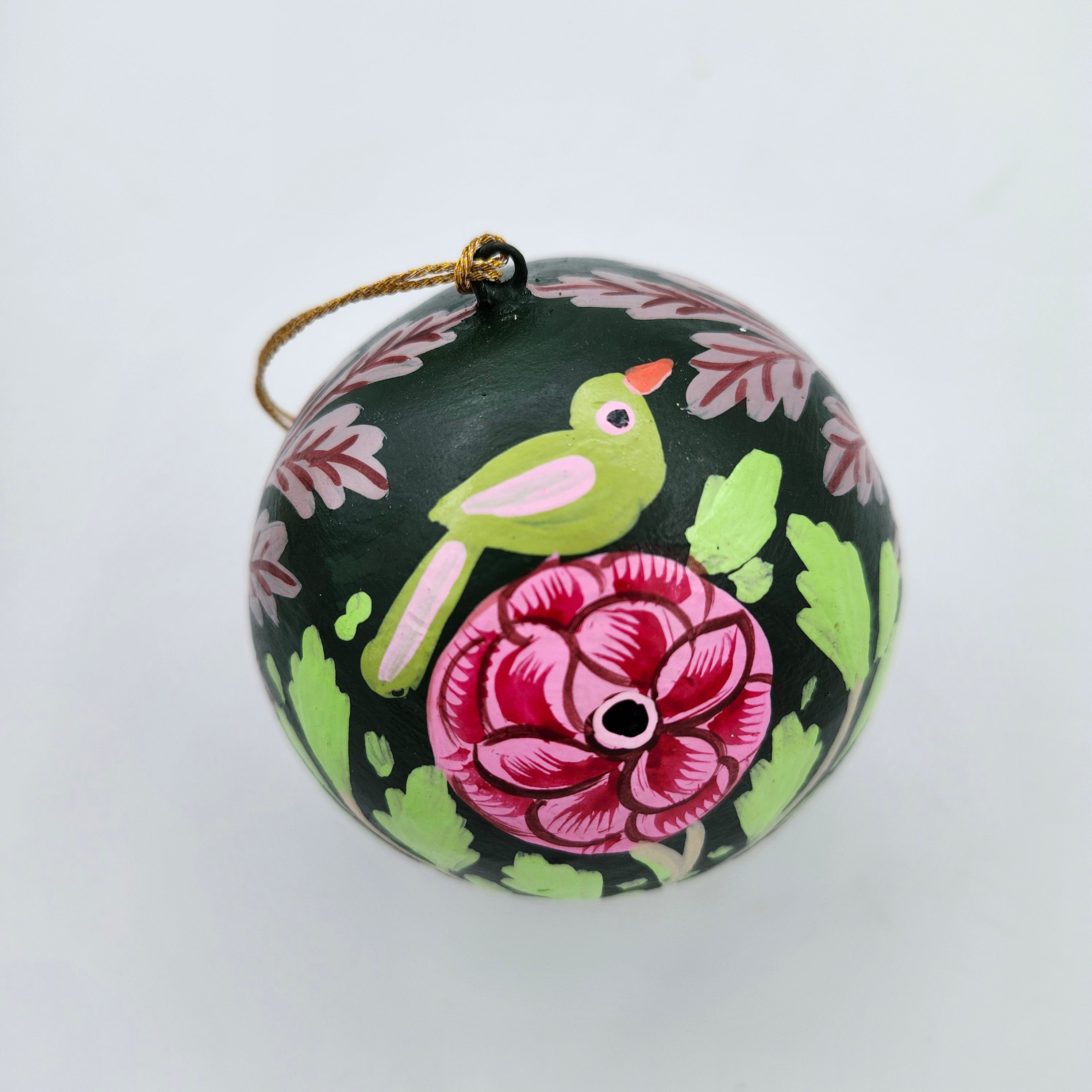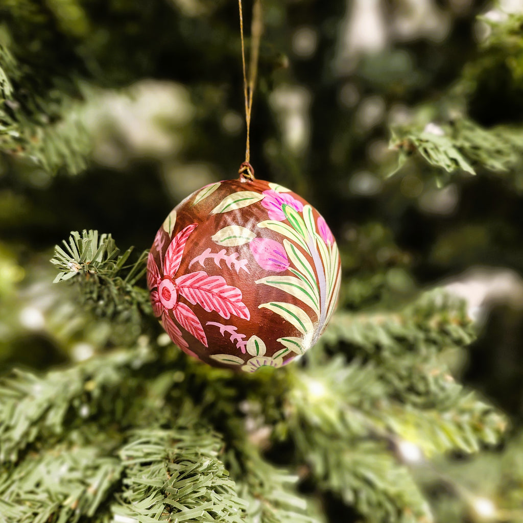 Handmade from papier mache in Kashmir, these delightful Christmas decorations have been individually hand-painted and finished with a matte varnish.   Available in two designs, they feature glorious tropical foliage in shades of red, pink and green, which looks very at home against a Christmas tree.  The green bauble has a little green bird.   They both have a plain gold thread with a small tassel for hanging.