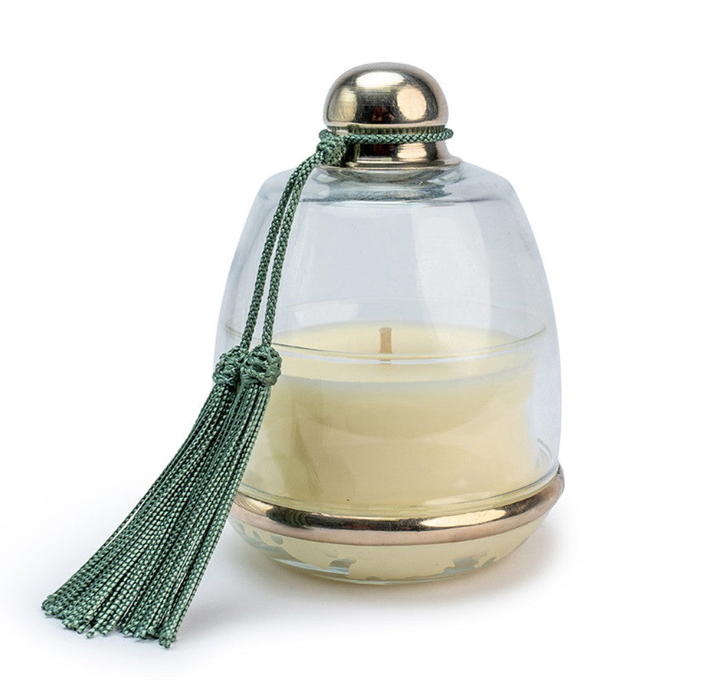 The Cloche collection by Cote Bougie comprises a bell-shaped glass lid, with a tasselled silver knob, and a silver and glass base, containing the candle.   Lift the lid, and it will reveal its wonderful scent, combining the freshness of crushed mint with delicate accents of green tea.   Clean and serene, it captures the essence of a lush Mediterranean garden in high summer.  It's a beautiful decorative item in its own right, as well as being a gorgeous candle.