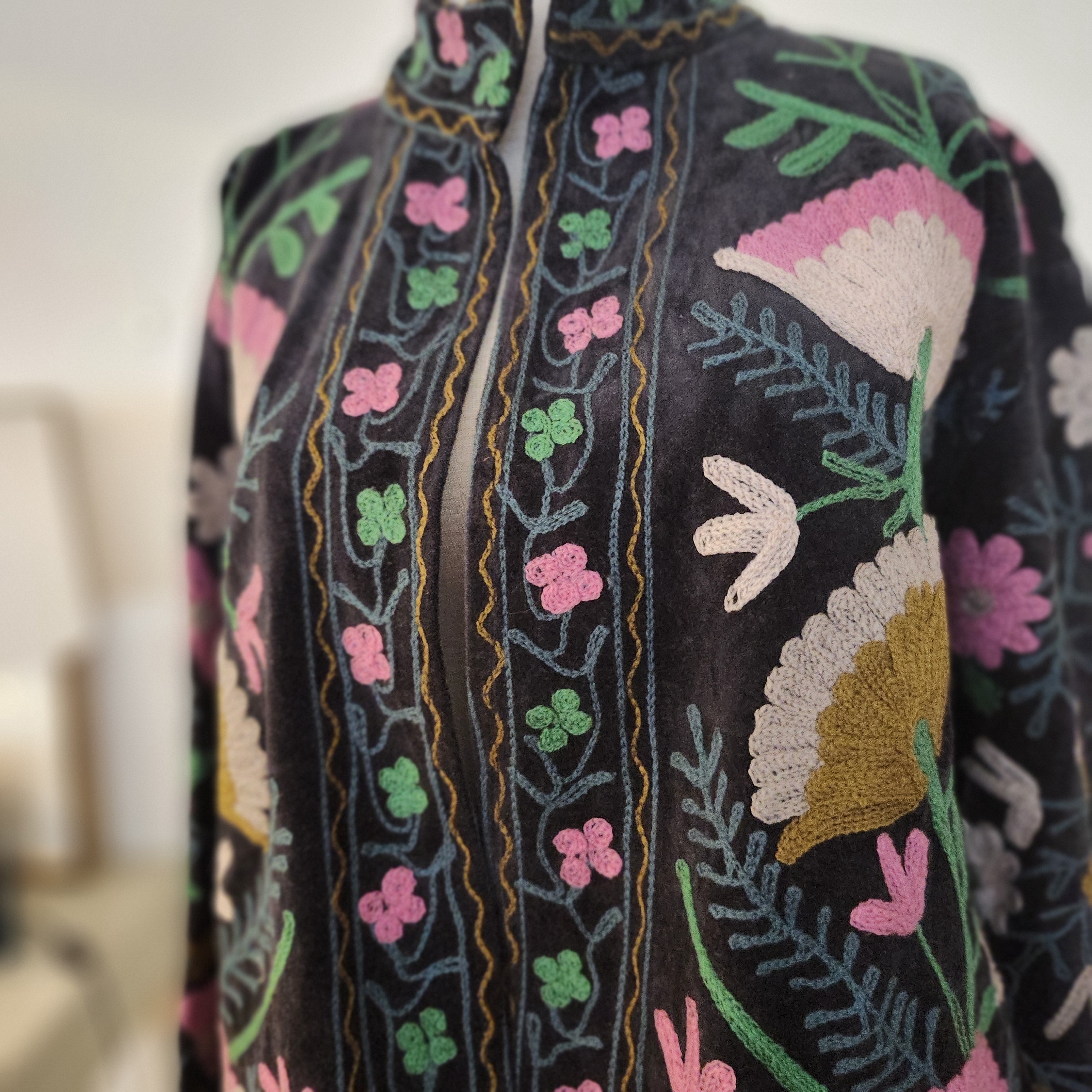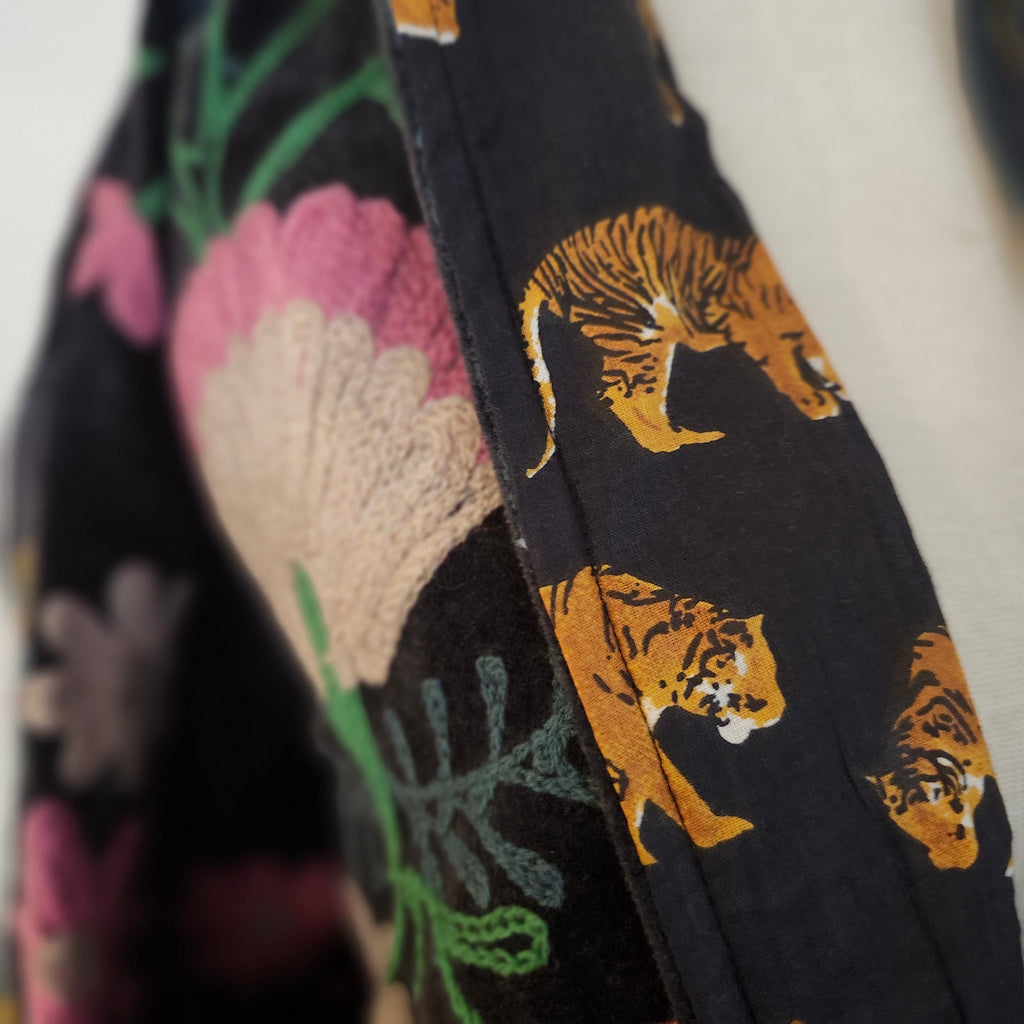 A stunning and unusual jacket in black coloured velvet, with hand-worked suzani stitching. Lined in a tiger print cotton block print, and with two pockets.