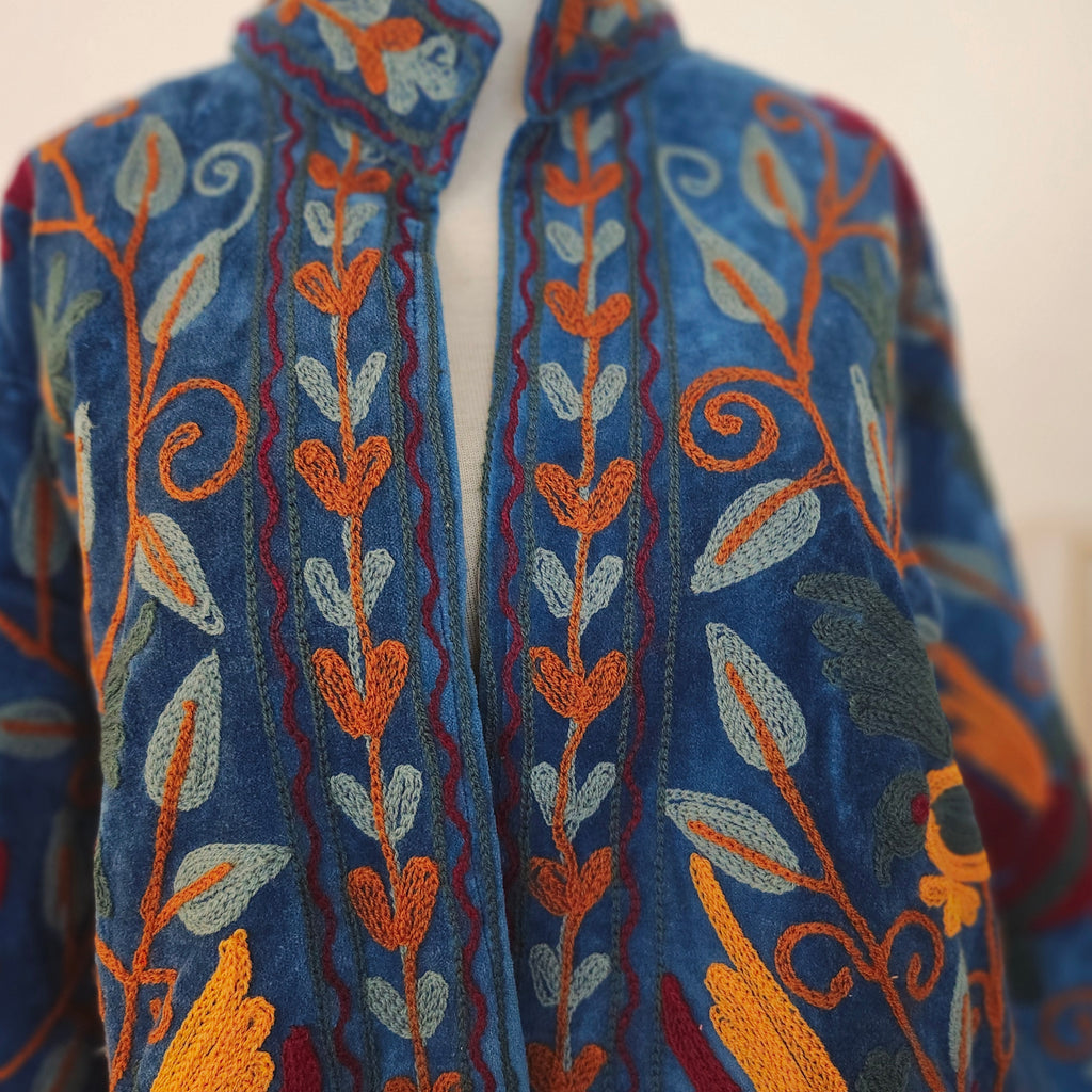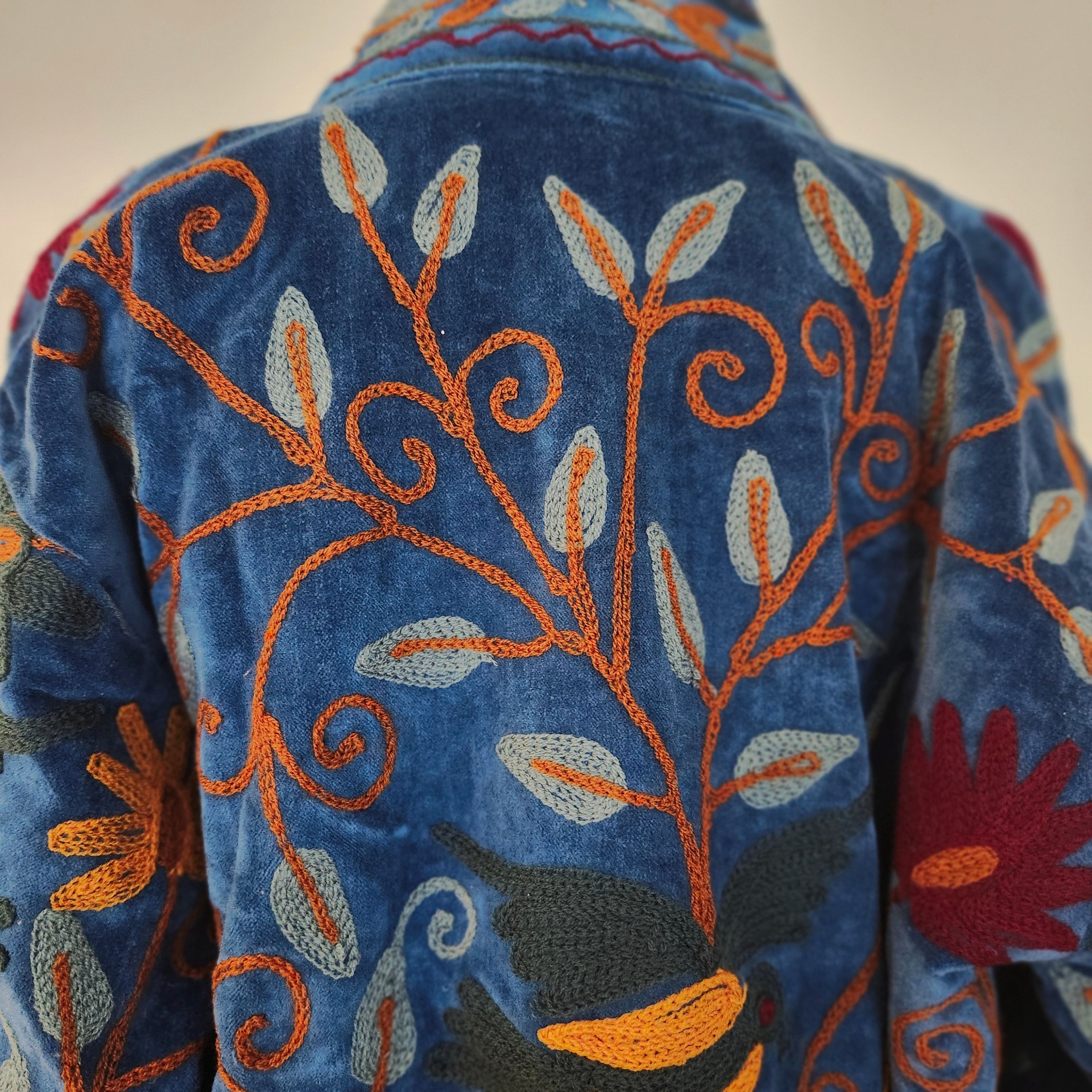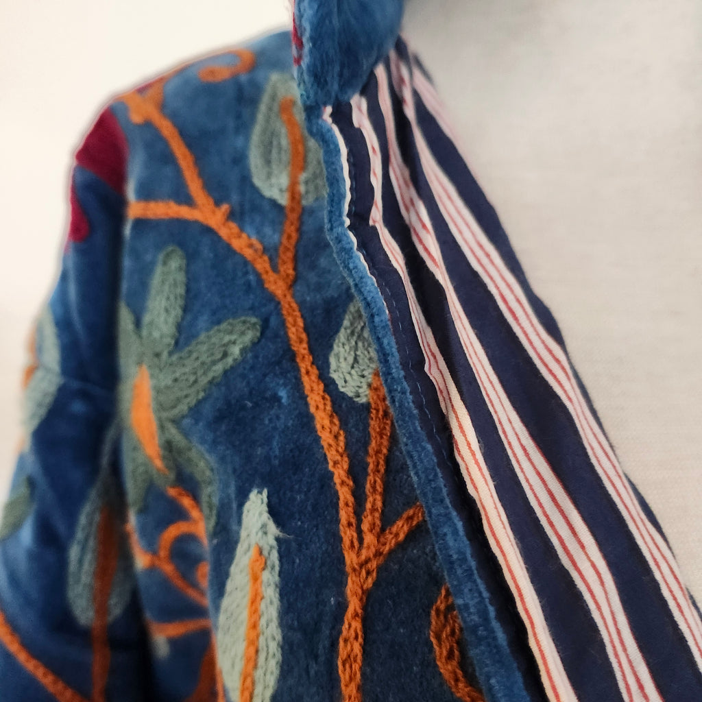 A stunning and unusual jacket in blue velvet, with hand-worked suzani stitching. Lined in striped cotton block print, and with two pockets.