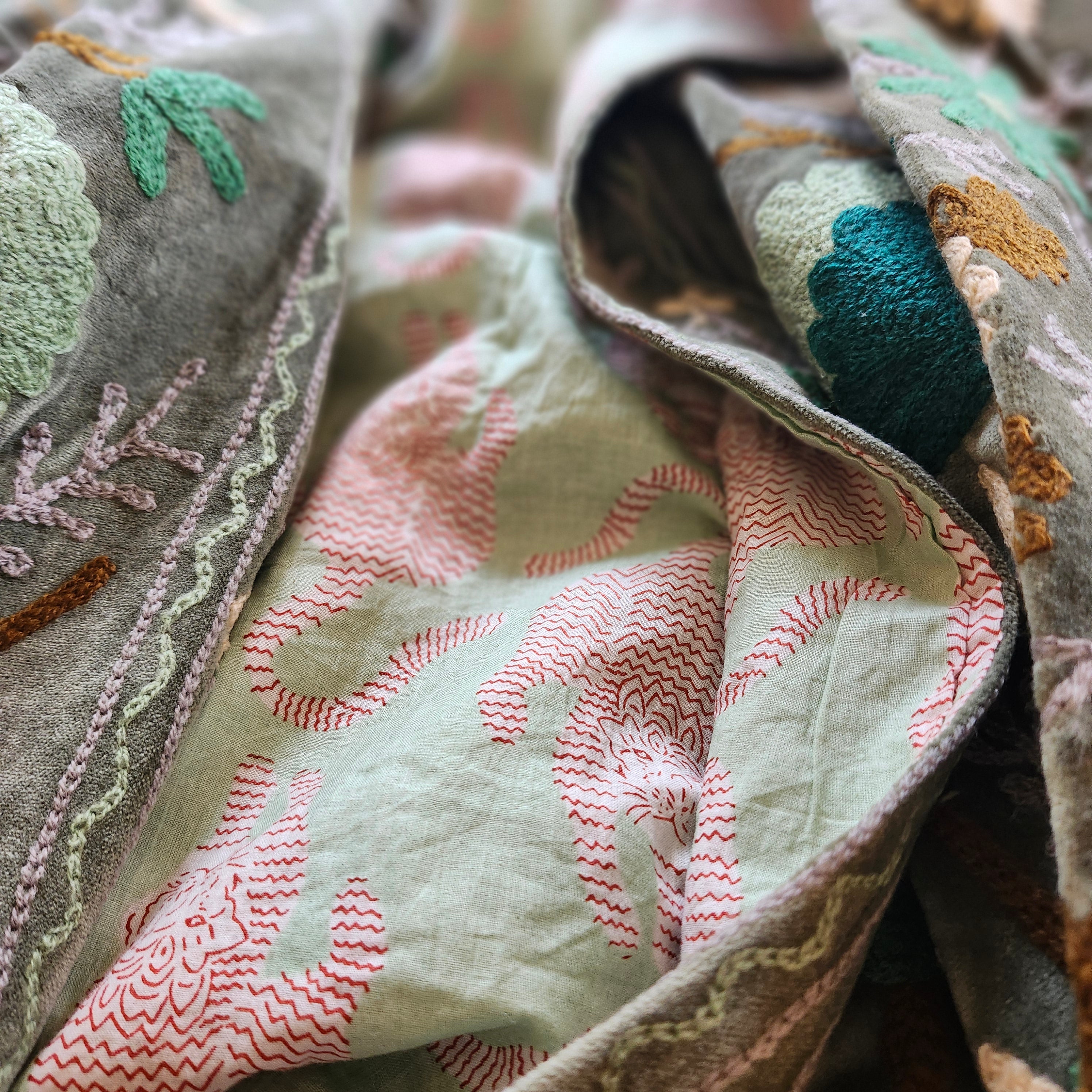 A stunning and unusual jacket in olive coloured velvet, with hand-worked suzani stitching. It is lined in a complementary green cotton block print, featuring tigers. No buttons, but two side pockets.