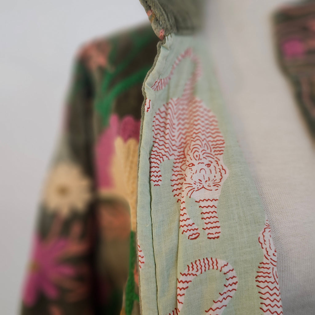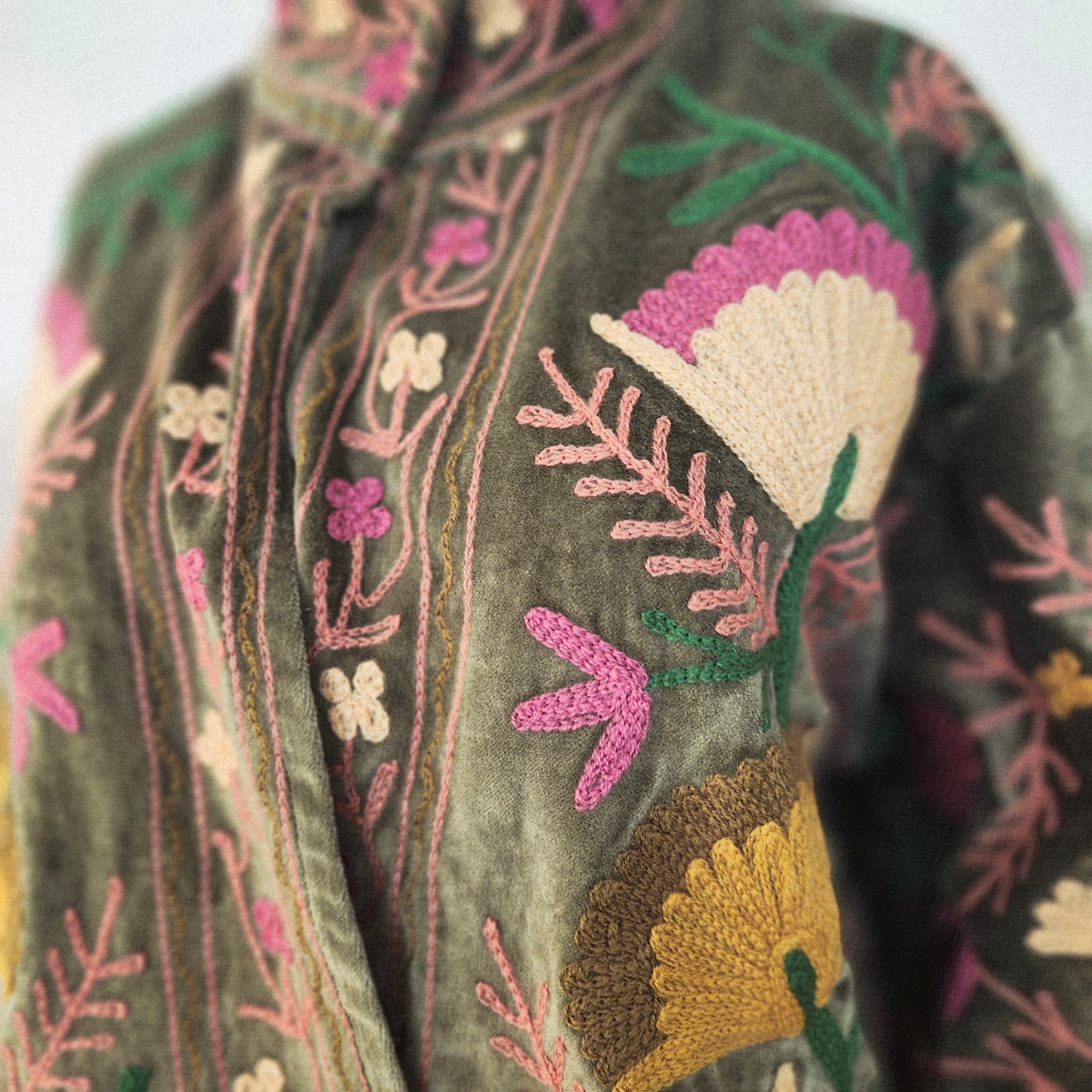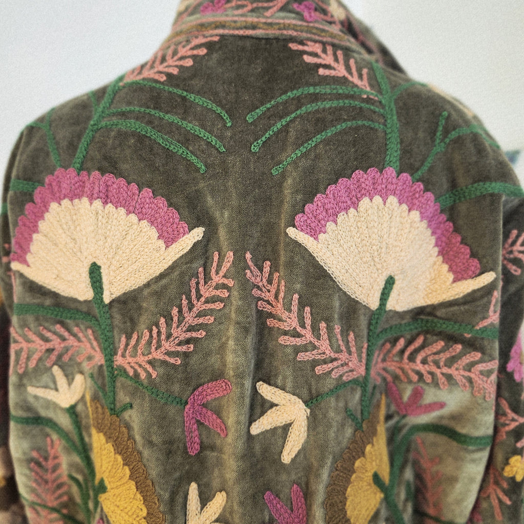 A stunning and unusual jacket in olive coloured velvet, with hand-worked suzani stitching. It is lined in a complementary green cotton block print, featuring tigers. No buttons, but two side pockets.