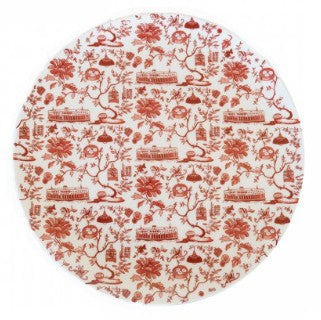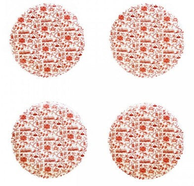 A set of four 8" fine bone china plates in the HK Toile pattern, in red.  The set comes in a gift box.