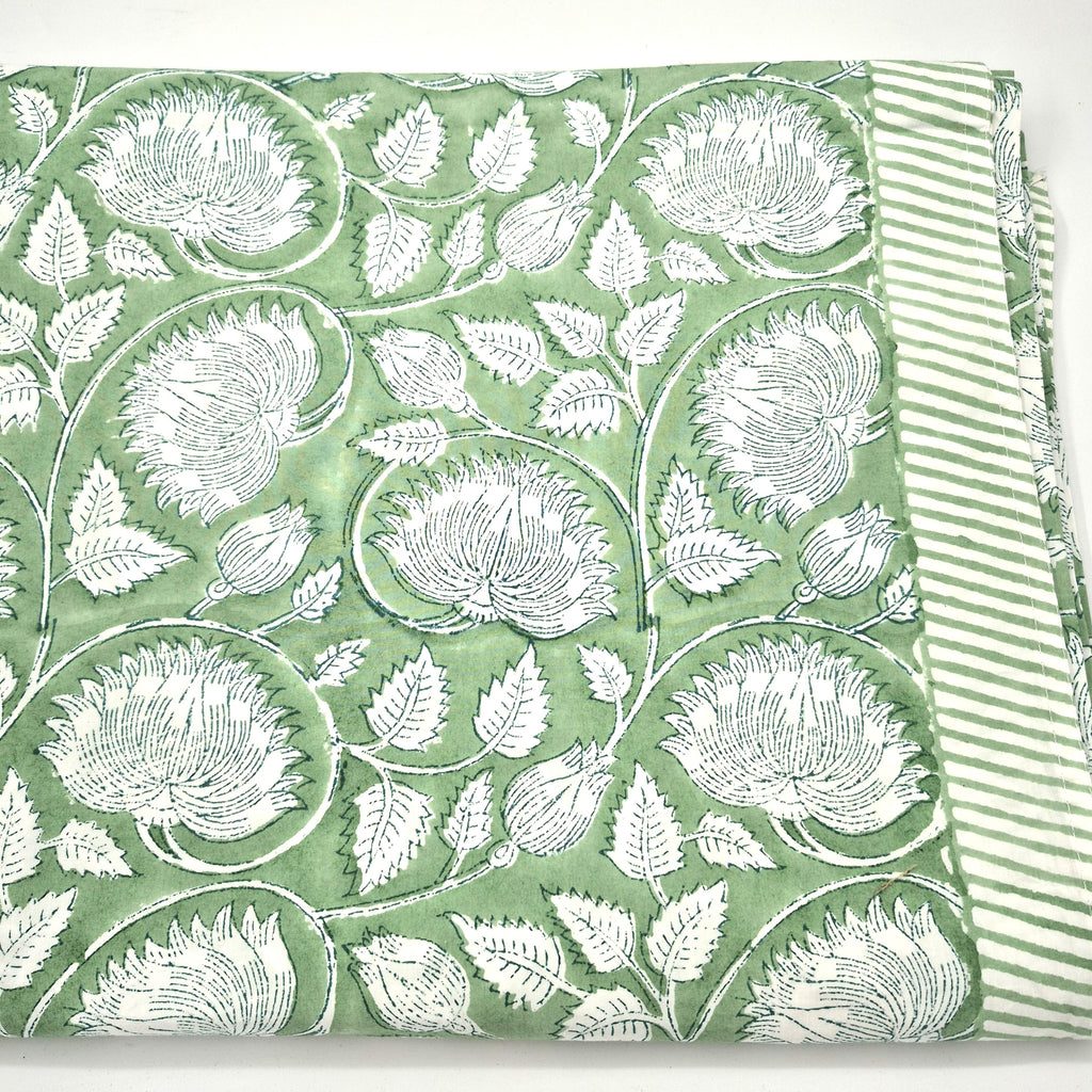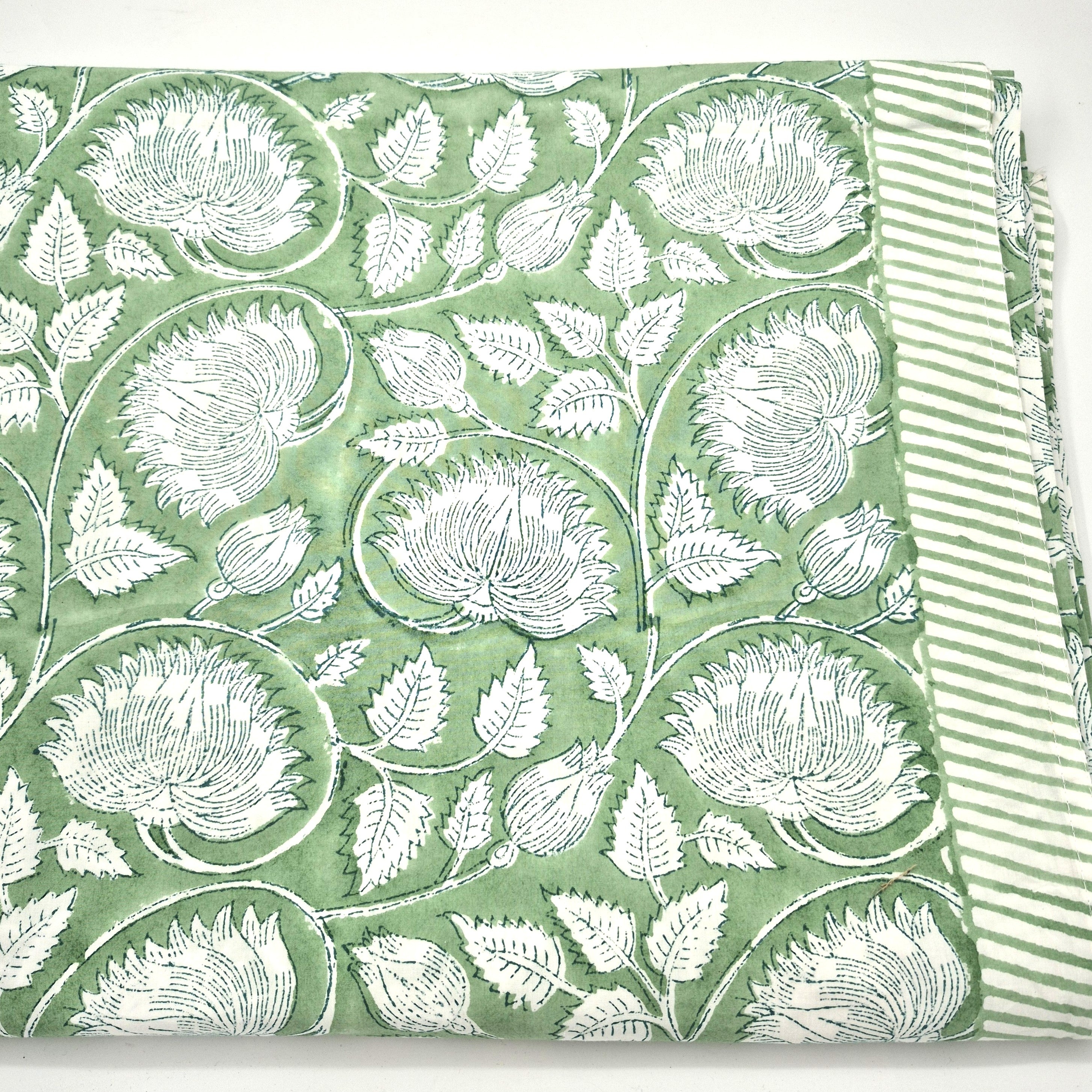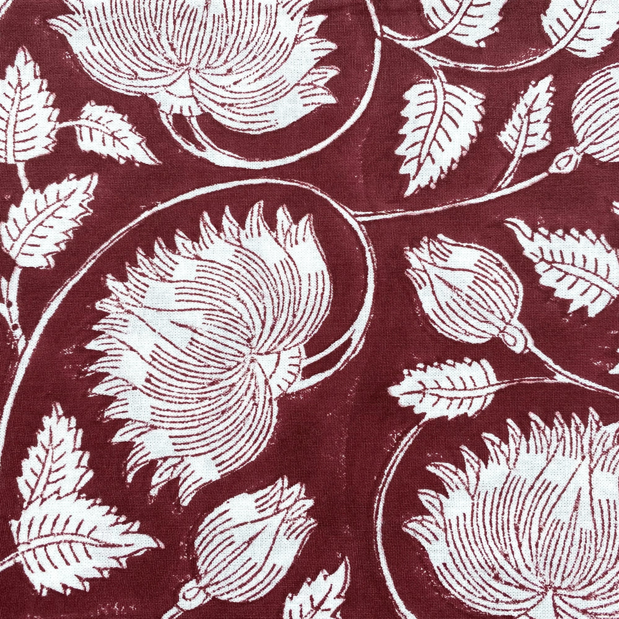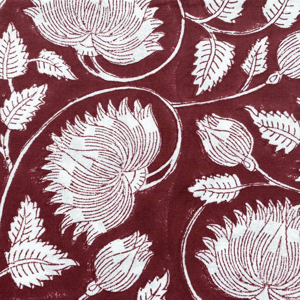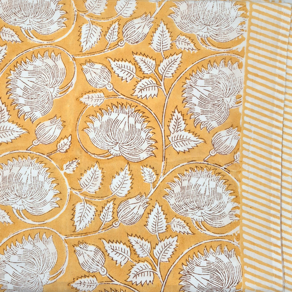 Indian artisanal craftsmanship is one of the cornerstones of our collection, and block print is one of the core products. Done by hand, there is huge variety in patterns and colours. The Lotus print is a classic, and we currently have several colours on a white background. The tablecloth is finished with a striped edge.