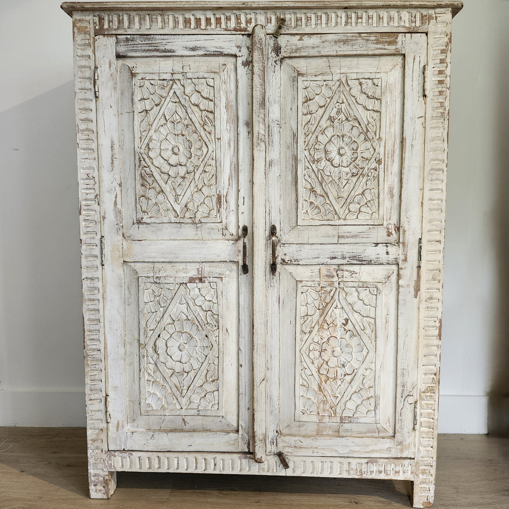 A delightful hand-carved cupboard in mango wood, with a whitewash finish. The cupboard doors have four panels, with floral carving, and there is further carving on the edge of the panels.