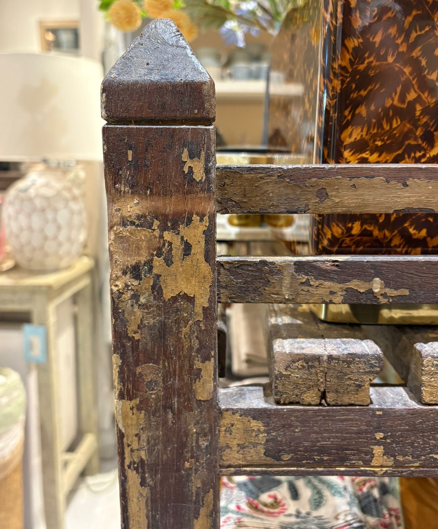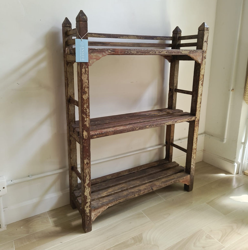 Perfect for use in your guest bathroom, bedroom, or living space, this three-shelved structure is charming and functional. Vintage and made entirely from teak, it shows its age and allure through its unique finish — dark wood lightly painted grey — and intriguing woodwork. Use decoratively by placing lamps, pictures, and trinkets on it's spacious shelves, or functionally by filling it with towels, bedding, and clothing.