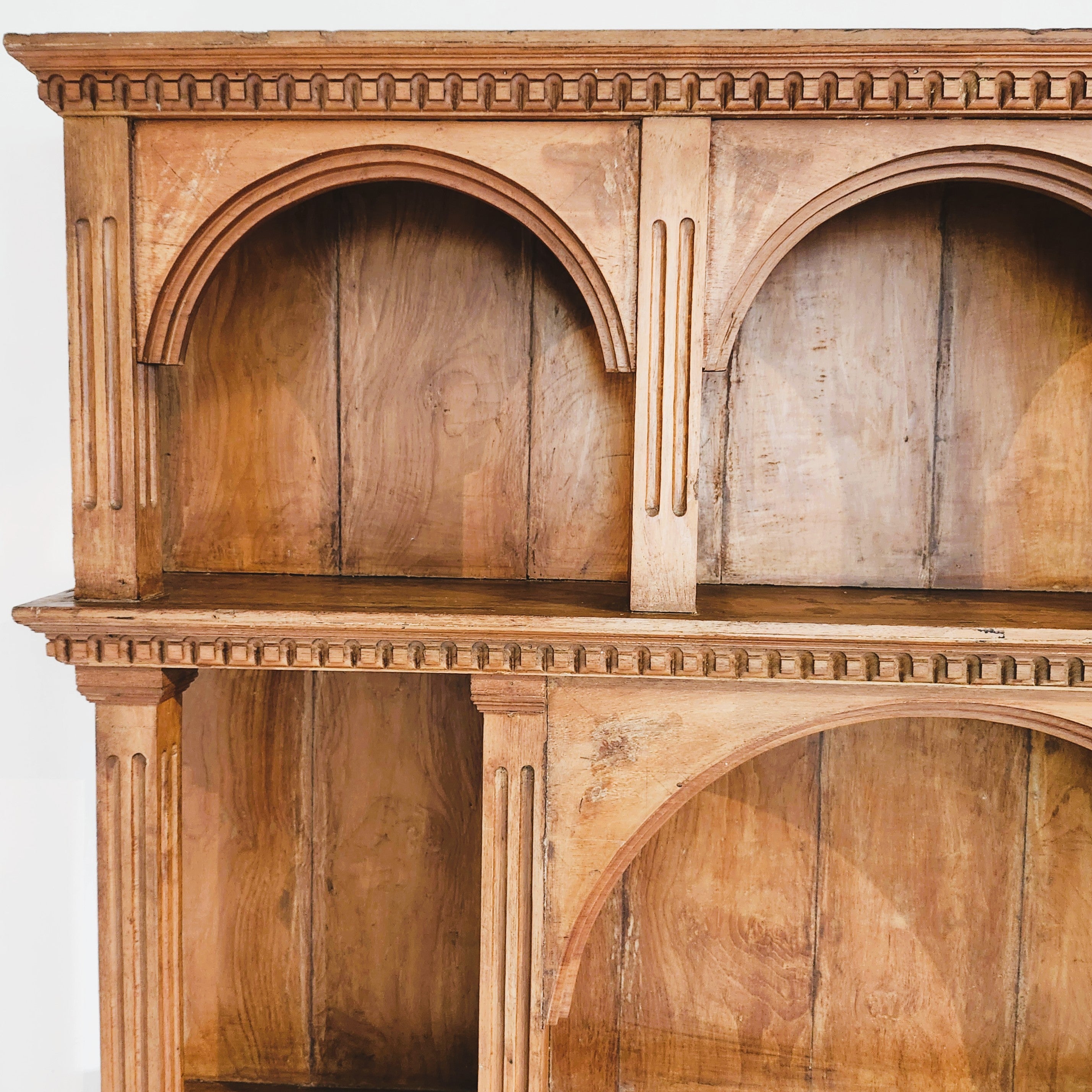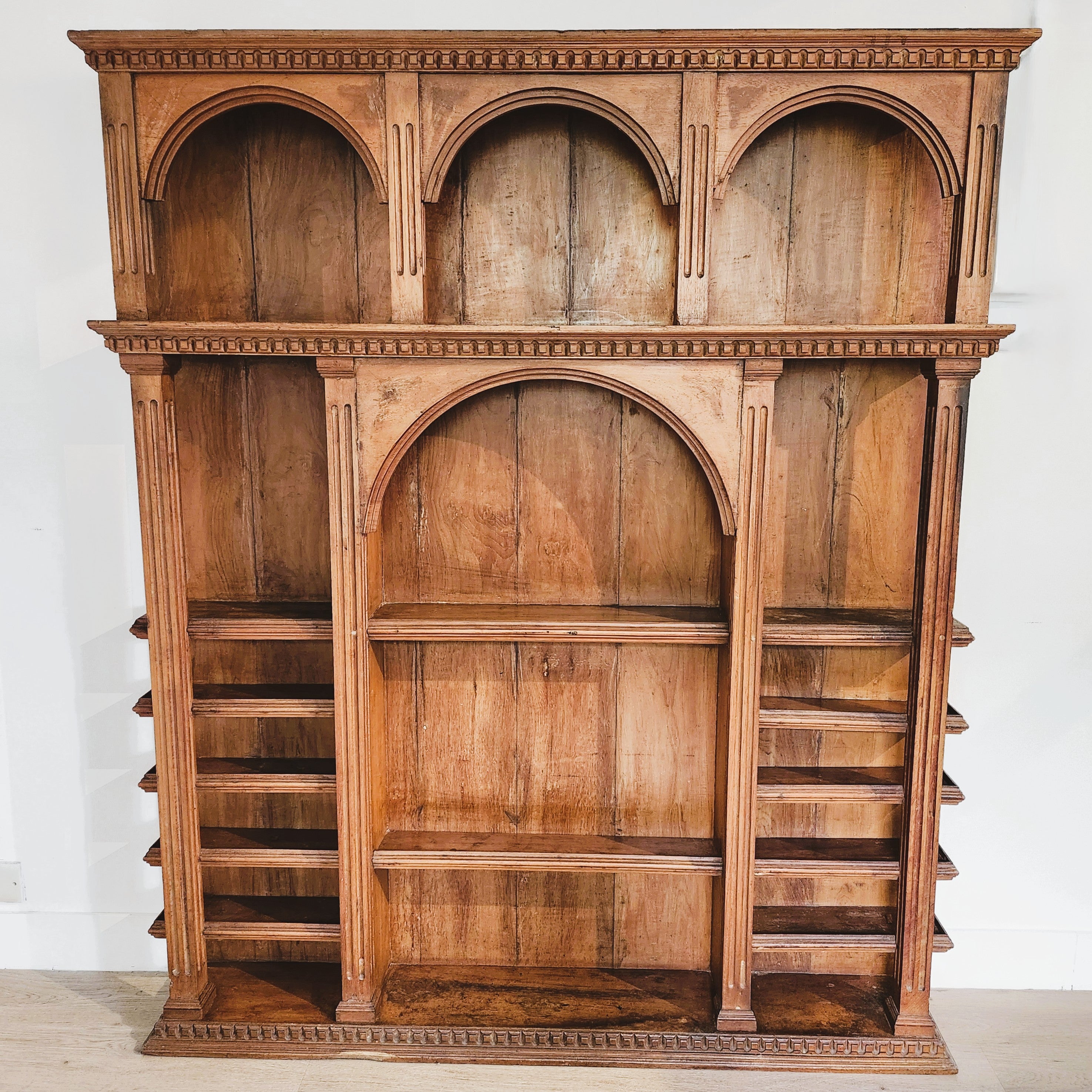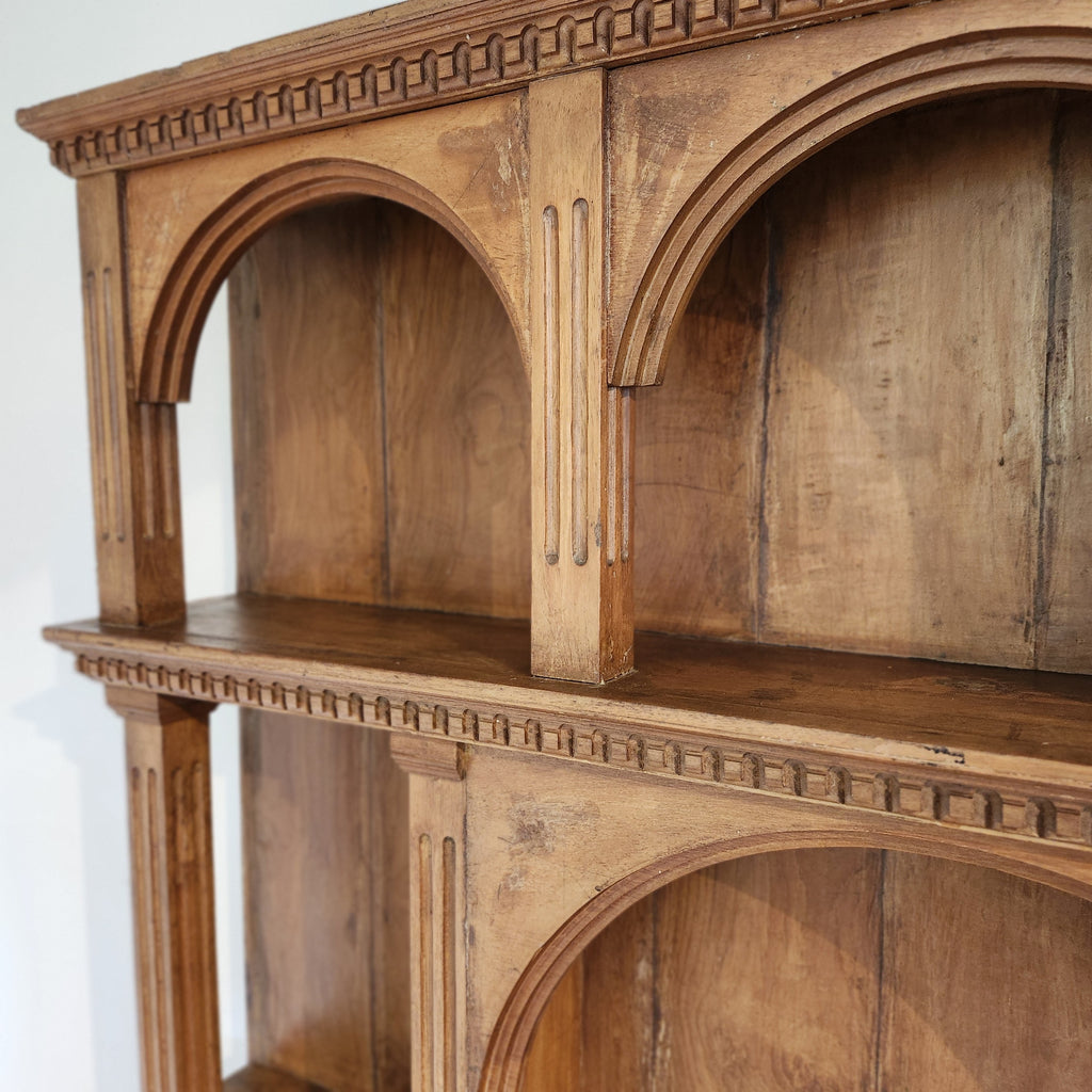 An unusual bookcase or display unit, with detailed carving. It has been made from teak, in a natural finish.