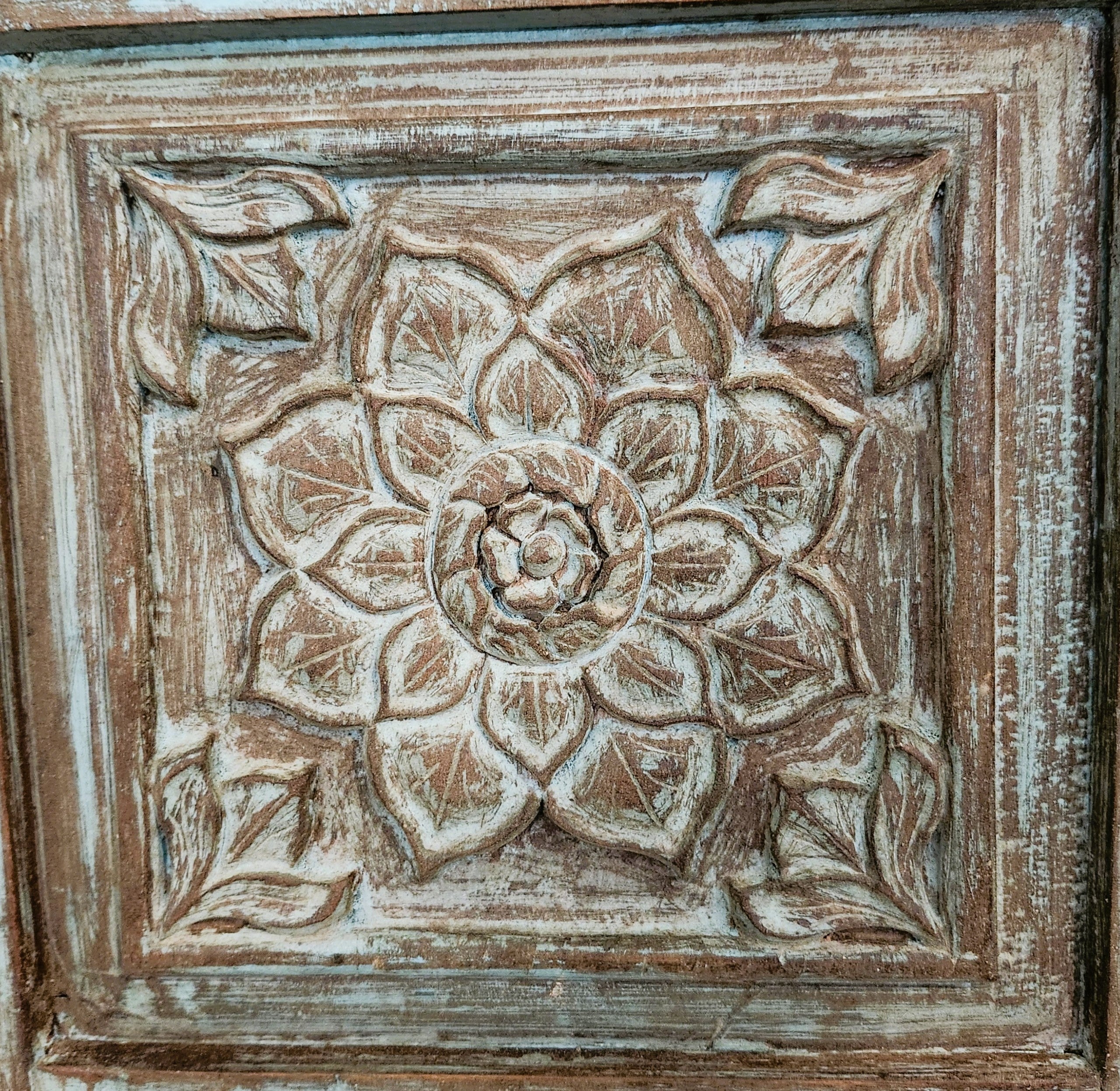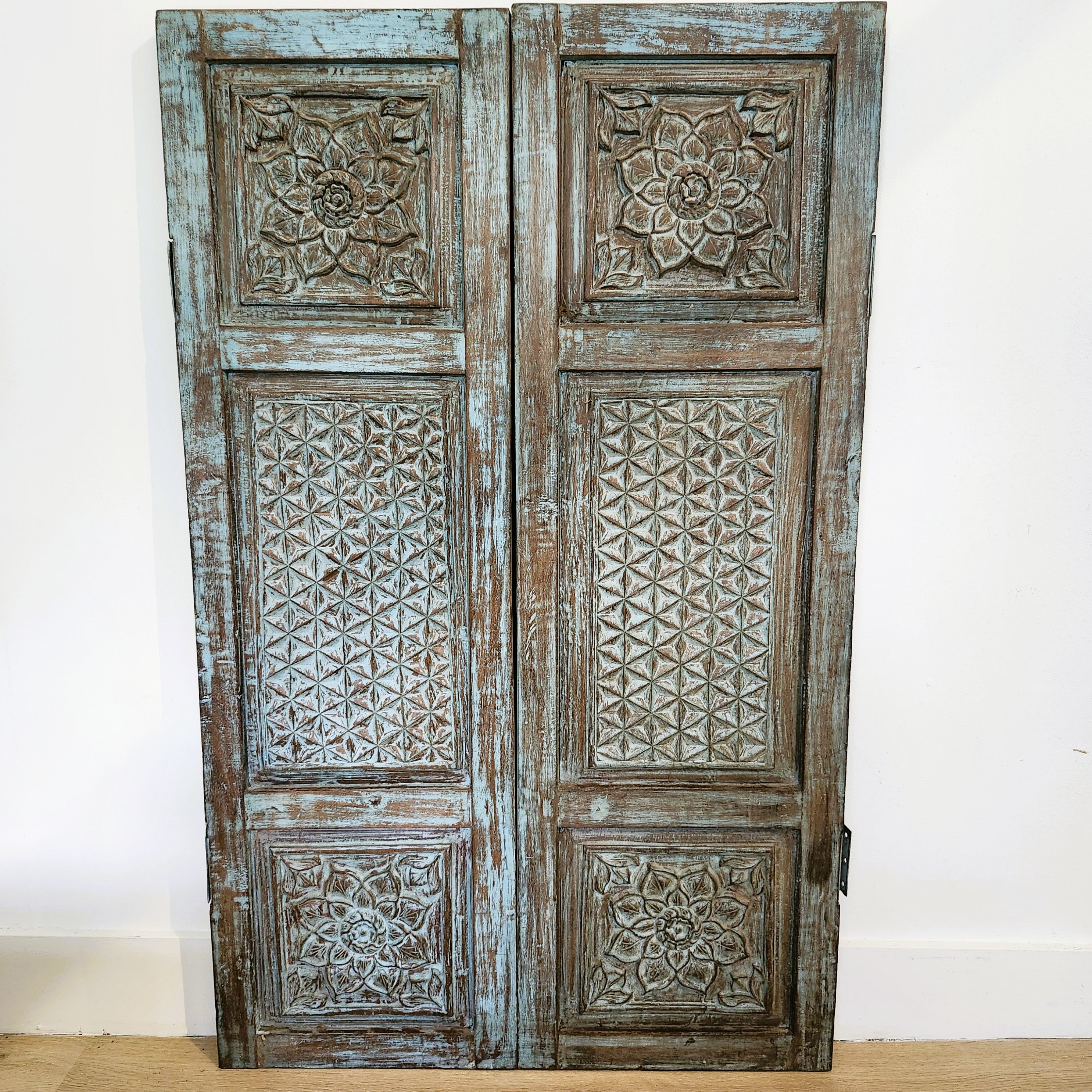 We have a gorgeous pair of vintage Indian window shutters, with beautiful carving and a distressed paint finish. They are pieces of art and can be used decoratively in a living room or hallway. Each piece is approximately 42.5cm wide.