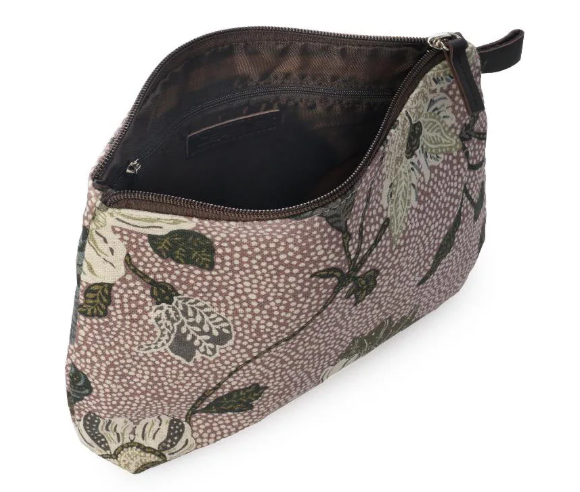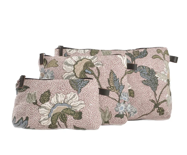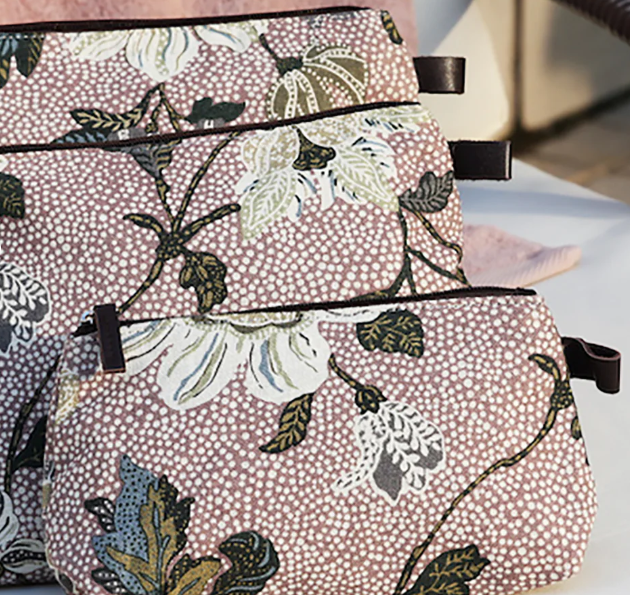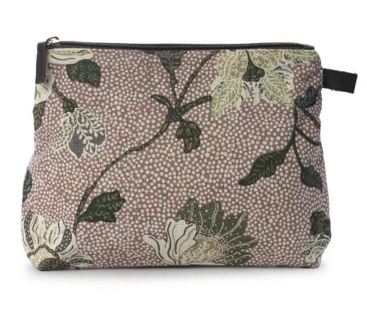 These high quality cosmetic or wash bags feature Ceannis's iconic Flower Linen fabric in dusty pink on the outside.  The bags have a zip closure, and the interior is lined in waterproof nylon, with an open pocket and a zipped pocket.  Available in 3 sizes, small, medium and large.  The small is perfect as a make-up bag, and the large is generously proportioned and could fit all you need for travel!