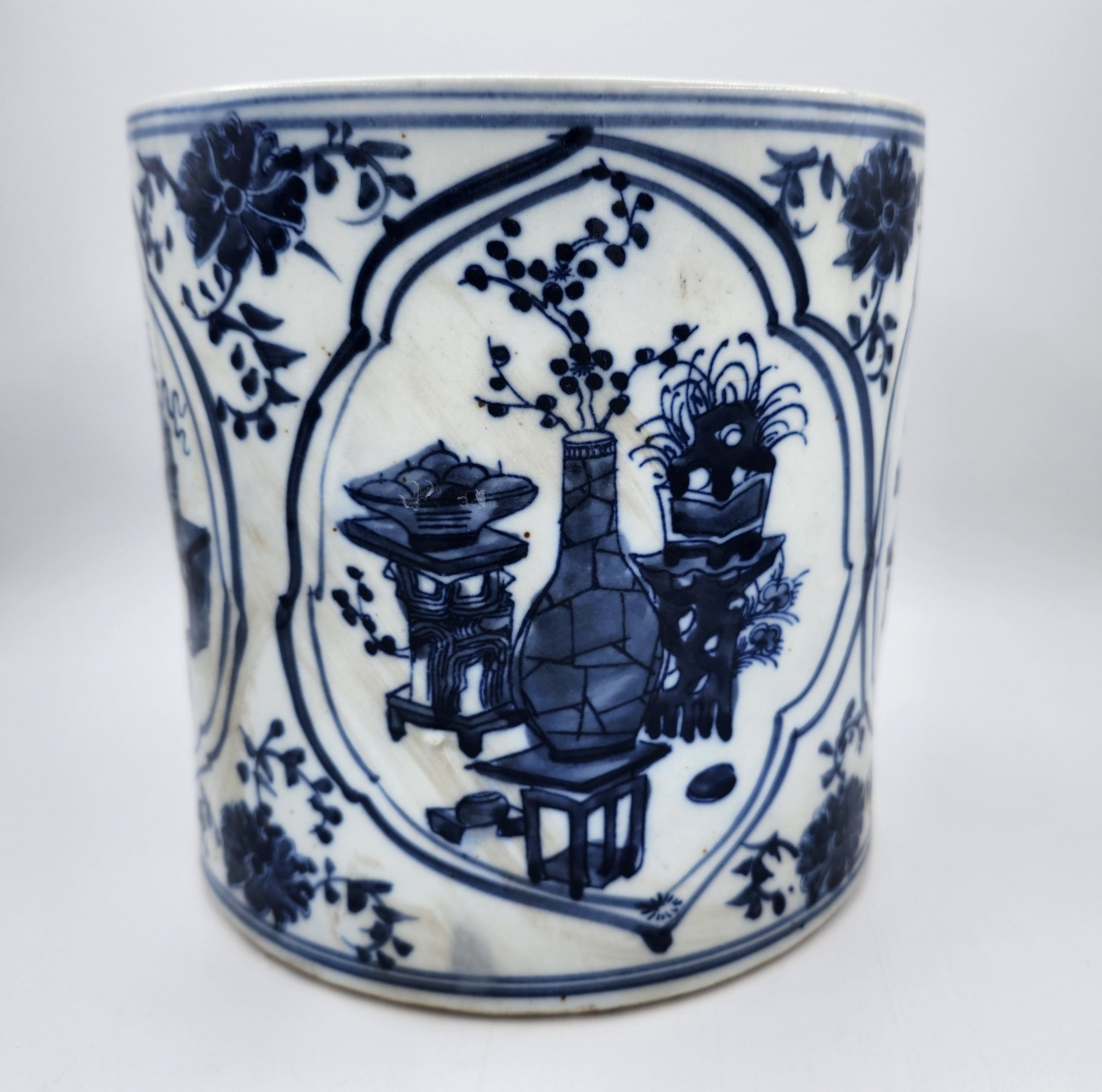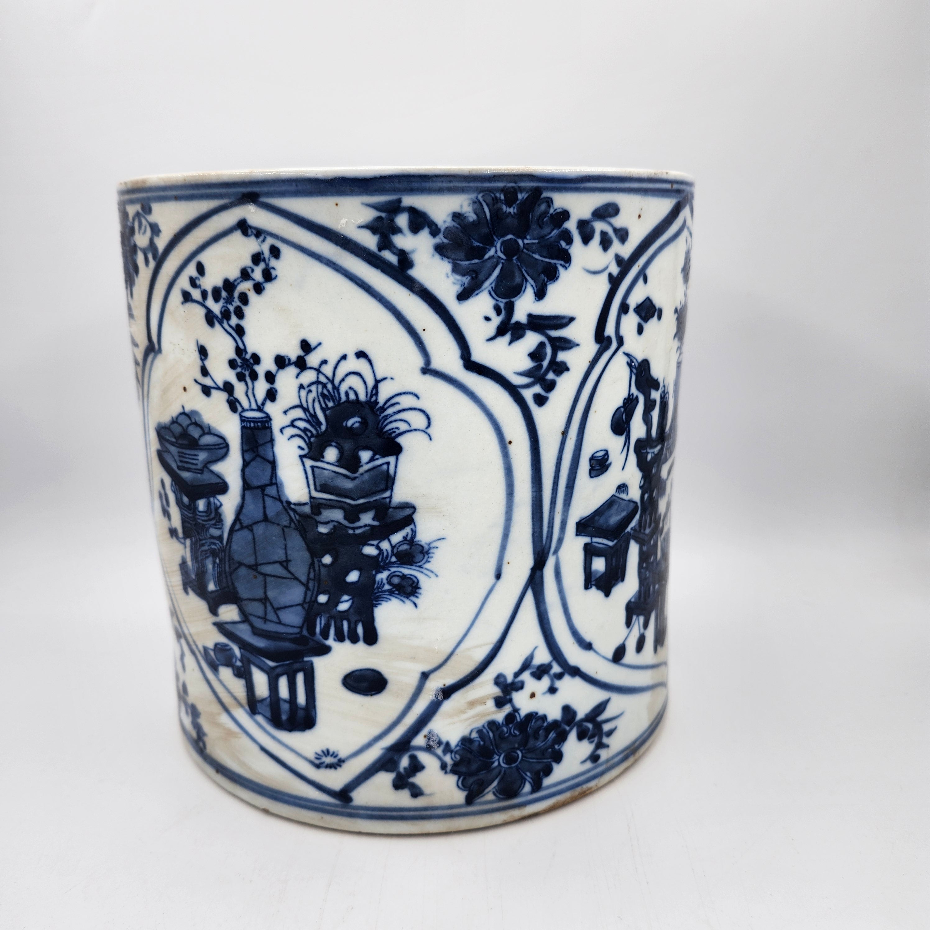 A magnificent cylindrical pot, with a blue and white hand-painted design, featuring a cosy domestic setting. This is a vintage piece, with some signs of age.