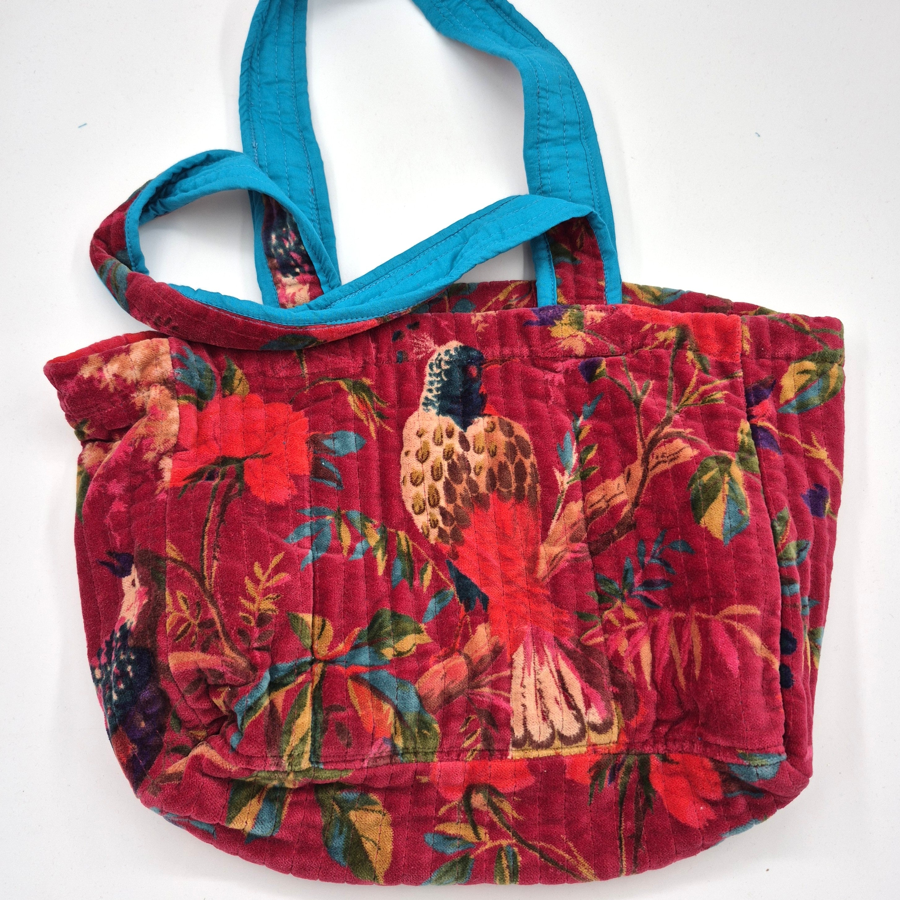 These quilted velvet bags are just fun. Featuring tropical foliage and birds they are all a bit different. Measuring 30cm w by 20cm high (excluding handles) large enough to carry your daily essentials, but small enough for a night out.