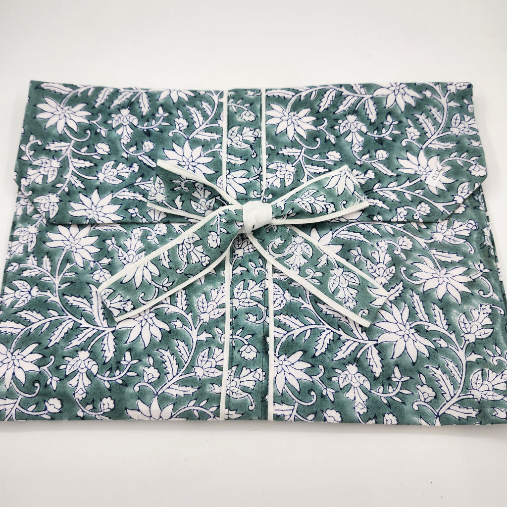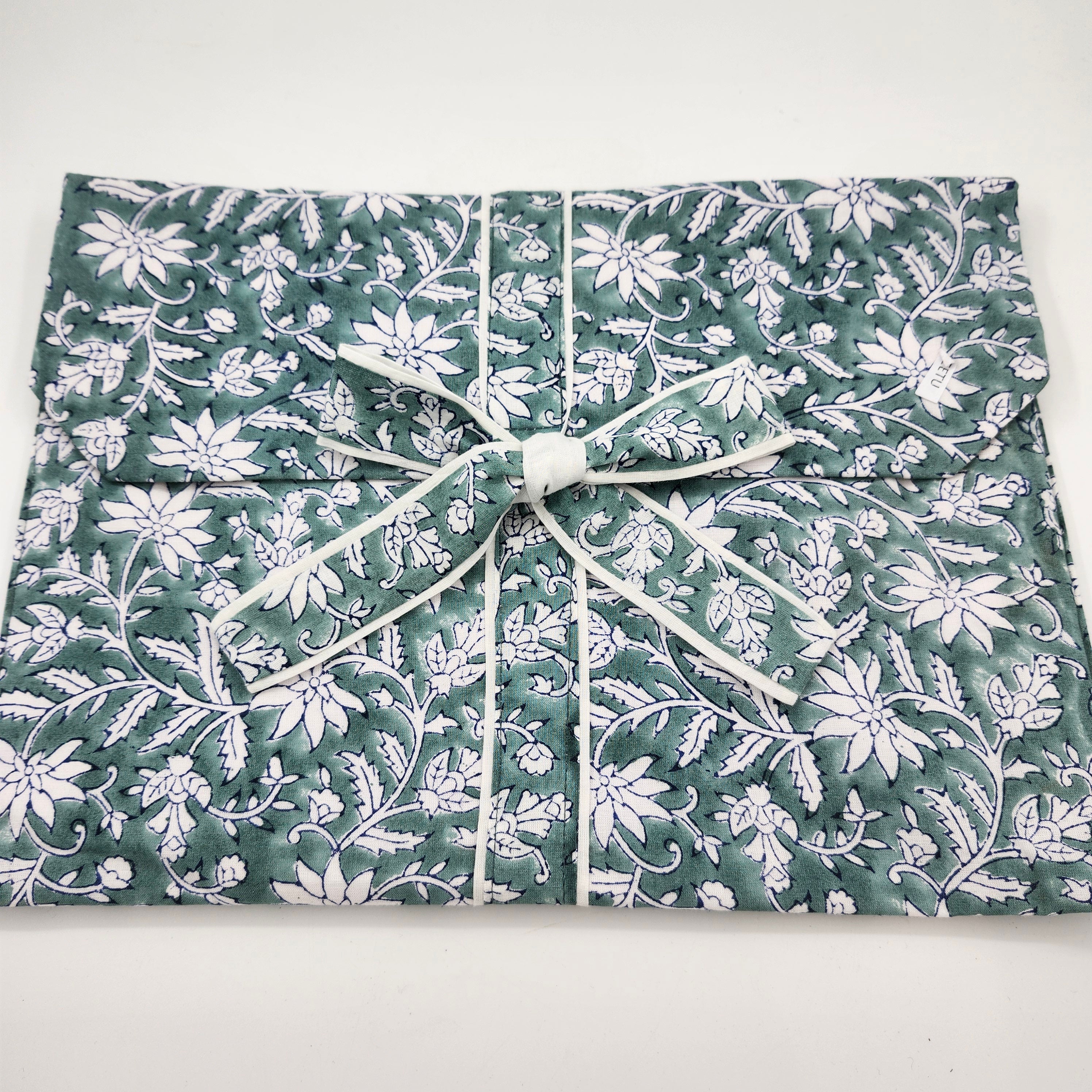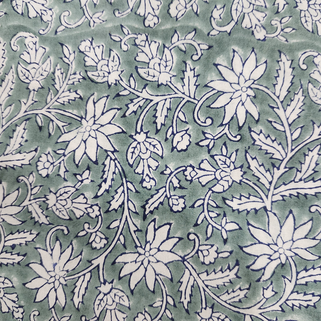 A traditional floral block print of white flowers on a teal background.