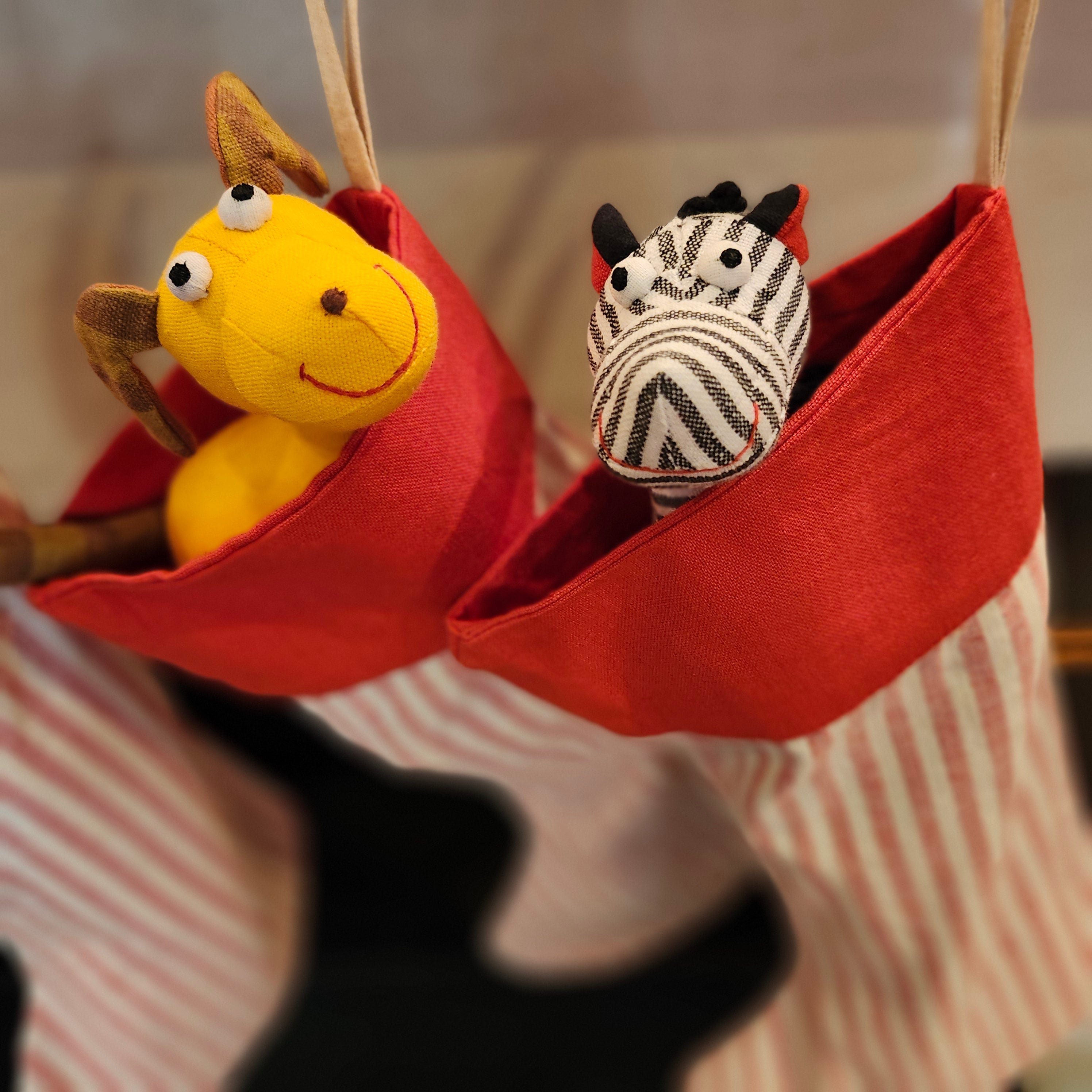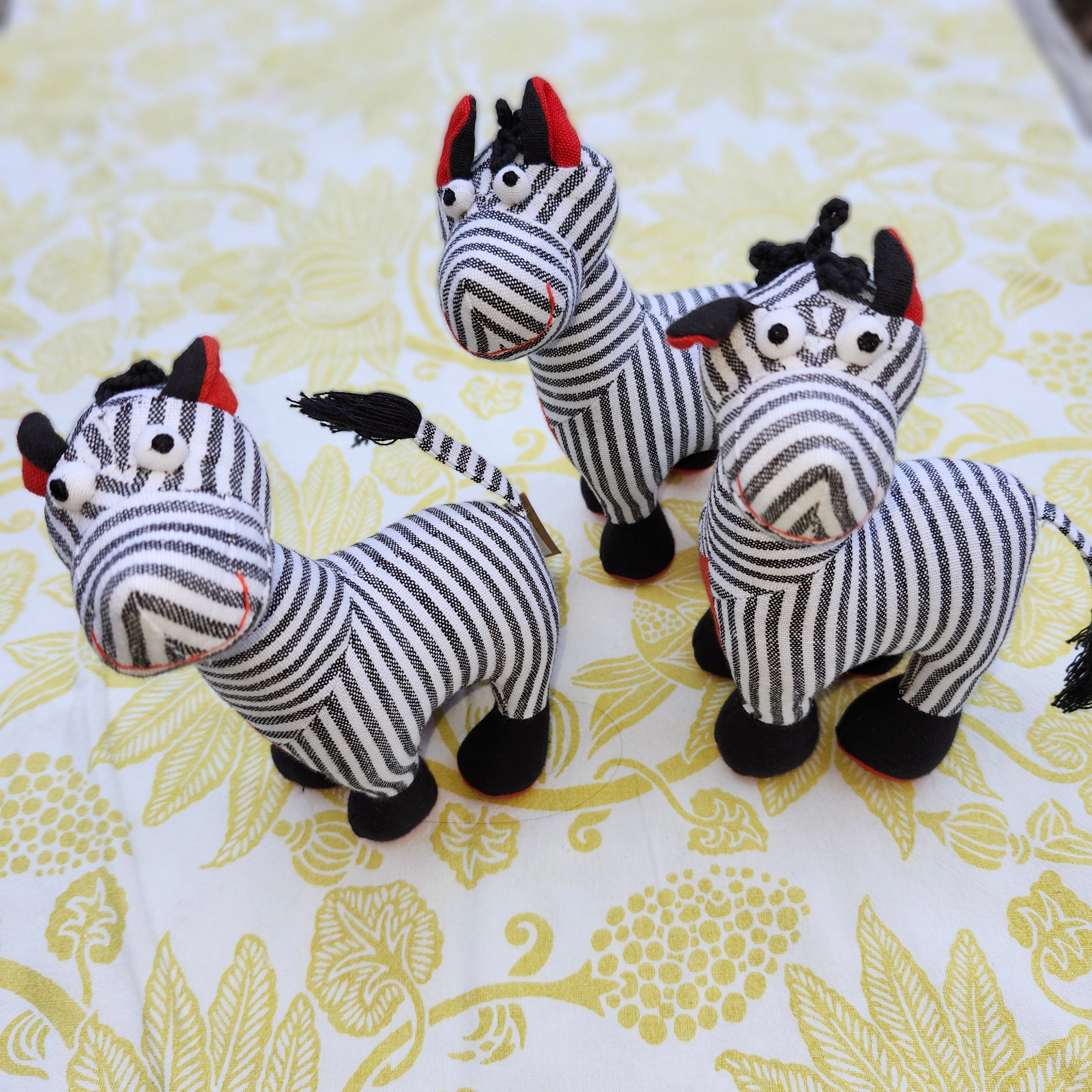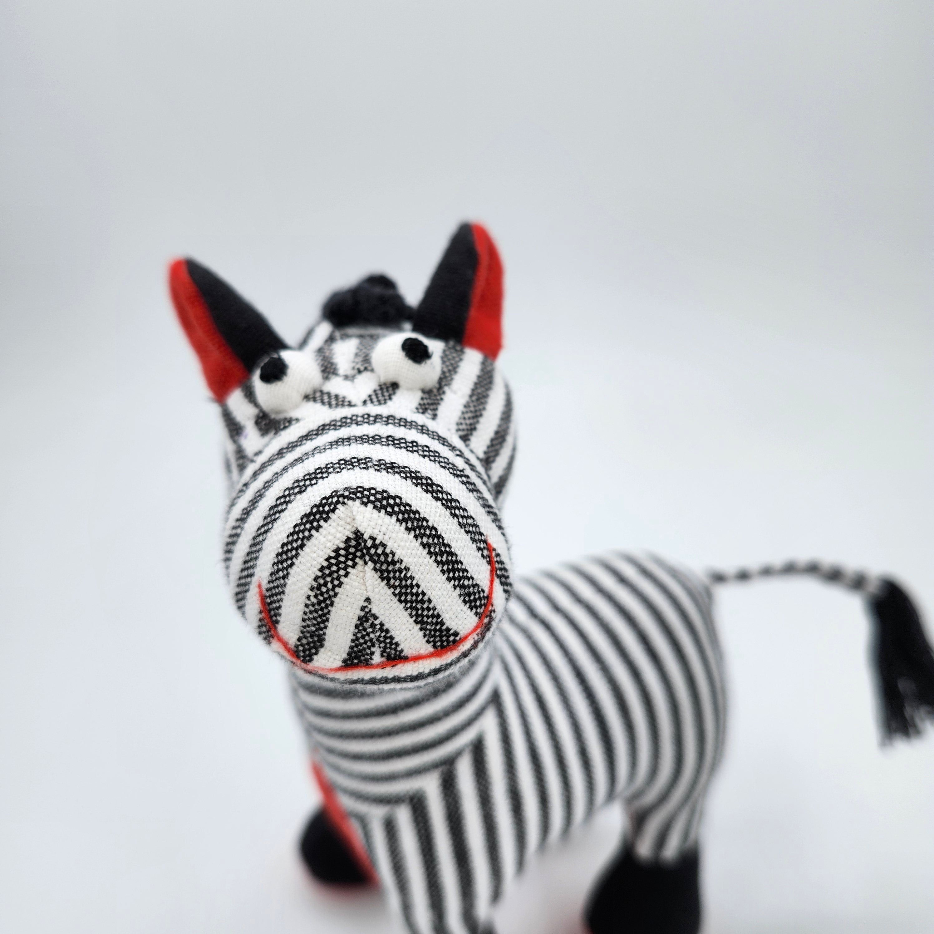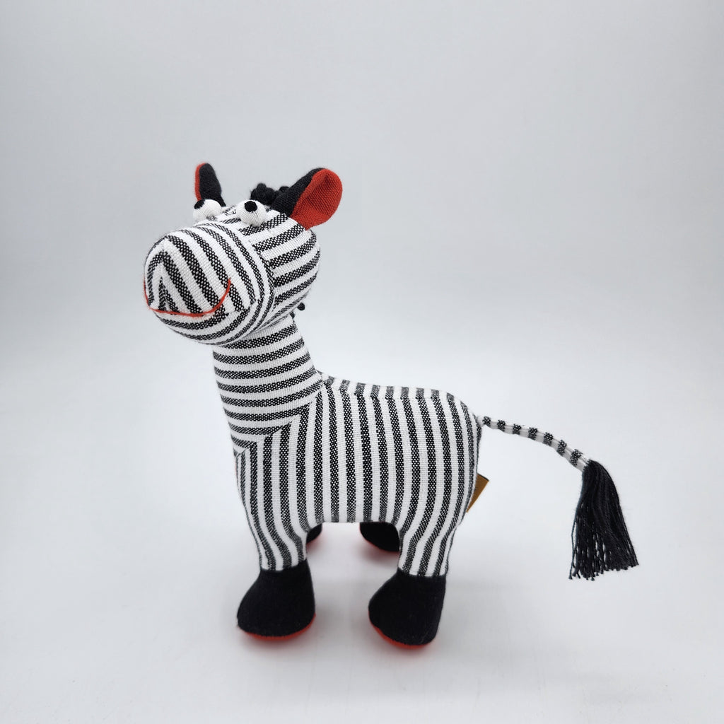 Ziggy the Zebra's happy and curious face is sure to bring delight to any child. Hand-made with handwoven 100% cotton fabric.