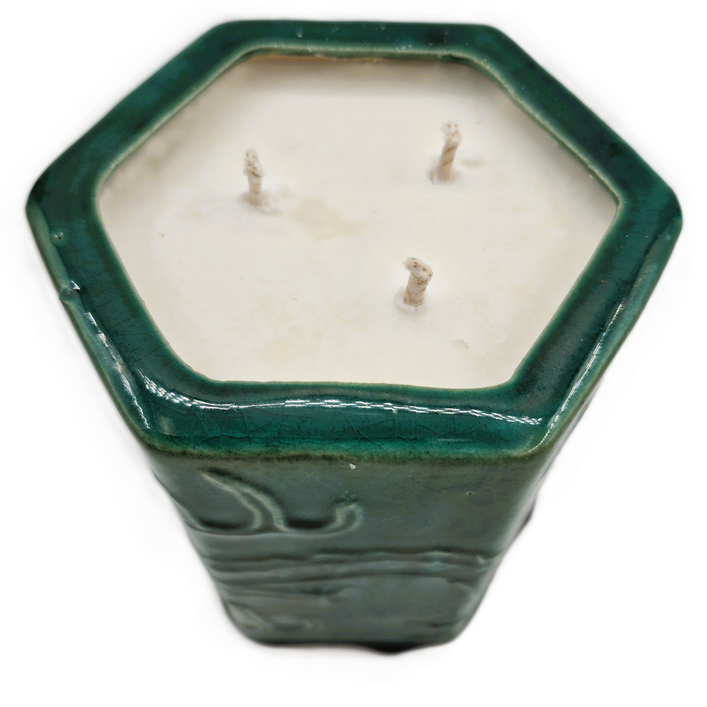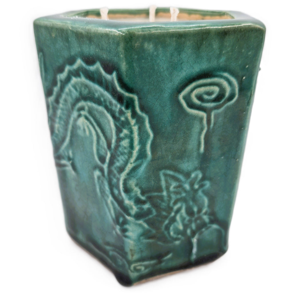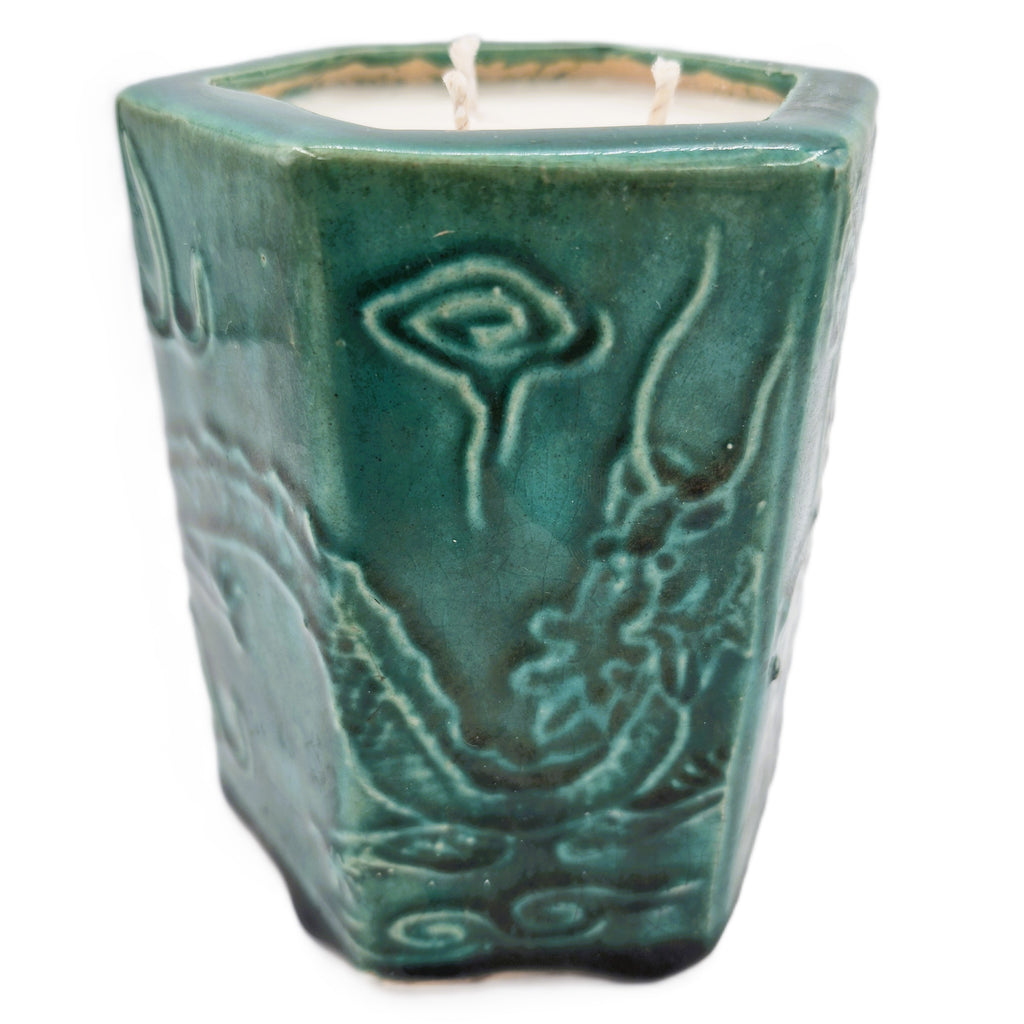 A Hexagonal Pot glazed in a deep emerald, with a dragon and cloud symbols around the outside. It has been filled with the Big Wave Bay scent.