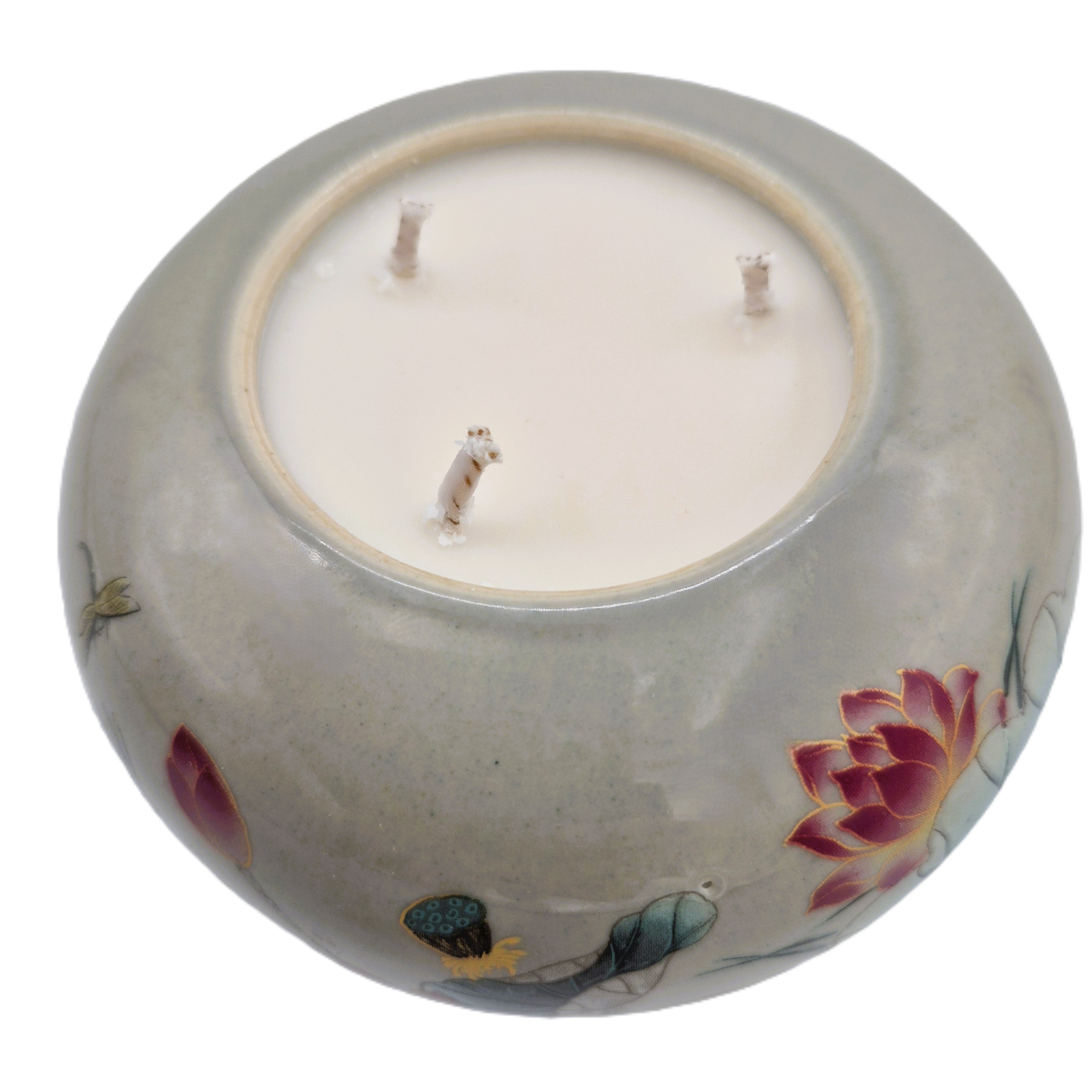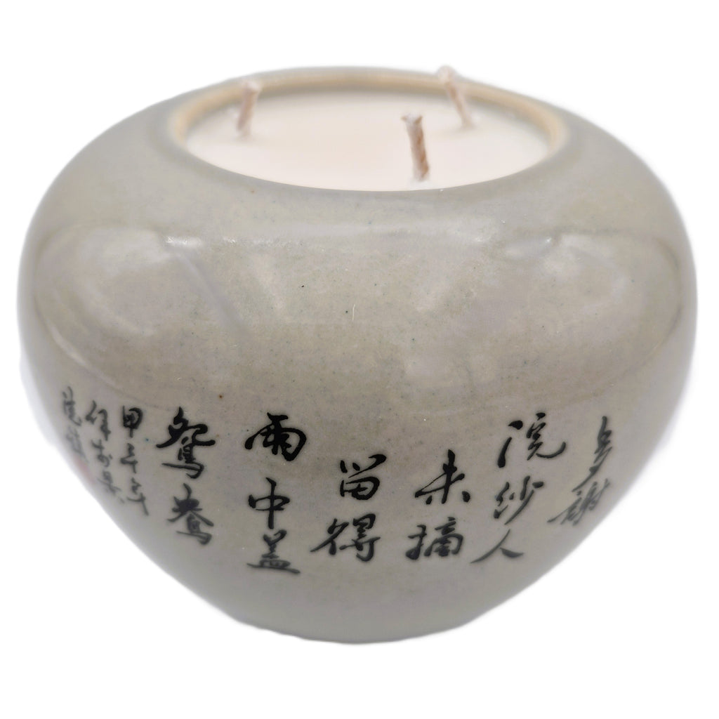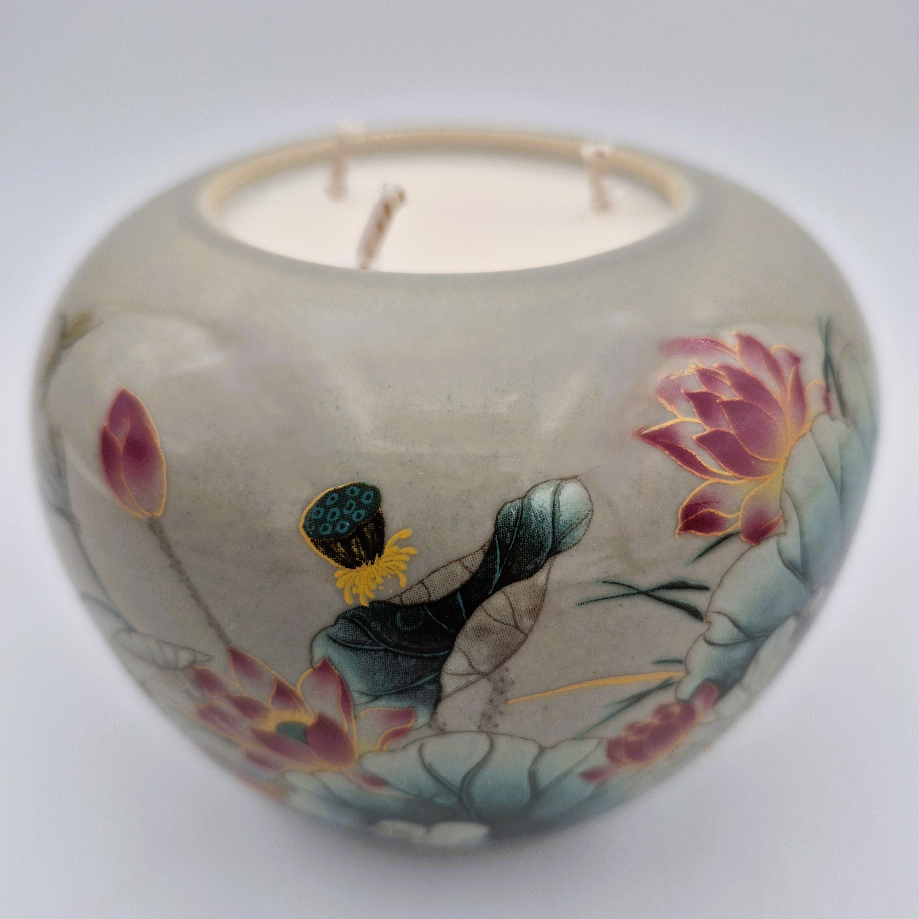 A scented candle in a small porcelain jar, depicting a finely detailed lotus pond. on one side, and calligraphy on the back. Available in two scents, and packaged in a simple, elegant box.