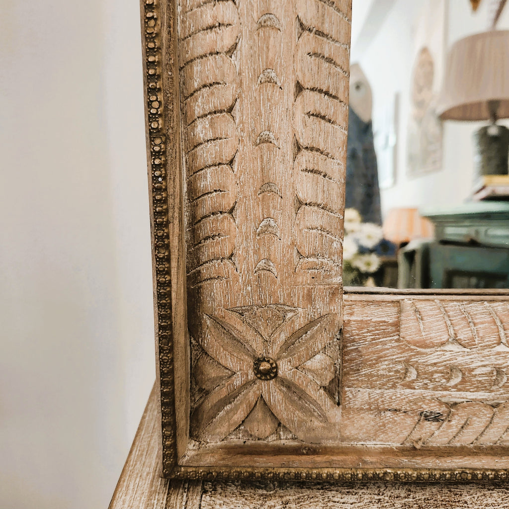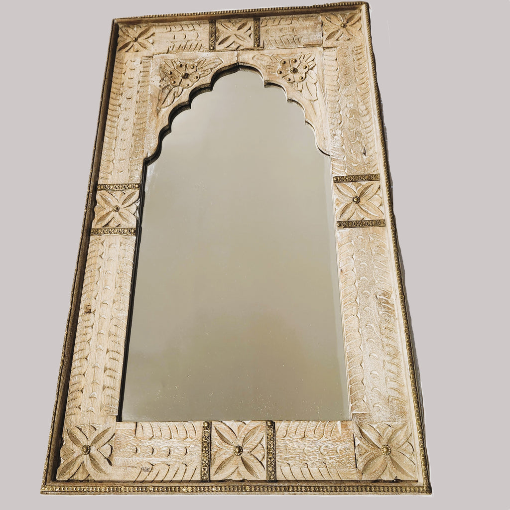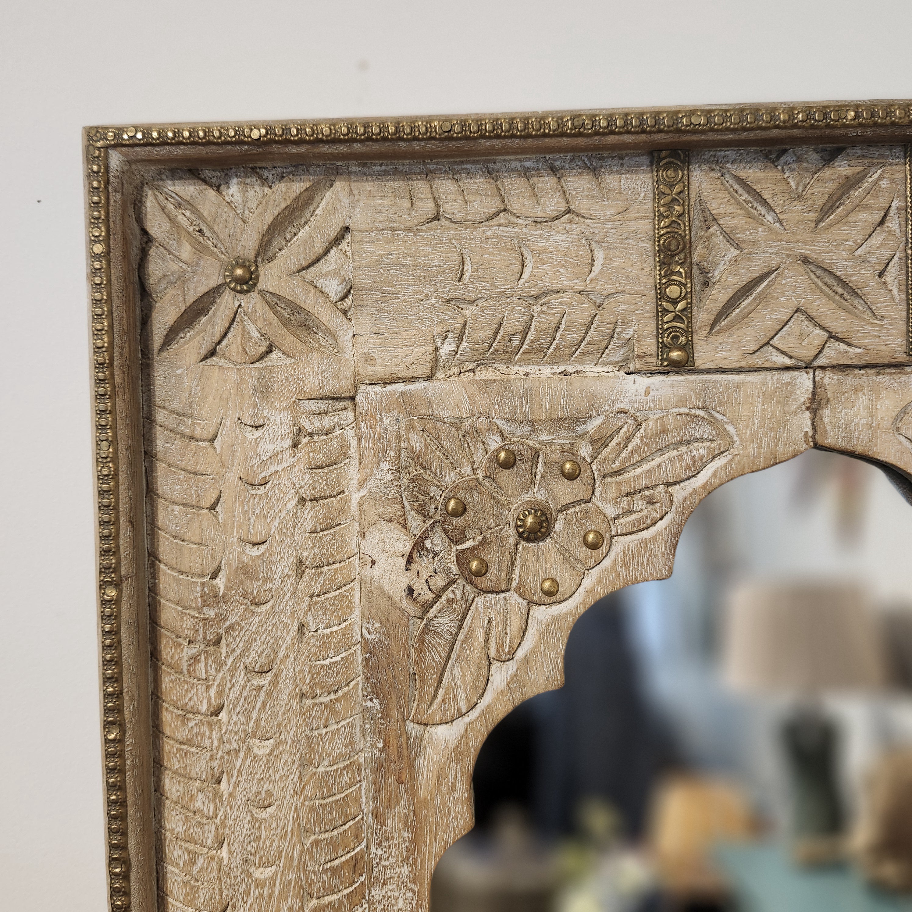 This pretty mirror is made of mango wood and features carving and beading in a Mughal style.
