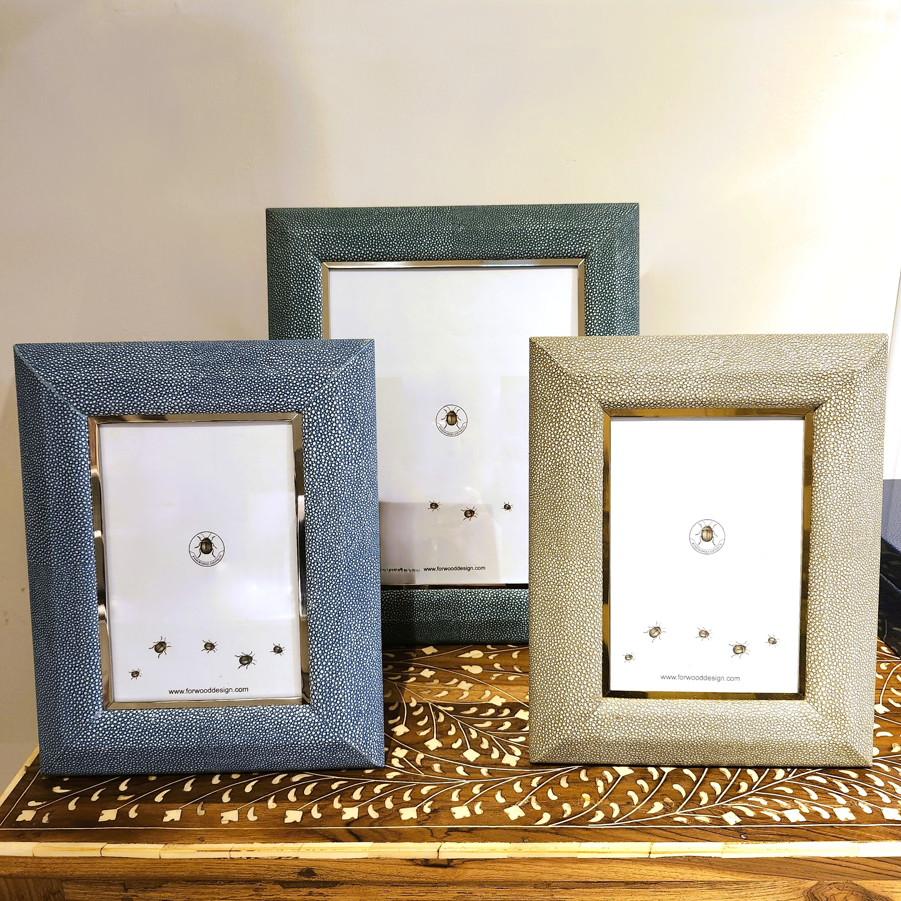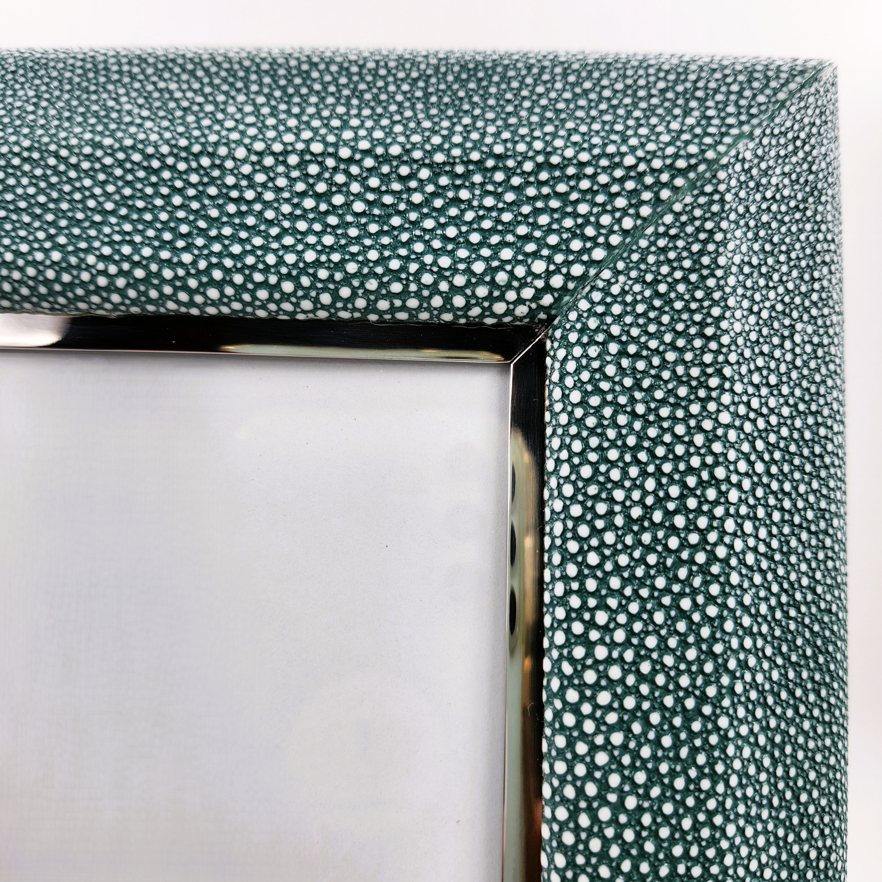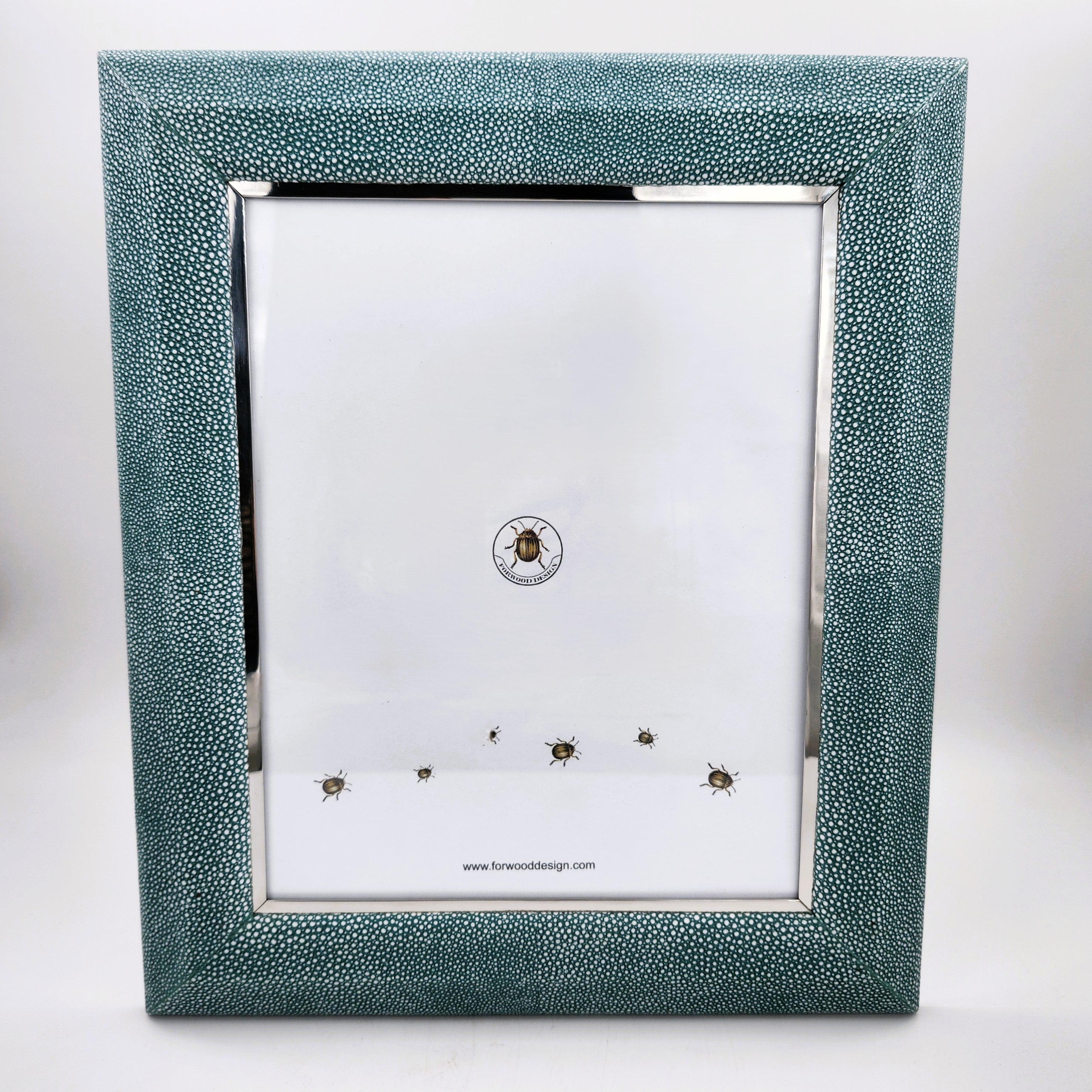 Forwood Design's classic Bella Photo Frame in Teal shagreen is made by craftsmen in faux shagreen with stainless steel trim. The frames frames are beautifully backed with polished walnut wood. The large frame fits 8″x 10″ photos and the small frame holds 7″ x 5″. Both sizes of photo frames work horizontally or vertically.
