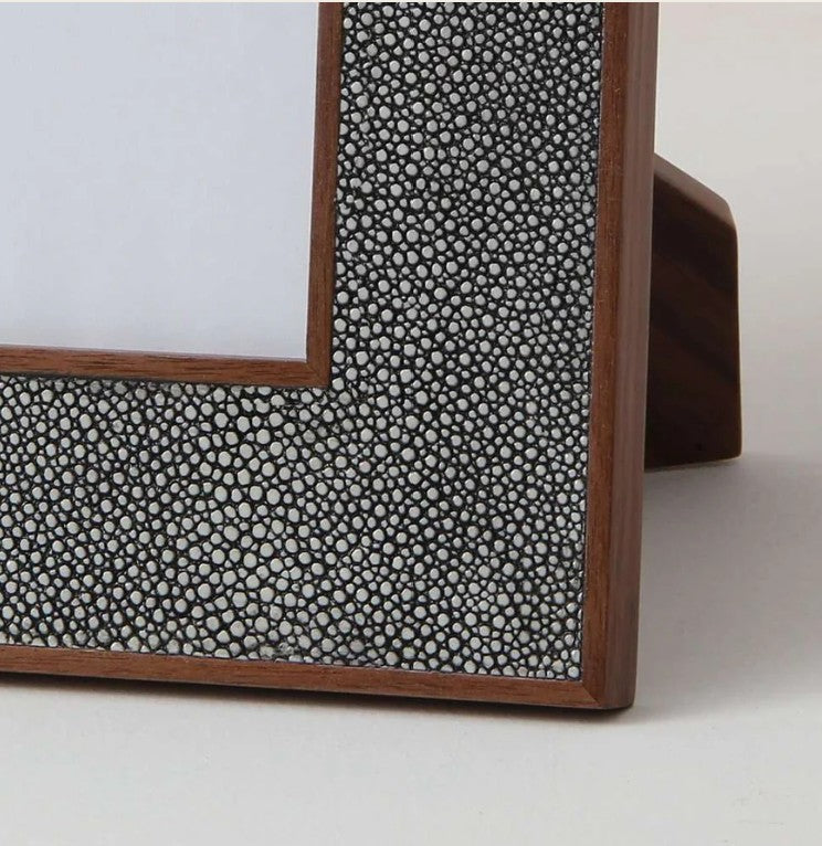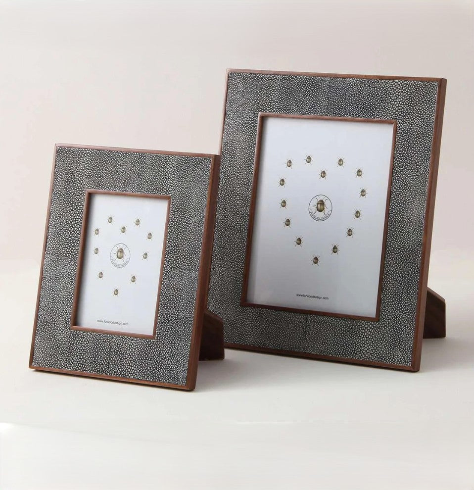 We love Forwood Design's Classic Photo Frames in Charcoal Grey designer shagreen. The large size fits standard 8 x 10″ photos and the small fits 5 x 7". The frames are covered with their unique faux shagreen and beautifully backed with polished walnut wood. The frame can be placed horizontally or vertically. Henry Forwood invented the process to make this unique faux shagreen because he loves the luxurious texture of this exotic leather.