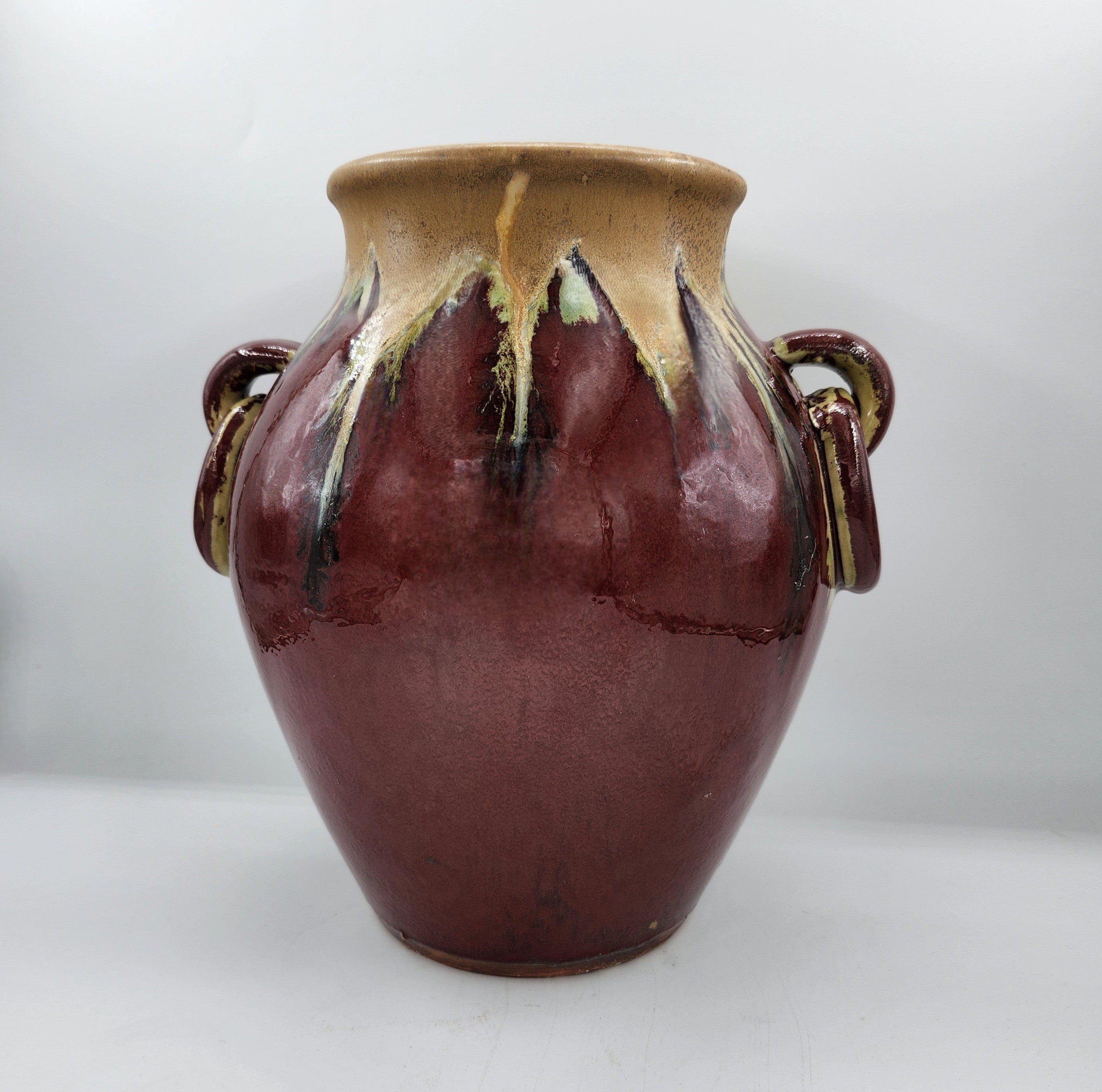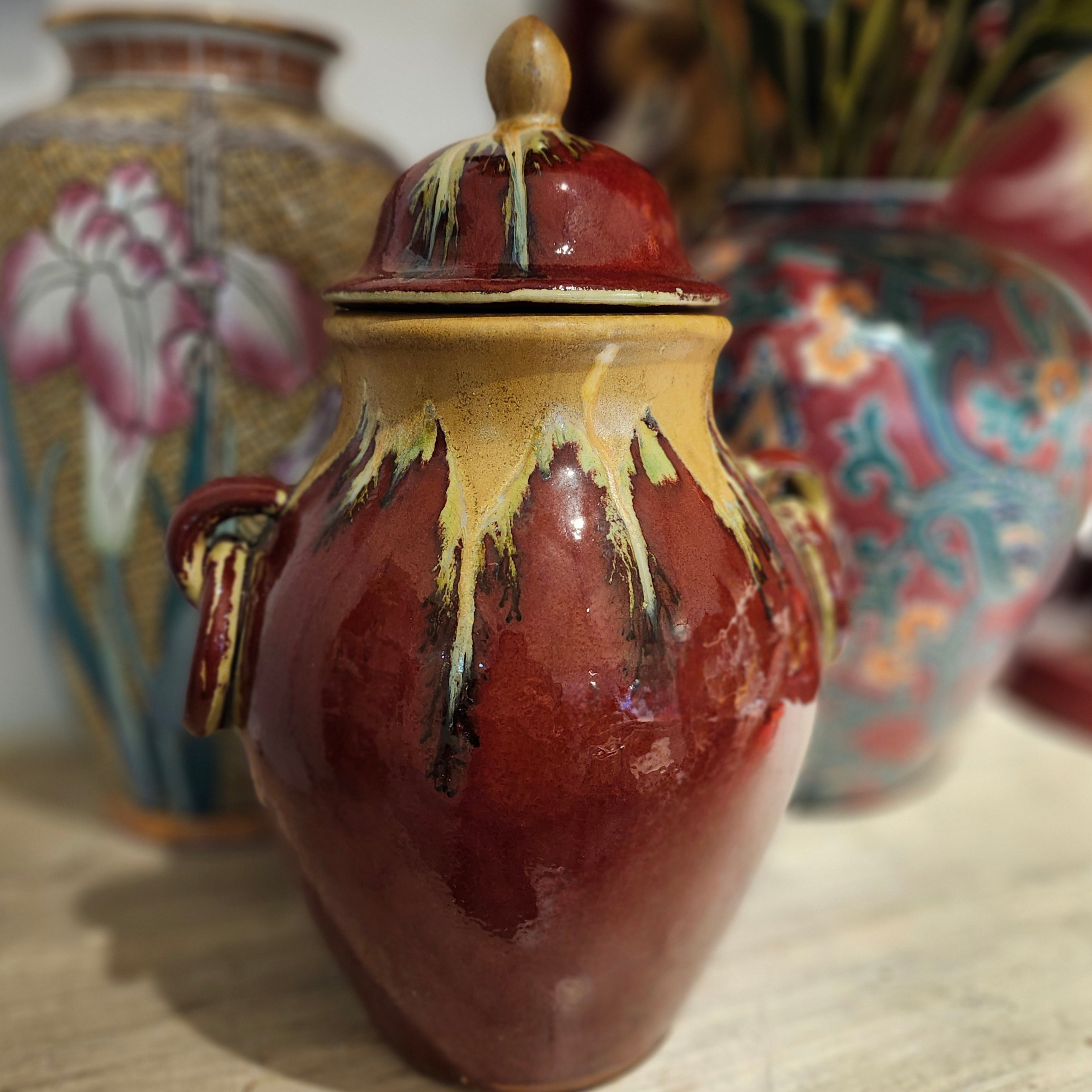 A glazed ceramic vintage pot with a lid, which could be used as a vase, or just as an ornament.  The pot has two handles, and is glazed in a deep red, with an umber collar.