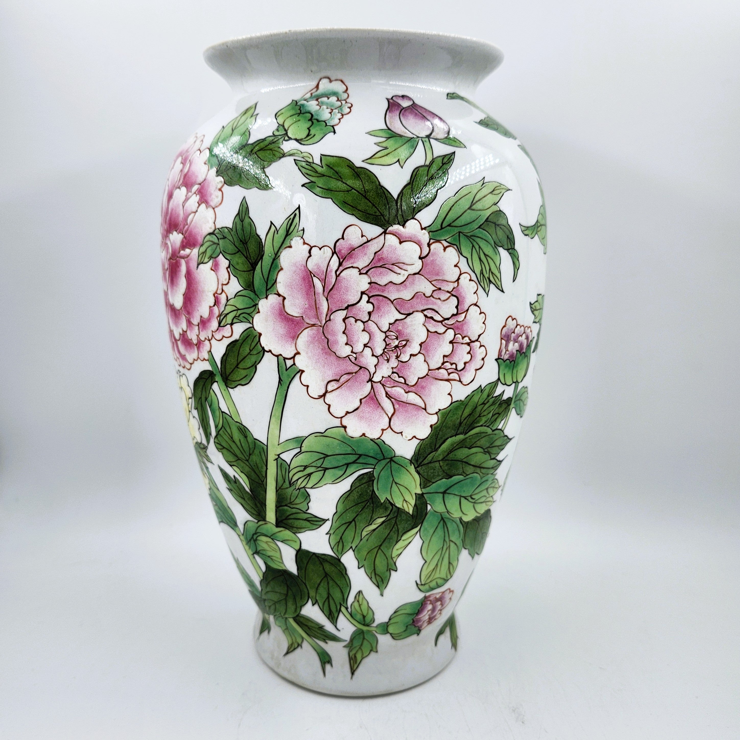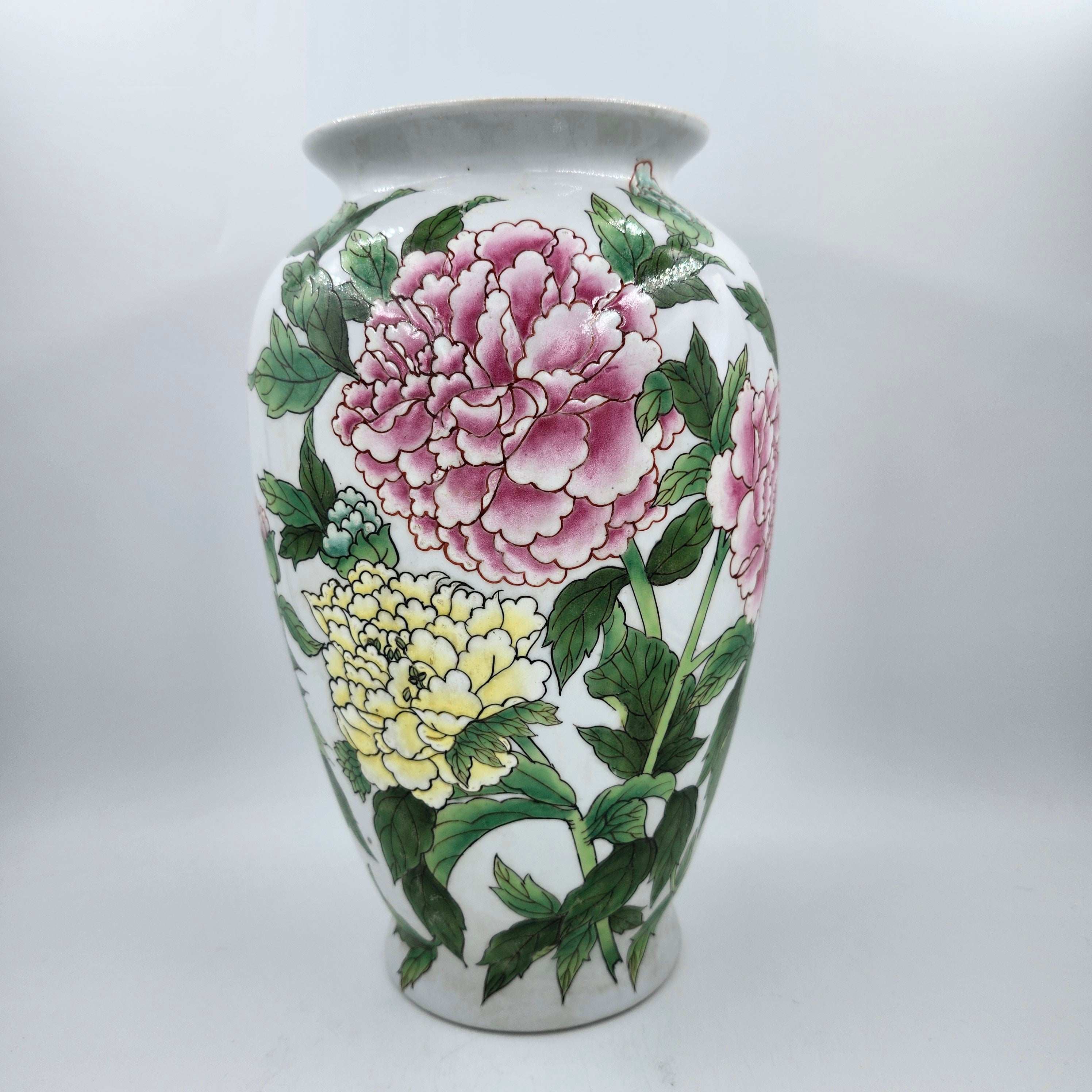 A vintage Famille Rose vase featuring classic pink and yellow peonies against a white background.