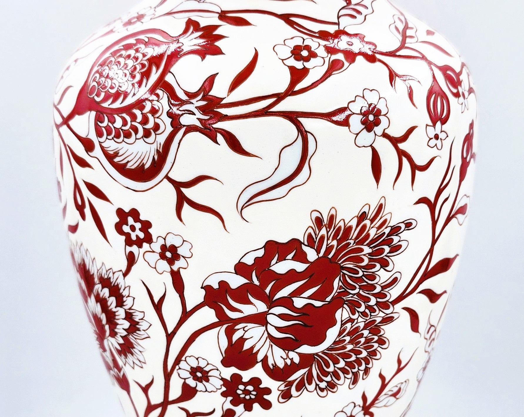 A lovely porcelain vase with red and white flowers and pomegranates, against a cream background. Two available.