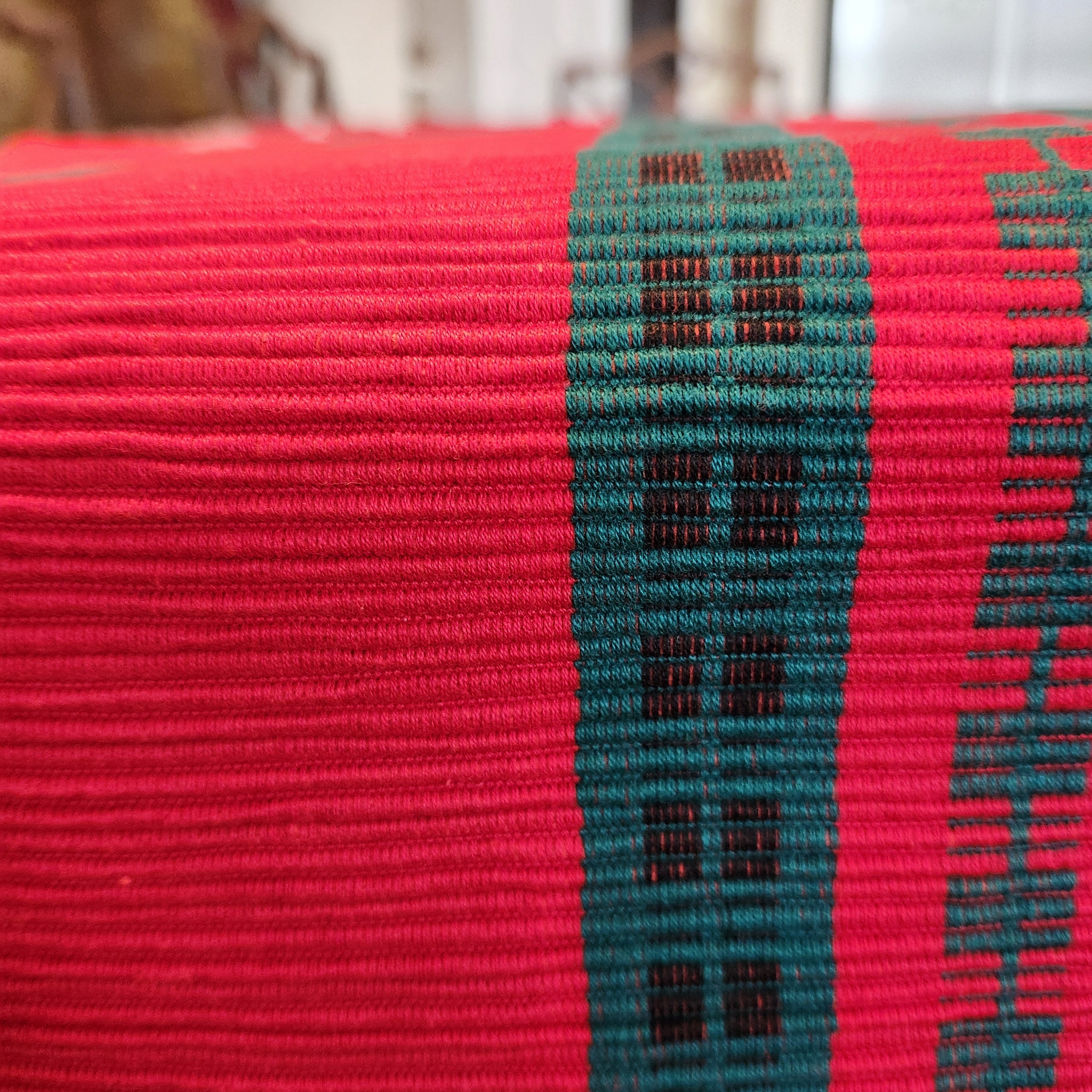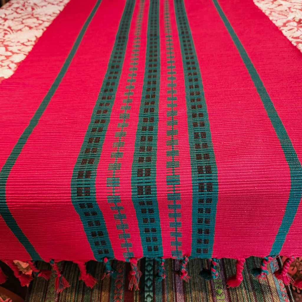 While they will complement any table setting, both casual and formal, the bold red and green would work well for Christmas or the Lunar New Year. This runner can also be used at the end of a bed.