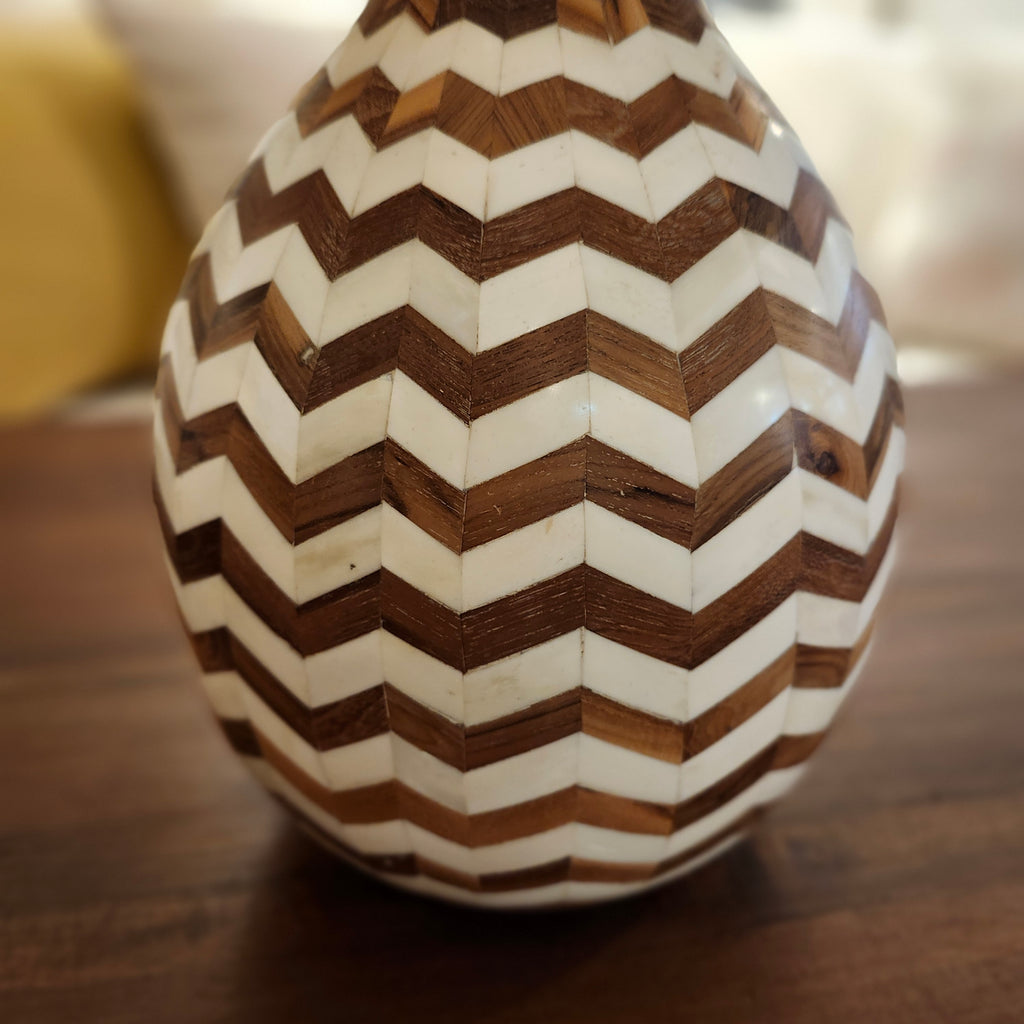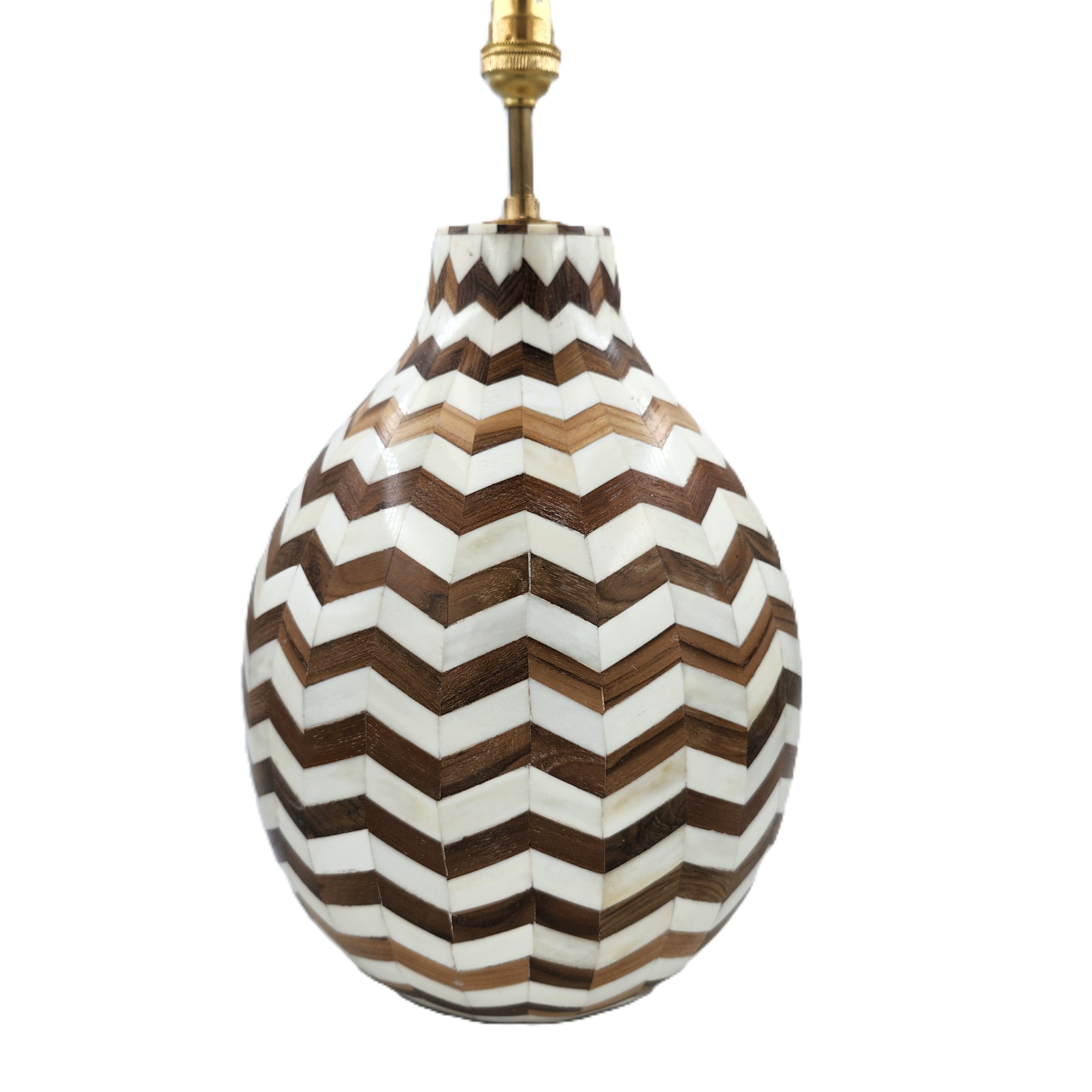 A stunning handcrafted pear-shaped table lamp made from teak with bone inlay. Brass fittings and a standard 3-pin plug.