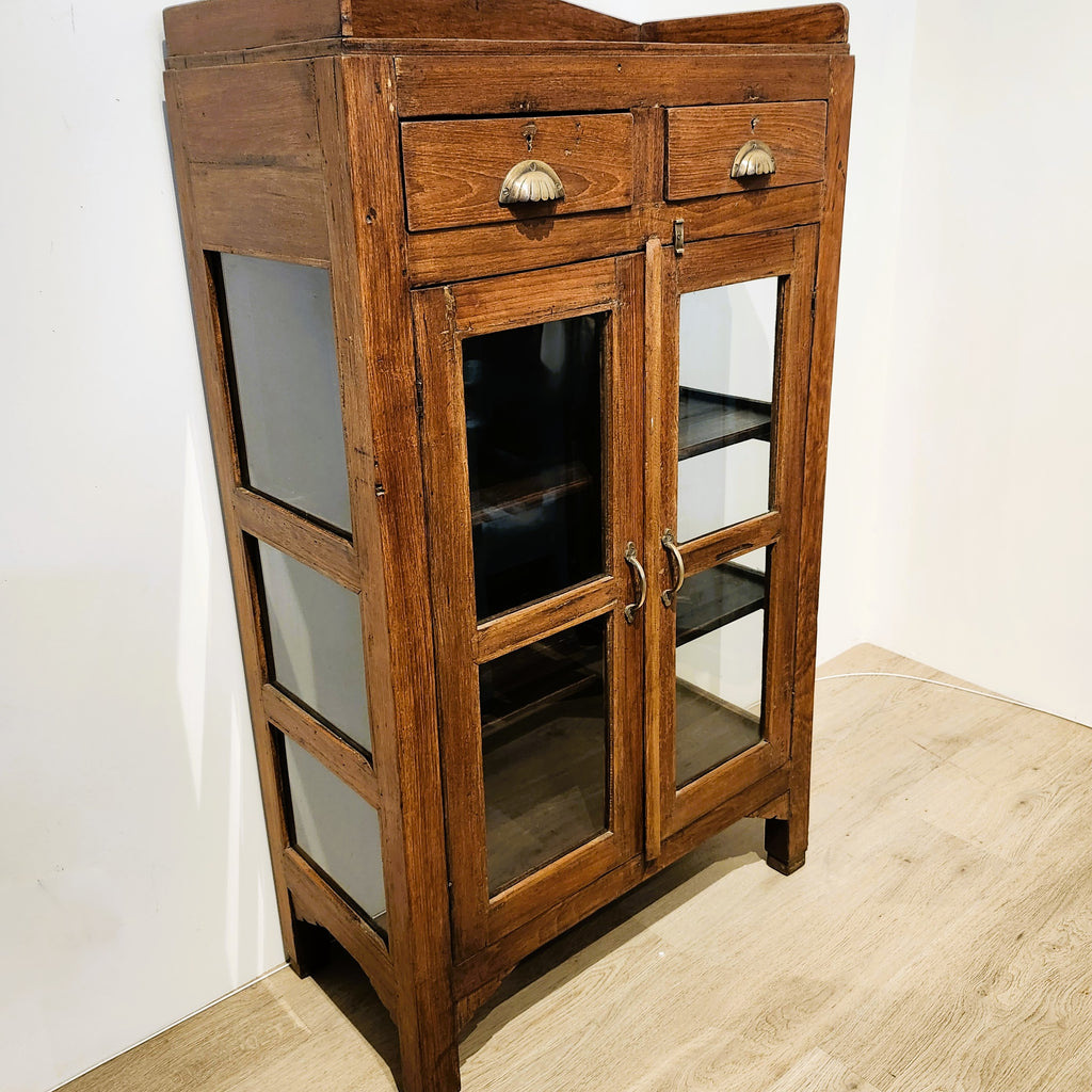 A smaller glass fronted cabinet, with two drawers at the top with brass handles. It has been made from teak, in a natural finish. Use for storing books, kitchenware, linens, tableware or ornaments.