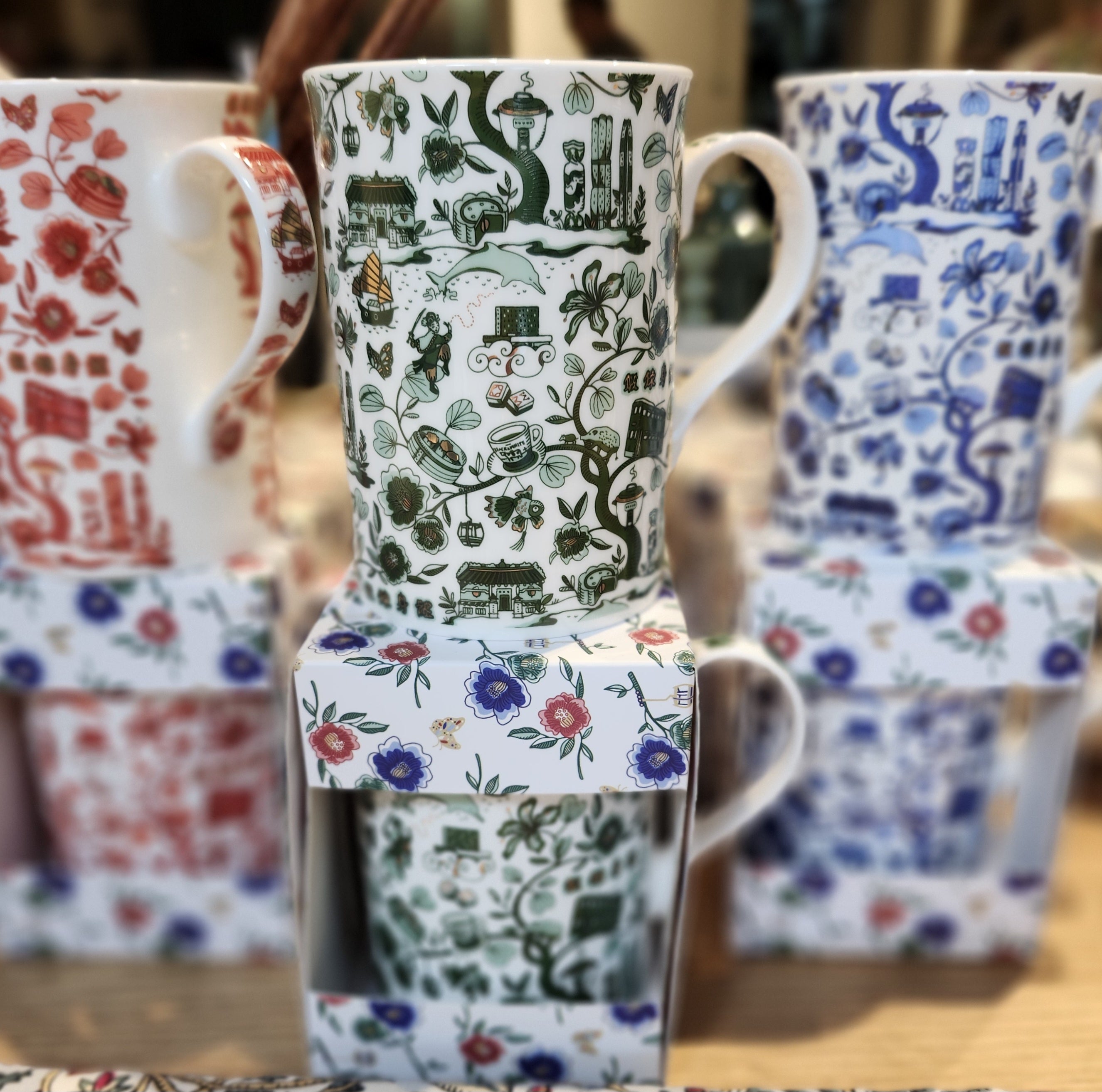 Jesse’s original design centres on an overall floral repeat pattern featuring Hong Kong’s native flora and fauna, bauhinias and camellias, butterflies, wild boar and dolphins. It embodies modern and traditional motifs including dim sum, moon cake, a tram, a cable car, a kung fu fighter, rabbit sweet, the iconic tram and much more have been delightfully incorporated into this classic design.