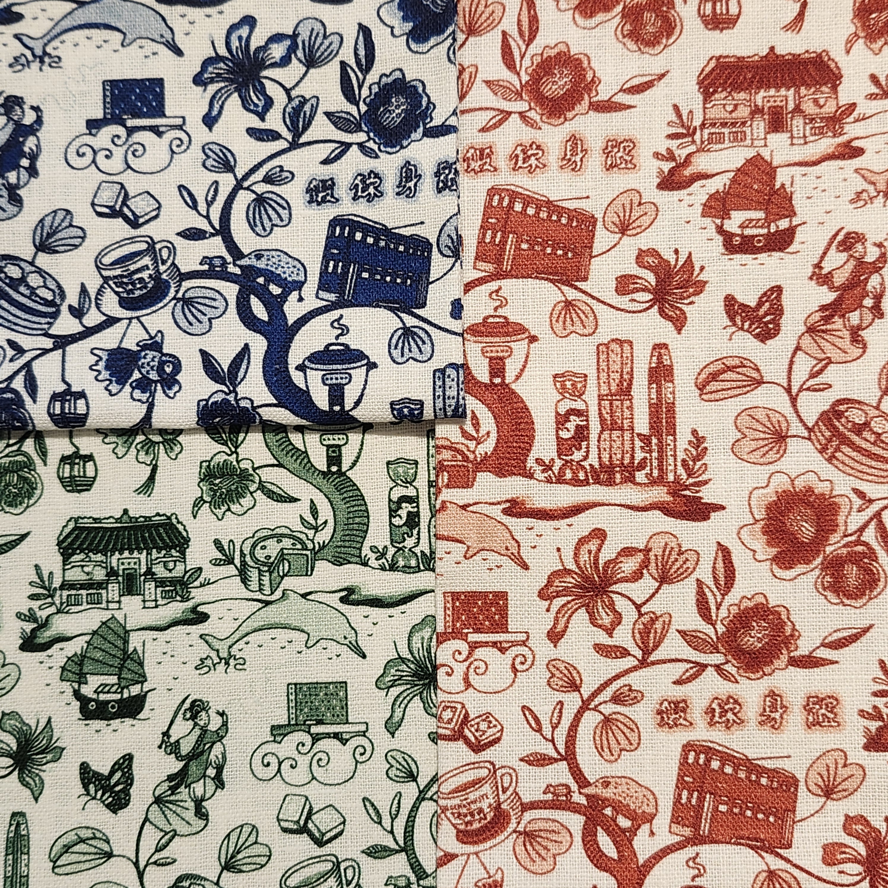 Mariko Jesse’s original design centres on an overall floral repeat pattern featuring Hong Kong’s native flora and fauna, bauhinias and camellias, butterflies, wild boar and dolphins. It embodies modern and traditional motifs including dim sum, moon cake, a tram, a cable car, a kung fu fighter, rabbit sweet, the iconic tram and much more have been delightfully incorporated into this classic design.