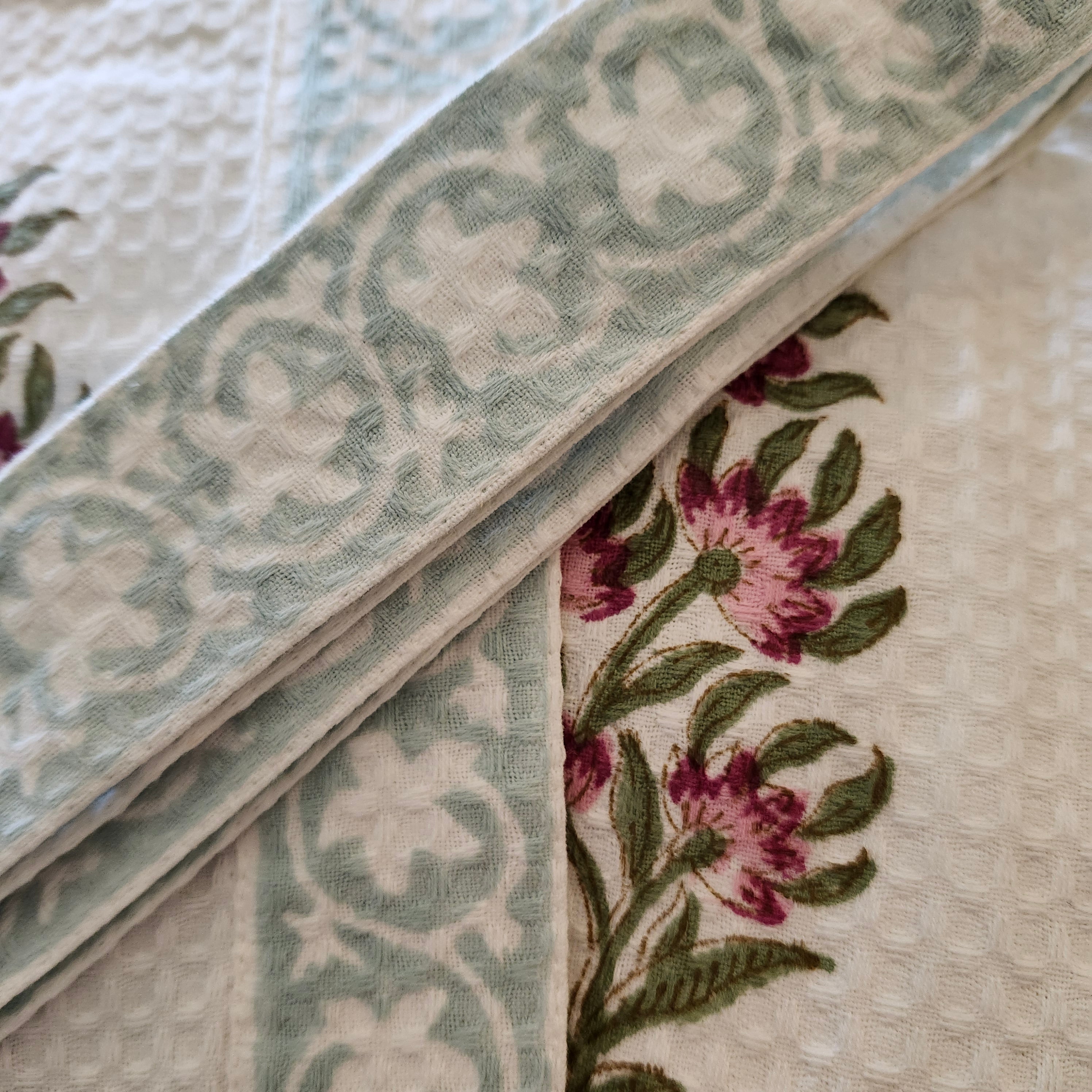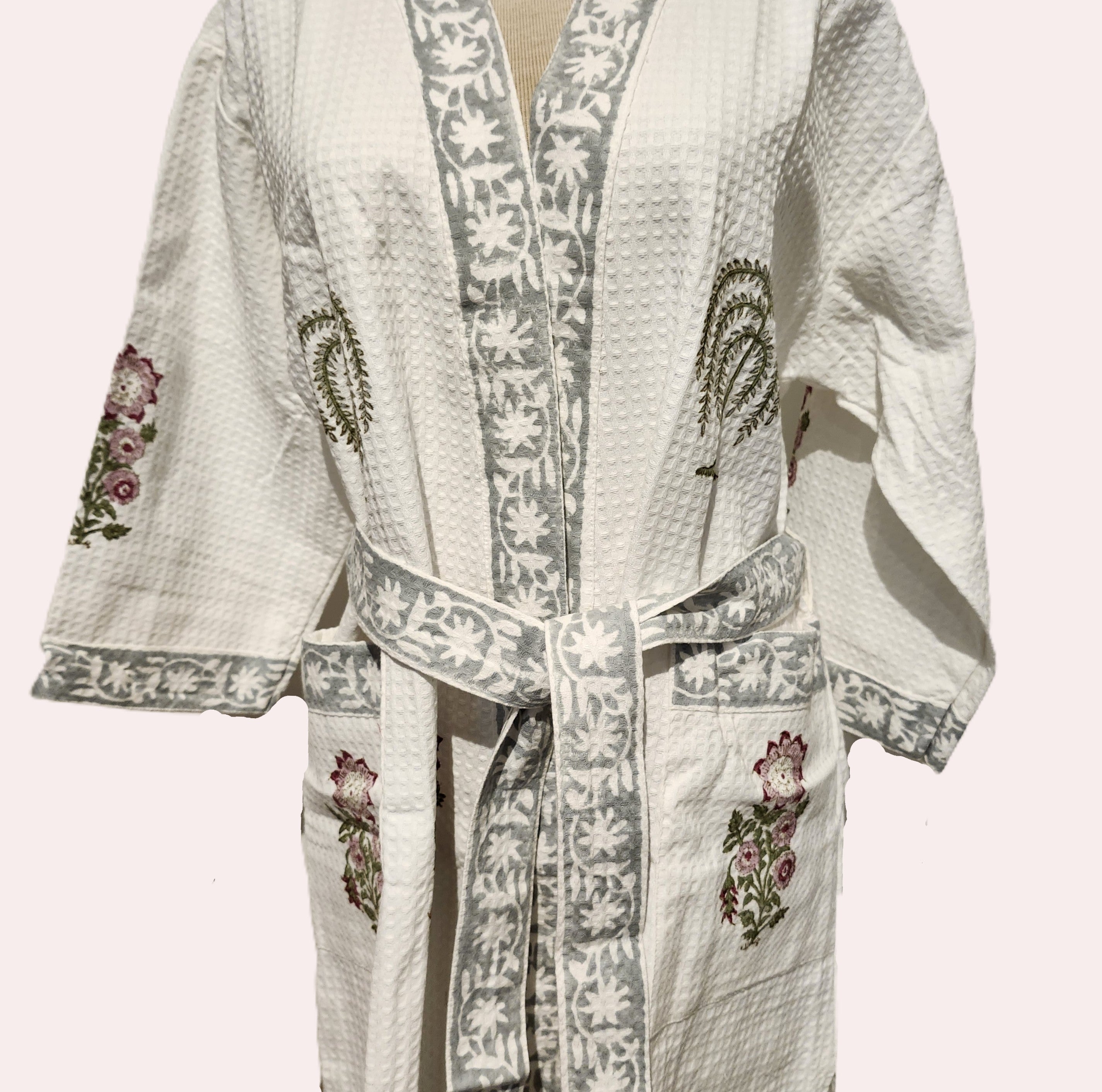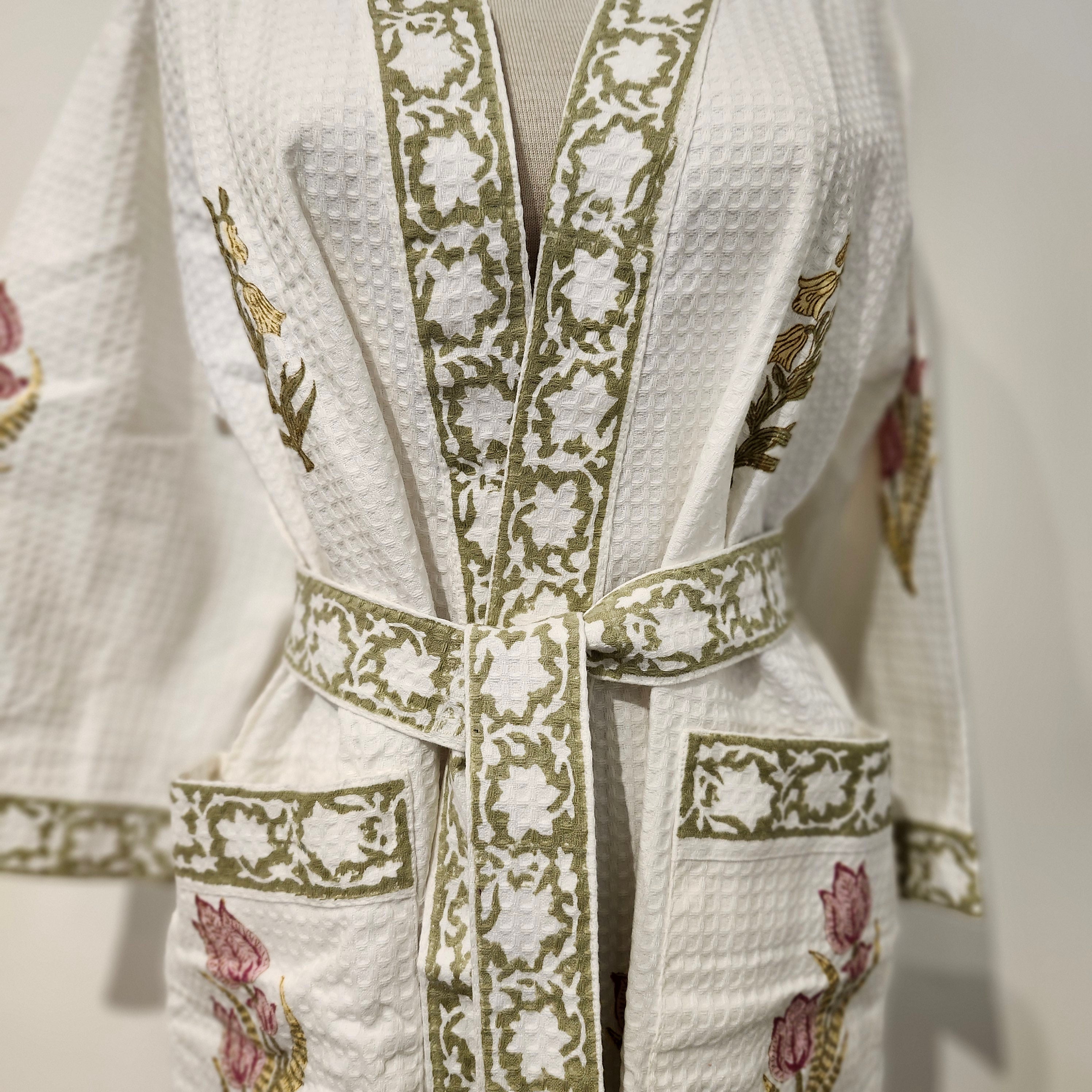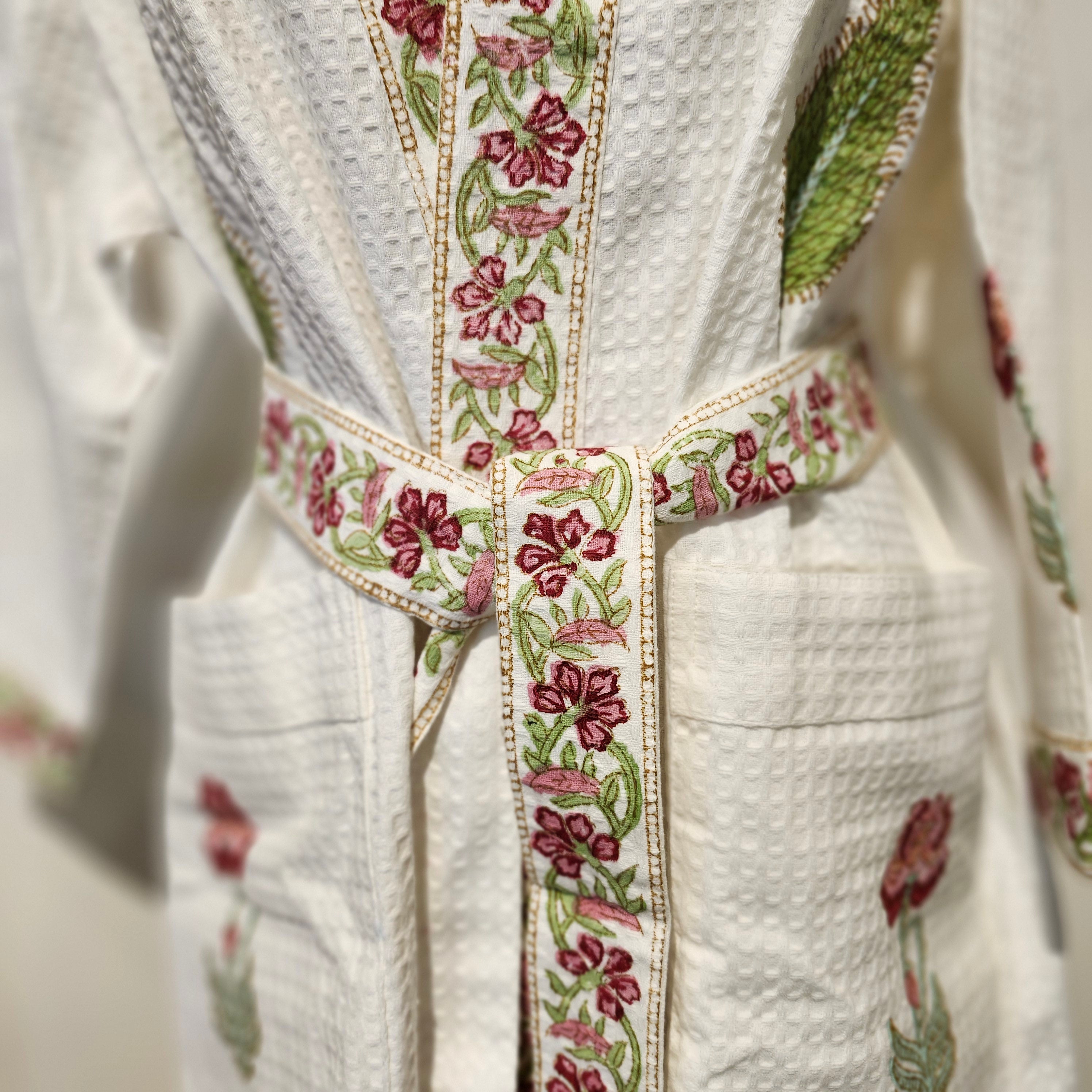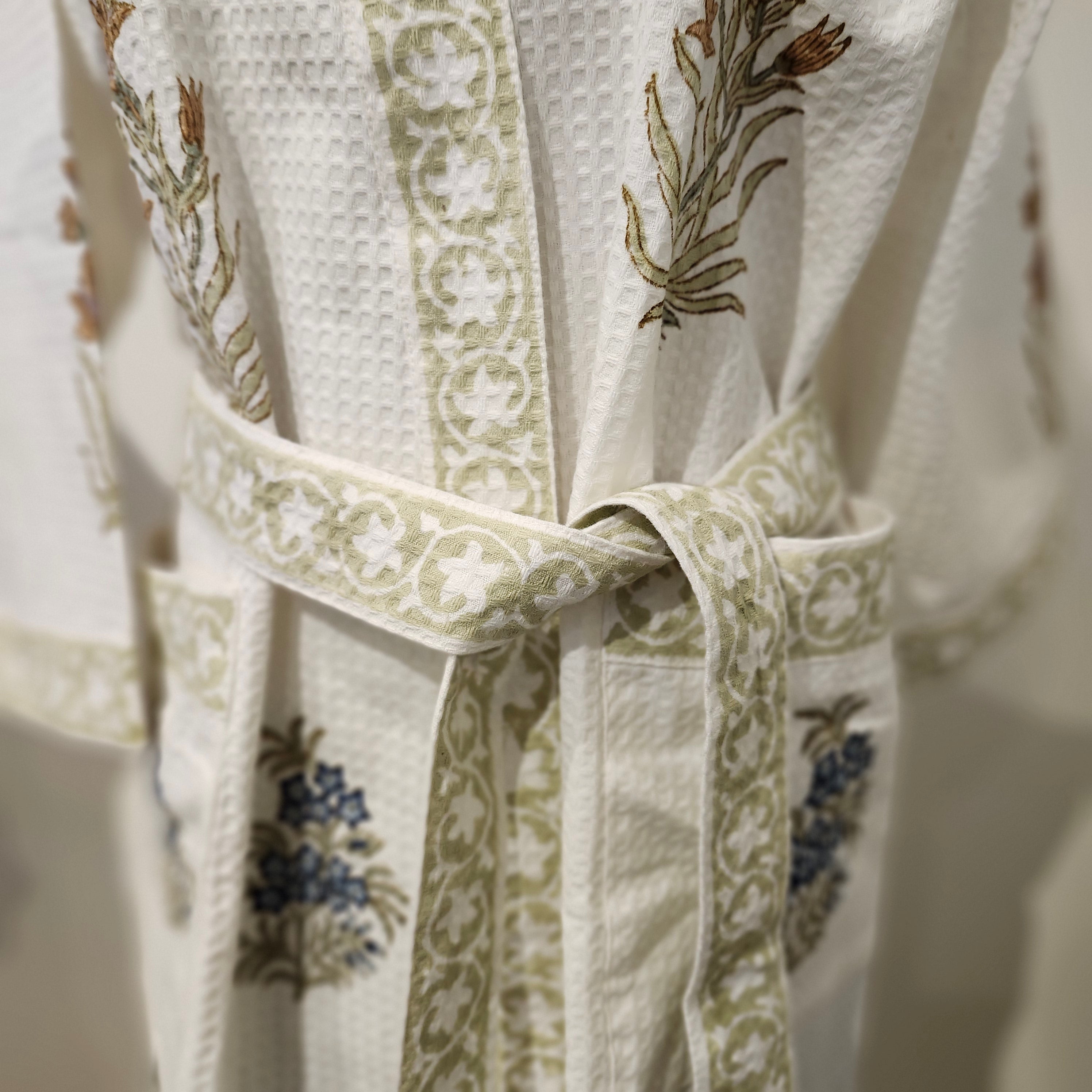 This waffle bathrobe is lightweight, ultra-soft and will dry quickly. Each piece has a delicate block print pattern, with a contrasting trim and belt, and two large pockets. At 110cm it is shorter than our block print robes, and the sides have a slit.