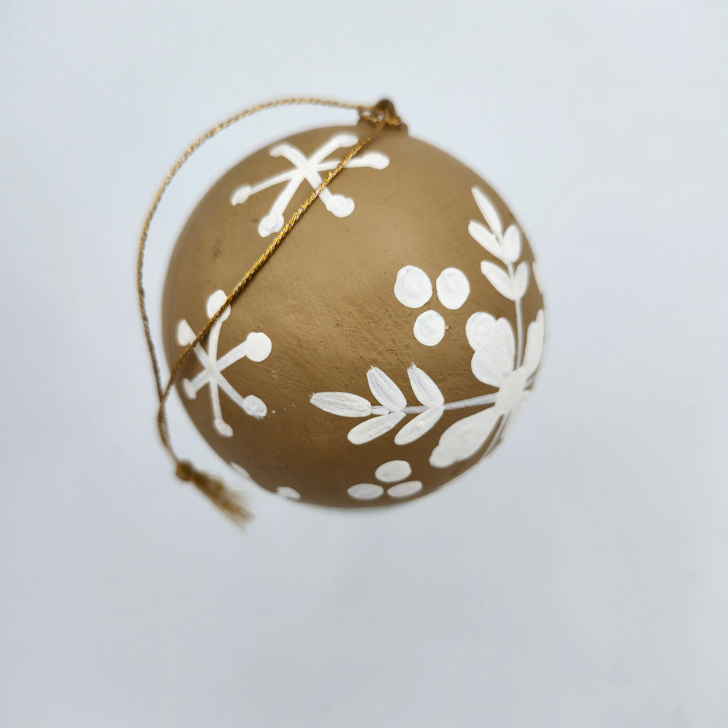 Handmade from papier mache in Kashmir, these delightful Christmas decorations have been individually hand-painted with a snowflake desgin on a ntaural background and finished with a matte varnish. Each has a plain gold thread with a small tassel for hanging.