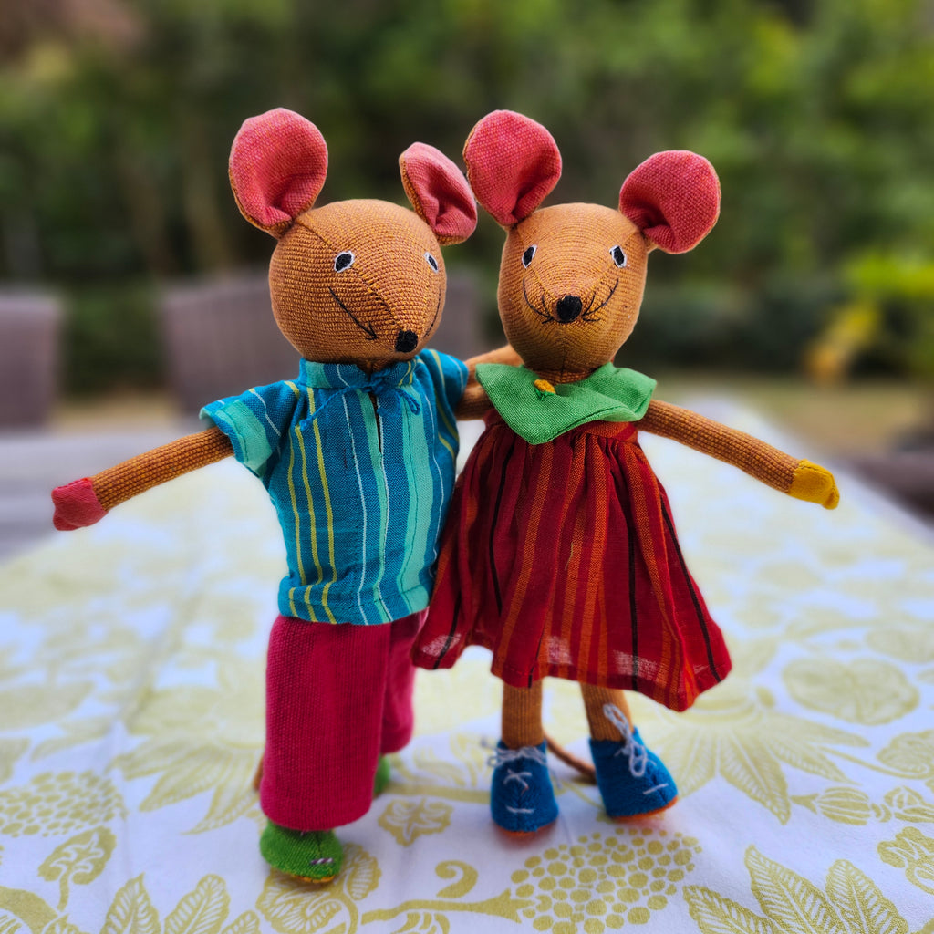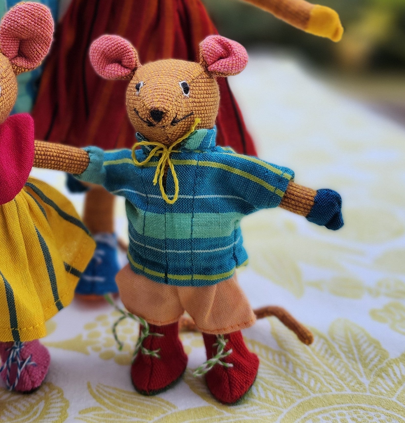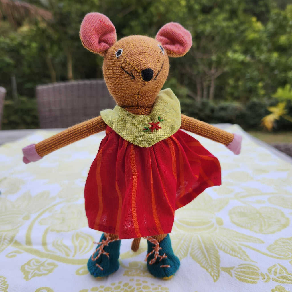 These adorable mice are all made by hand from handwoven fabric. Each one is different, and all of them are wearing colourful clothes and boots, giving them their own charm and character. No artificial fibres.